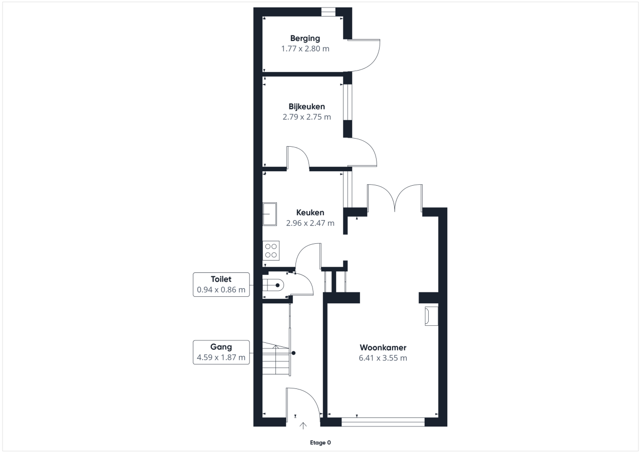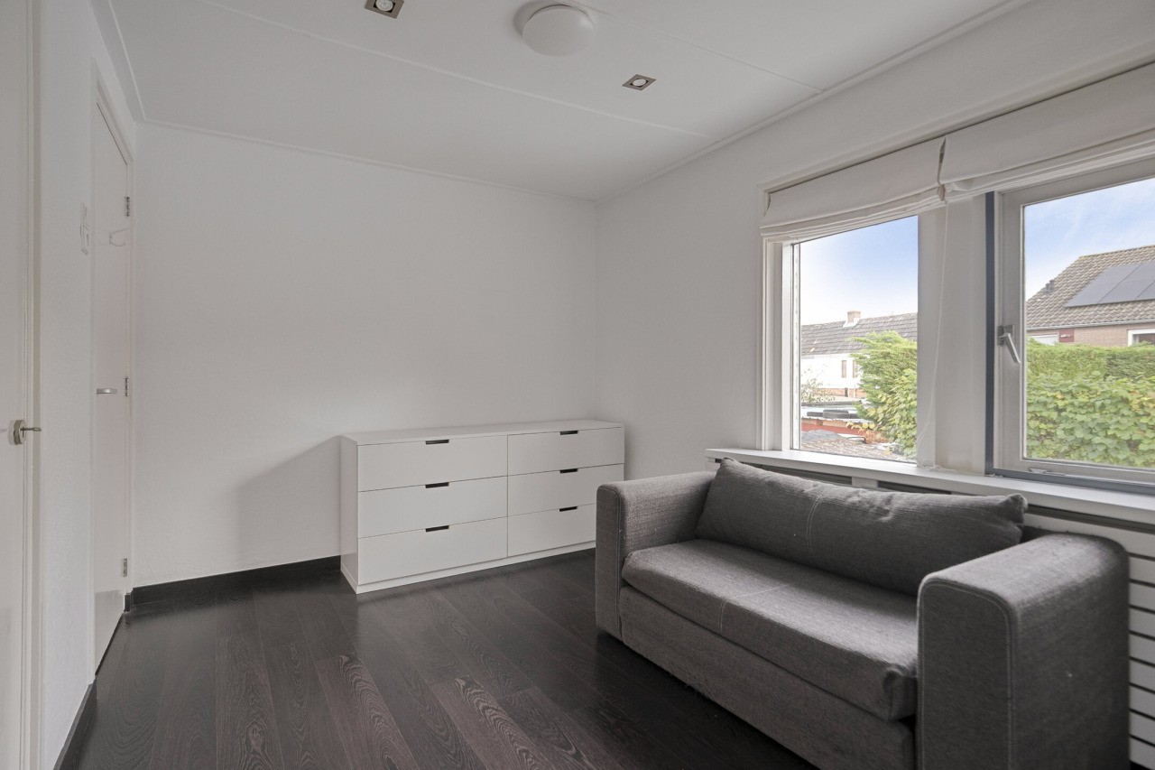Binnen valt meteen de lichtinval in de doorzonwoonkamer op. De woonkamer met donkere laminaatvloer loopt door naar de keuken, waar een 4-pits gasfornuis, oven en koelkast klaarstaan. Aansluitend is er een praktische bijkeuken voor de wasmachine, droger en cv-ketel, met een deur naar het terras en de tuin. De trap in de entreehal is netjes gerenoveerd en verdeelt de ruimte subtiel, waardoor alles luchtig en ruimtelijk blijft.