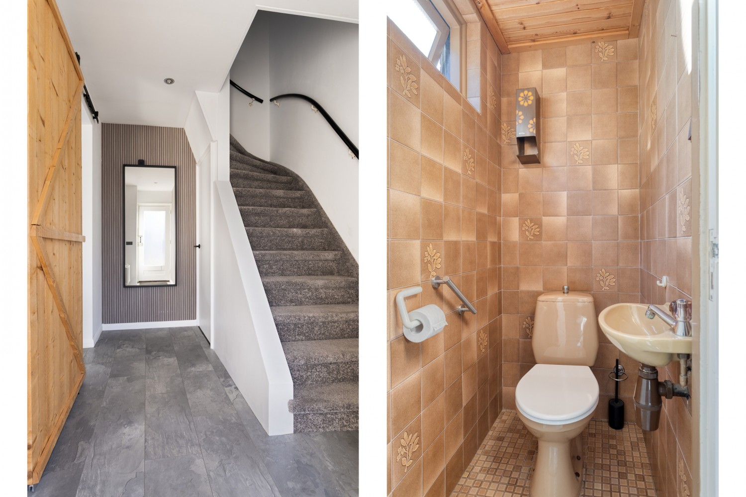 Bij binnenkomst stap je de hal binnen, die toegang biedt tot de trap naar de eerste verdieping, een provisiekast, het toilet en de meterkast. Vanuit de hal loop je door naar de lichte doorzonkamer, waar grote ramen zorgen voor veel daglicht en de haard voor een warme, gezellige sfeer in de wintermaanden. De moderne open keuken in hoekopstelling is uitgerust met diverse inbouwapparatuur en biedt een fijne plek om te koken, terwijl je vanuit de keuken direct contact hebt met de tuin.