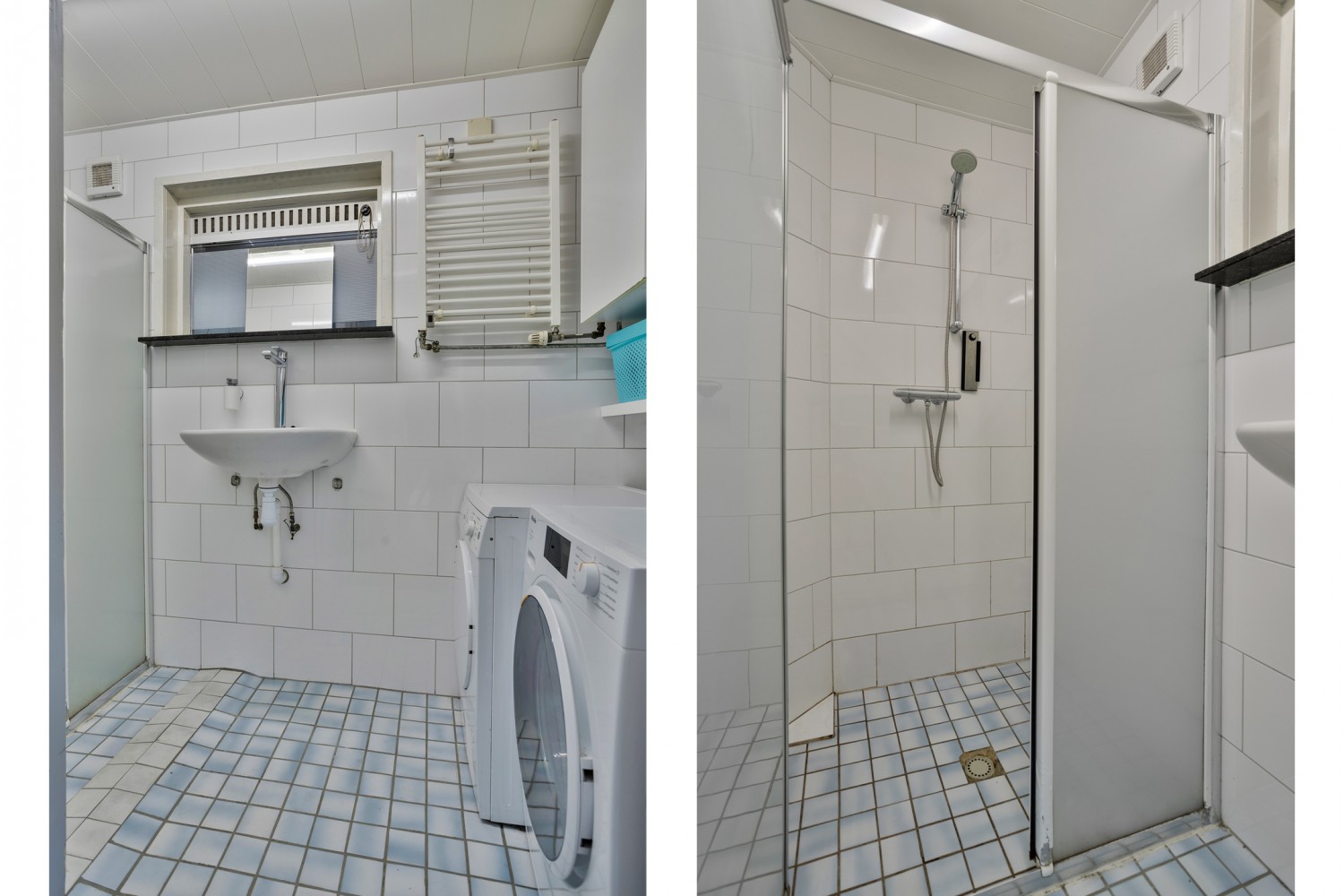 Bij binnenkomst tref je de hal met meterkast, toilet met fonteintje en toegang tot de keuken en woonkamer. De lichte woonkamer met gezellige haard nodigt uit om te ontspannen en geeft toegang tot de trap naar de verdieping. De woonkeuken is van alle gemakken voorzien met inbouwapparatuur, inclusief Quooker, en grote raampartijen die prachtig uitzicht geven op de tuin. Vanuit de keuken kom je bij de badkamer, uitgerust met douche, wastafel en witgoedaansluiting, en bij de provisiekast voor extra opbergruimte.