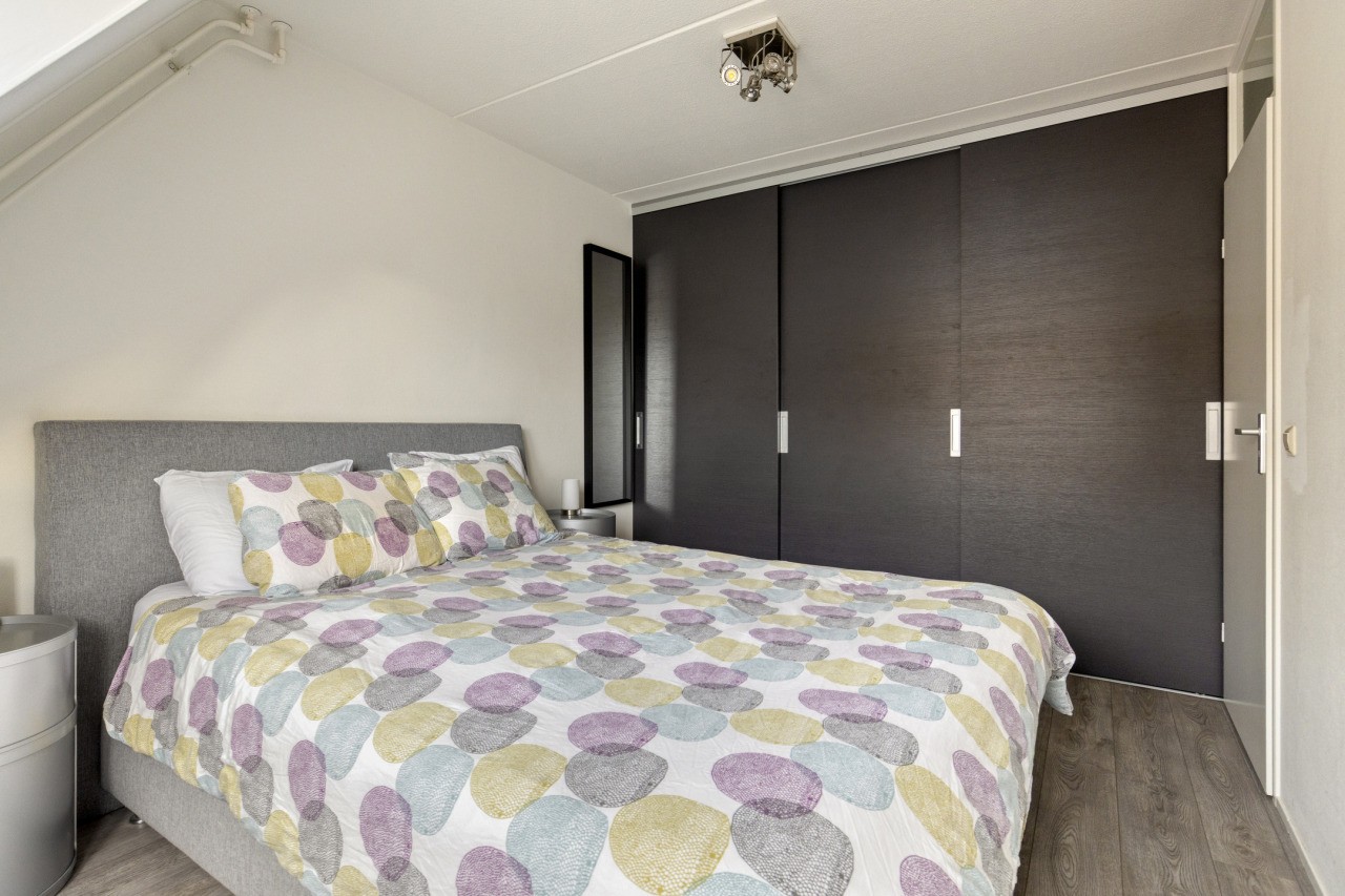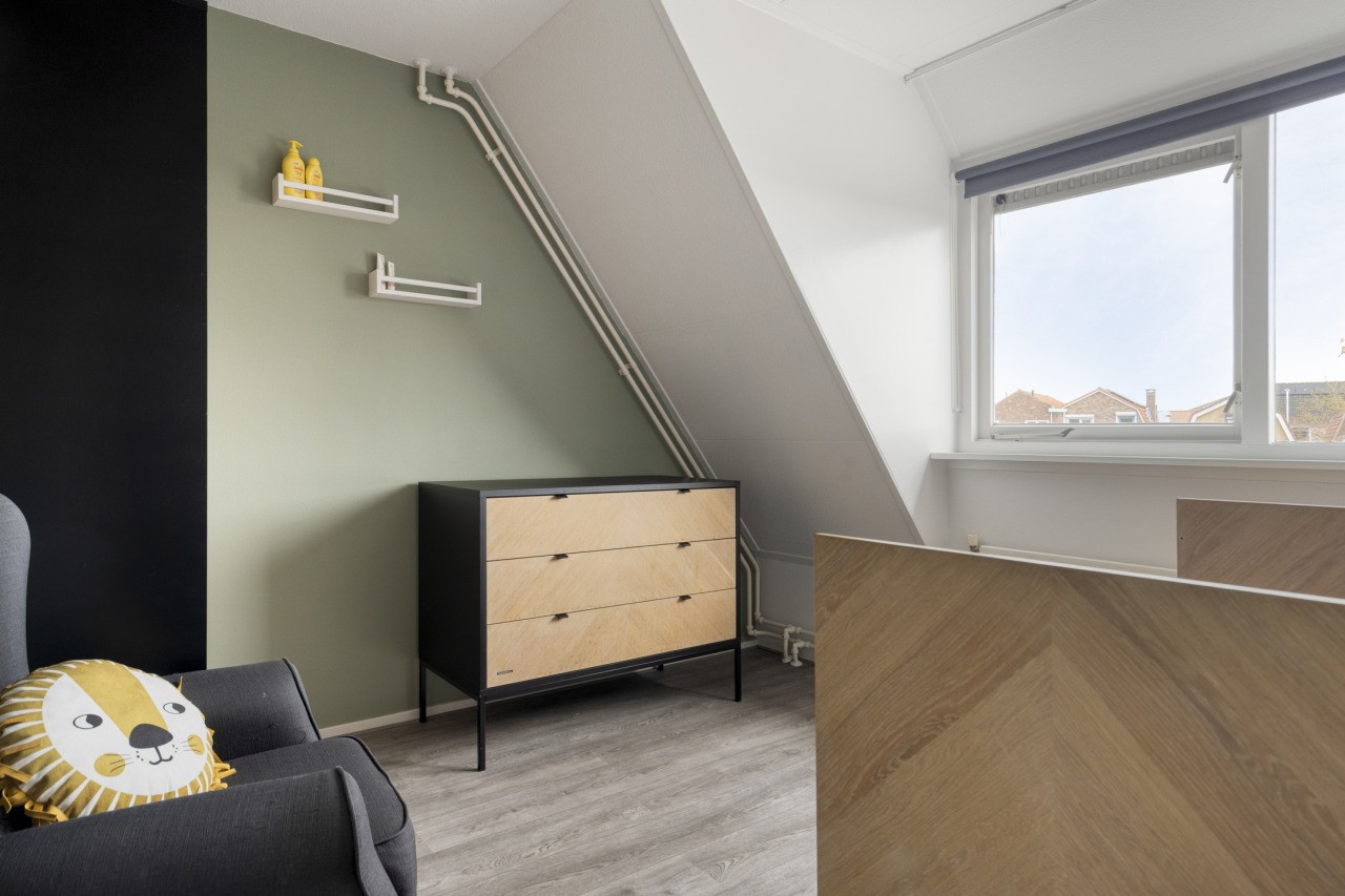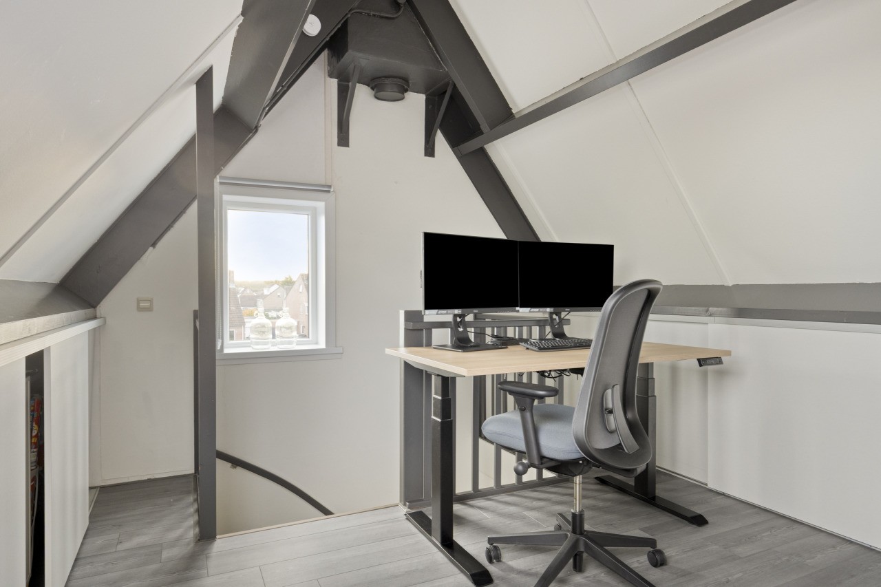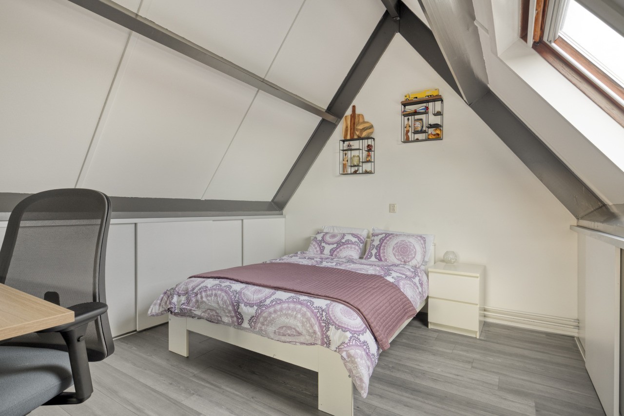 De tweede verdieping biedt een verrassend ruime zolderkamer met een Velux-dakraam. Deze ruimte kan uitstekend dienen als extra slaapkamer, werkruimte of speelzolder voor de kinderen. Achter de knieschotten is veel bergruimte aanwezig, zodat alles netjes uit het zicht opgeborgen kan worden.