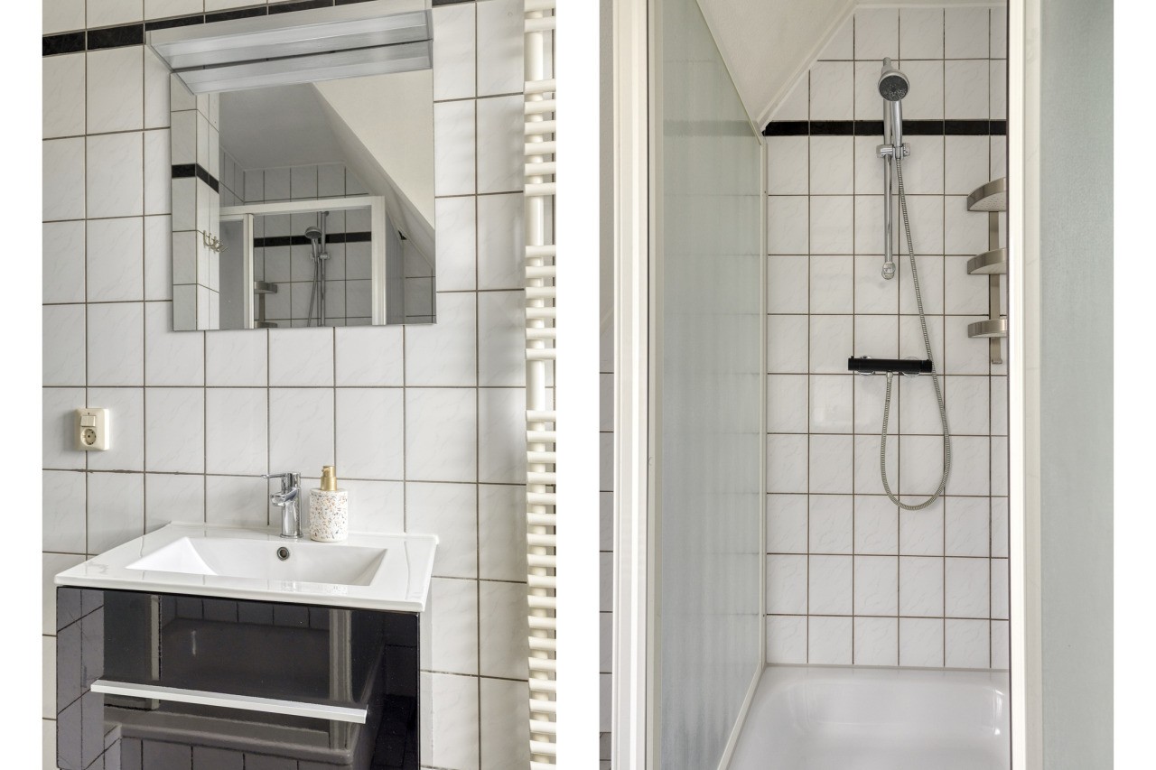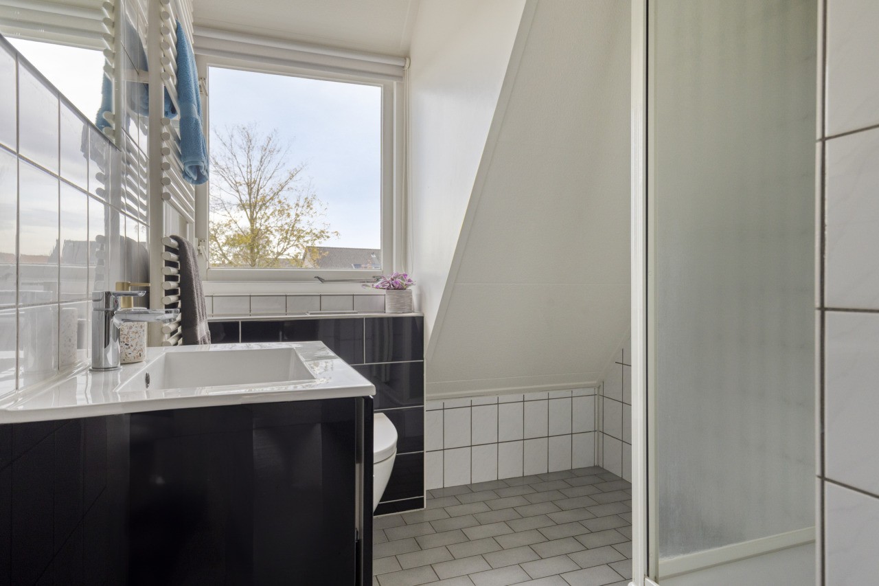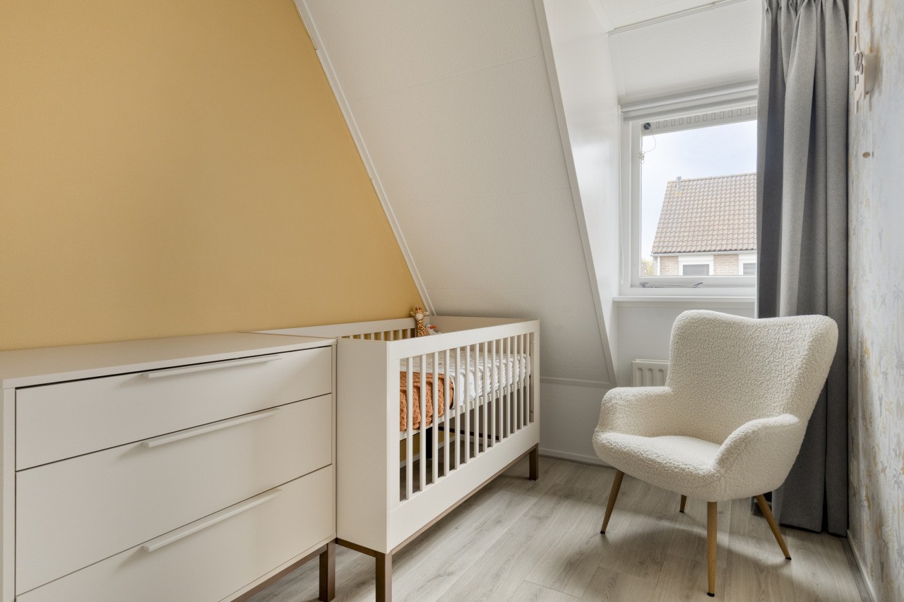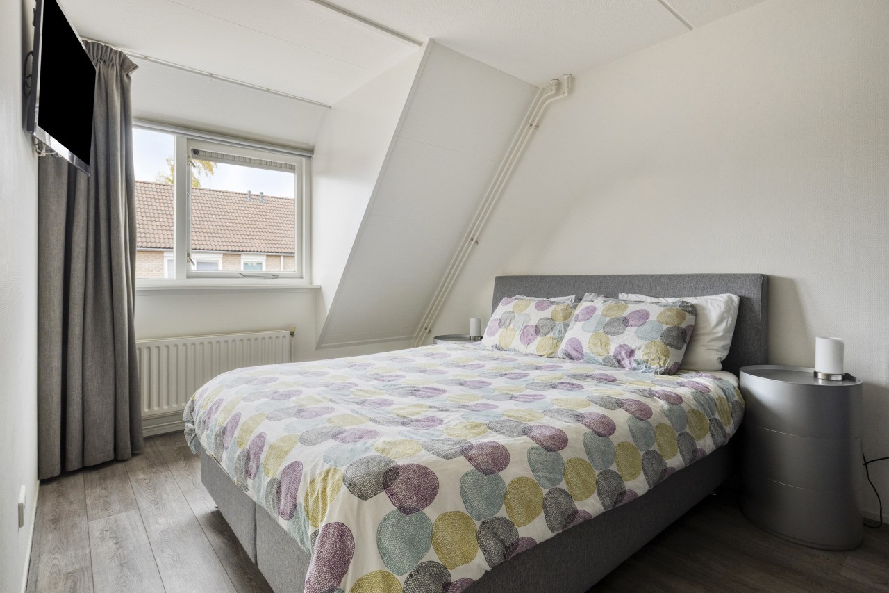 De tweede verdieping biedt een verrassend ruime zolderkamer met een Velux-dakraam. Deze ruimte kan uitstekend dienen als extra slaapkamer, werkruimte of speelzolder voor de kinderen. Achter de knieschotten is veel bergruimte aanwezig, zodat alles netjes uit het zicht opgeborgen kan worden.