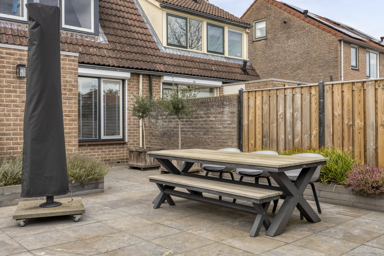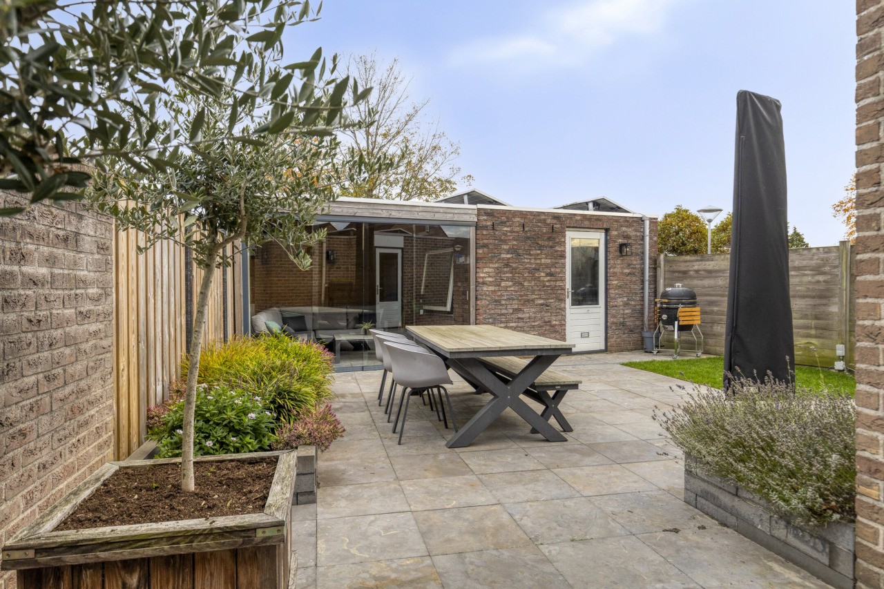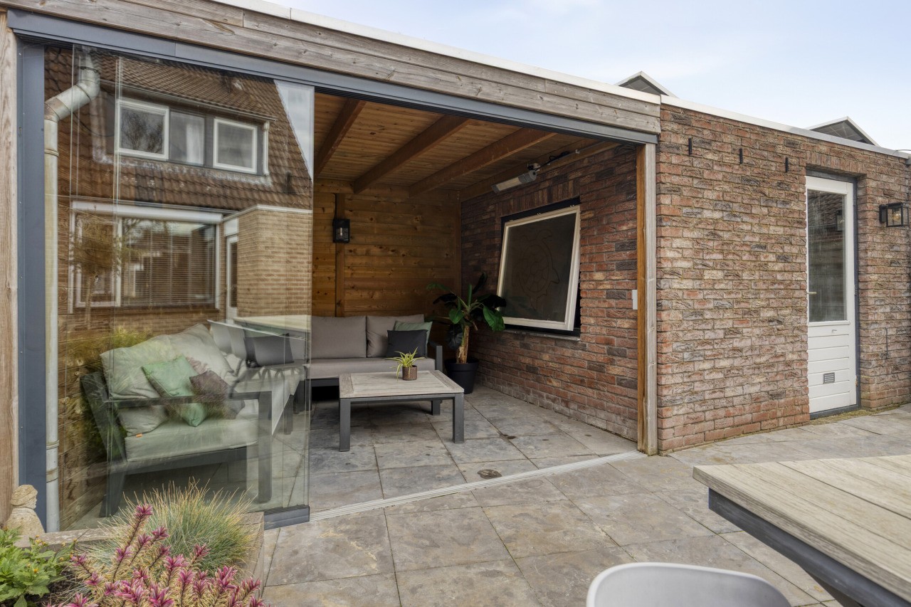 De achtertuin is met zorg aangelegd en ligt op het oosten, waardoor je ’s ochtends direct kunt genieten van de eerste zonnestralen. Het terras nodigt uit tot gezellig buiten eten of ontspannen in het weekend, terwijl het gazon zorgt voor een groene, frisse uitstraling. Achterin de tuin staat een berging met een prachtige overkapping, die afsluitbaar is met een glazen wand – ideaal voor lange zomeravonden of knusse herfstdagen.