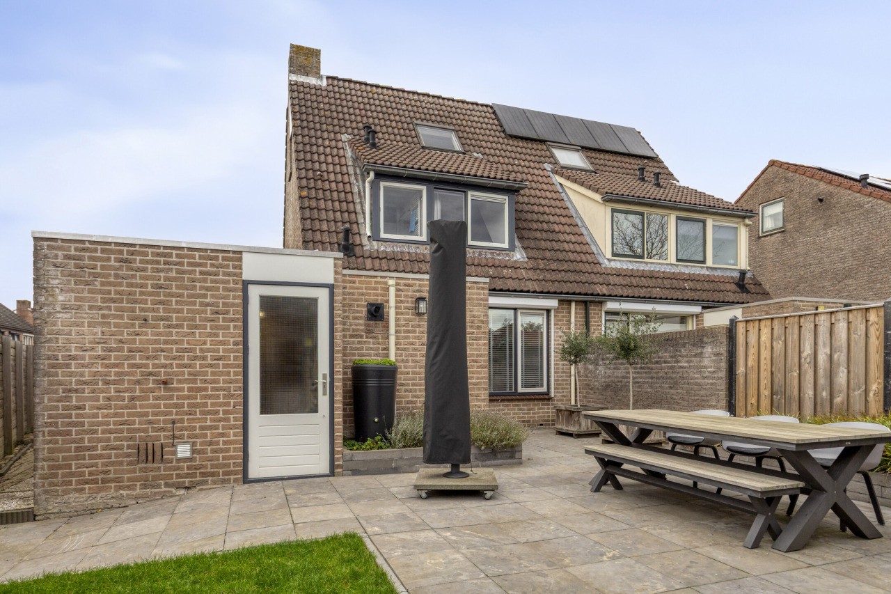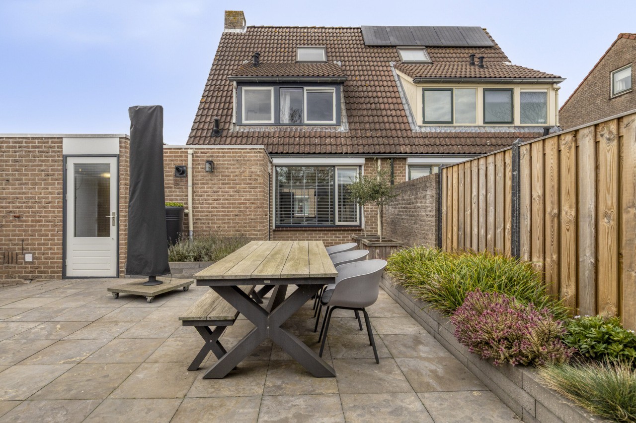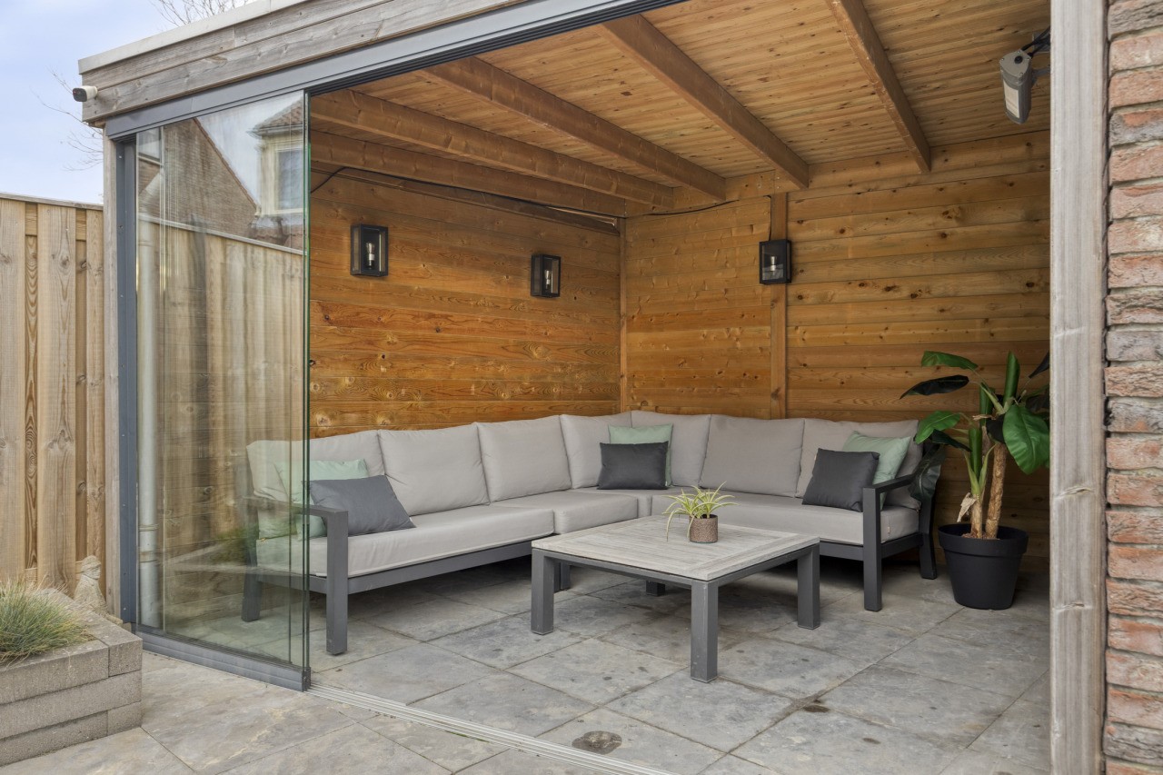 De achtertuin is met zorg aangelegd en ligt op het oosten, waardoor je ’s ochtends direct kunt genieten van de eerste zonnestralen. Het terras nodigt uit tot gezellig buiten eten of ontspannen in het weekend, terwijl het gazon zorgt voor een groene, frisse uitstraling. Achterin de tuin staat een berging met een prachtige overkapping, die afsluitbaar is met een glazen wand – ideaal voor lange zomeravonden of knusse herfstdagen.