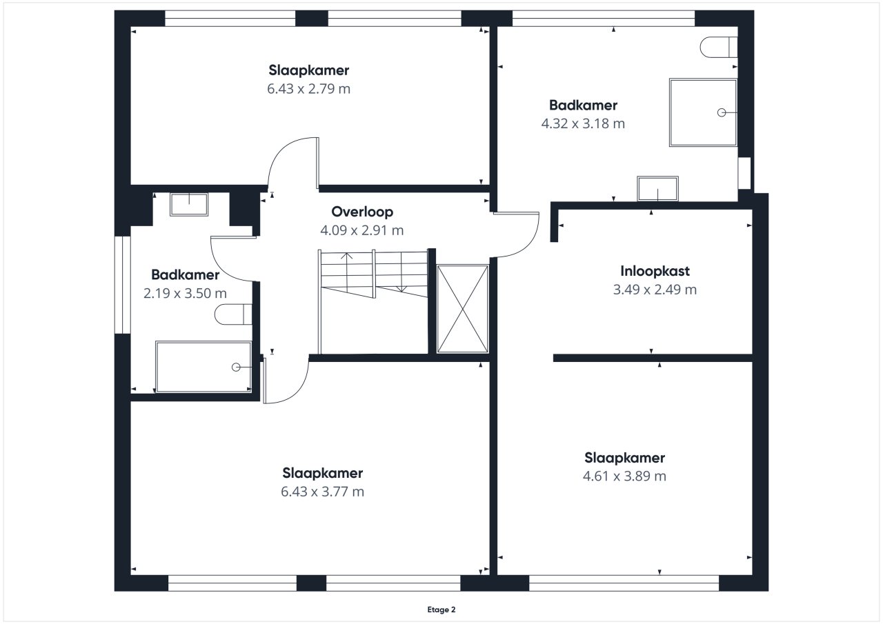 Op de eerste verdieping bevinden zich drie slaapkamers, stuk voor stuk voorzien van airconditioning. De hoofdslaapkamer beschikt over een ruime inloopkast en een luxe ensuite badkamer met inloopdouche, wastafelmeubel en toilet. De tweede badkamer, bereikbaar vanaf de overloop, is eveneens stijlvol afgewerkt en voorzien van een inloopdouche, toilet en wastafelmeubel.