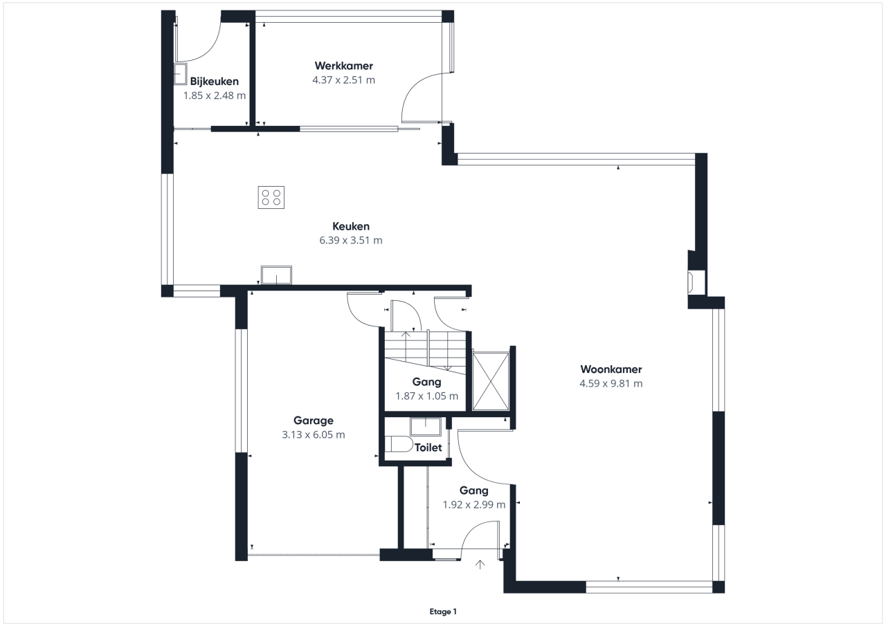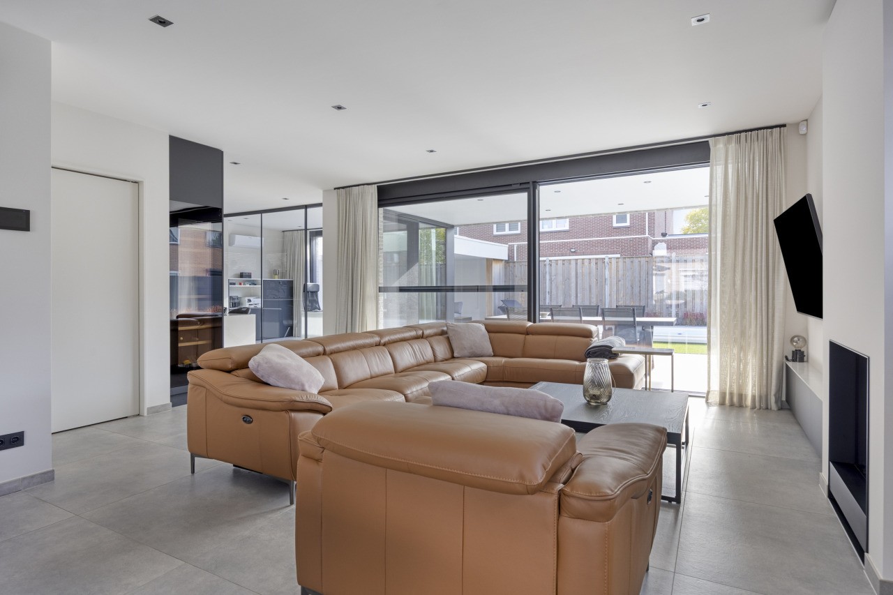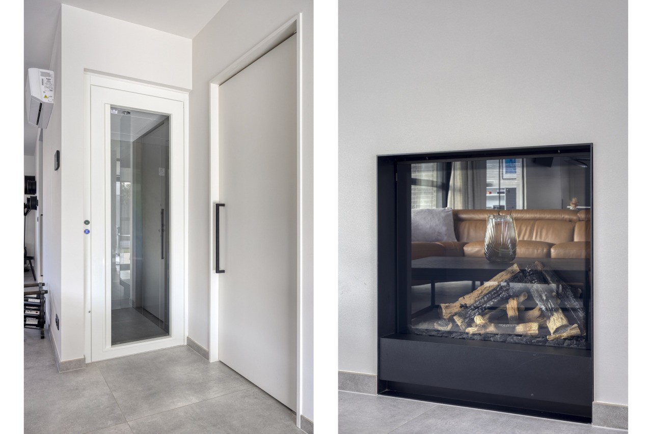 Via de hal met toilet, fonteintje, alarminstallatie en kastenwand kom je binnen in de ruime woonkamer. De eethoek bevindt zich aan de voorzijde, terwijl de tuingerichte zithoek met haard uitnodigt tot ontspannen avonden. De grote schuifpui zorgt voor een vloeiende overgang naar buiten en laat het daglicht royaal binnenstromen. Vanuit de woonkamer bereik je zowel de lift als de trap naar de eerste verdieping en de inpandige garage, die is voorzien van een elektrische deur, meterkast én een laadpaal.