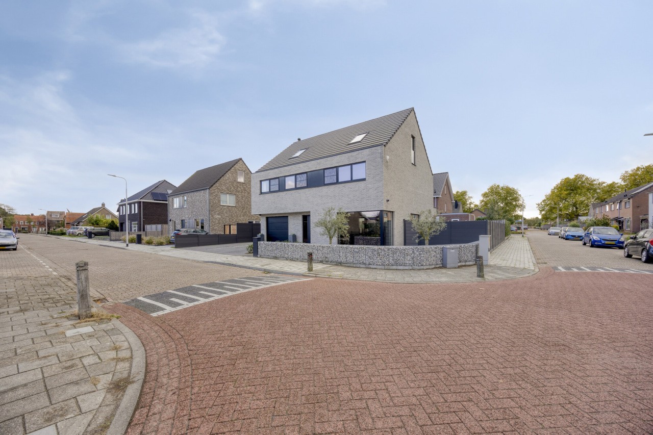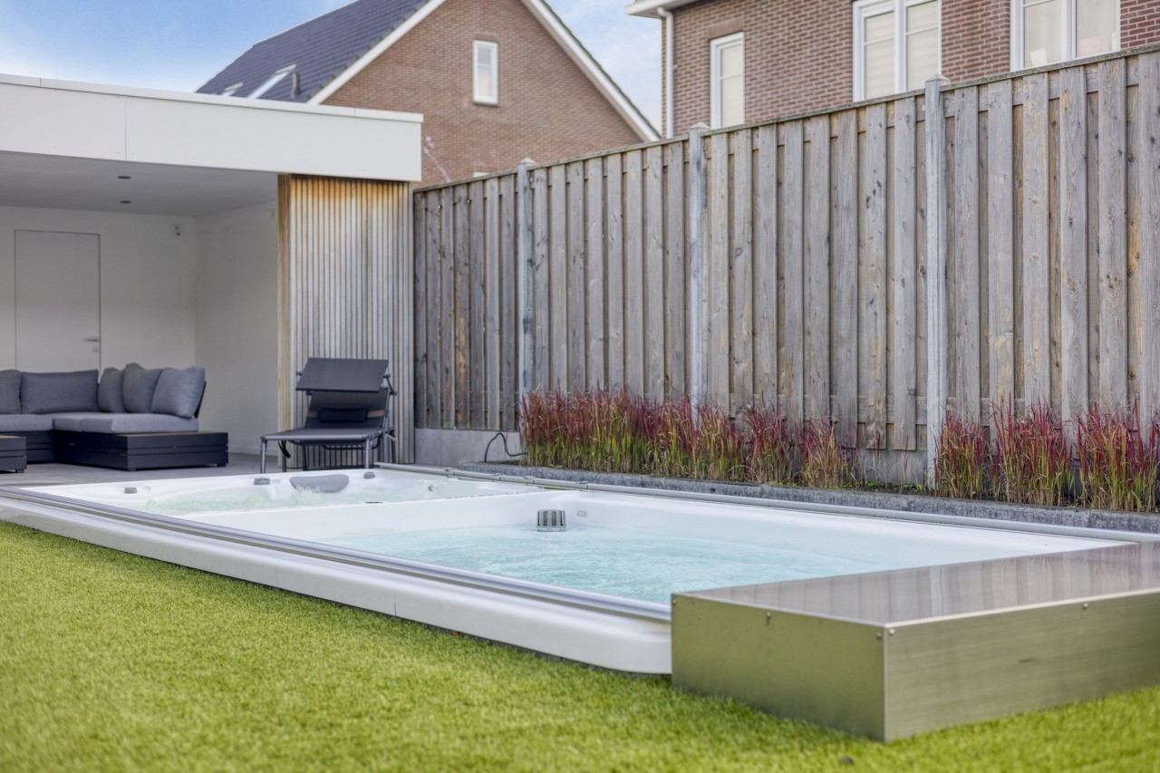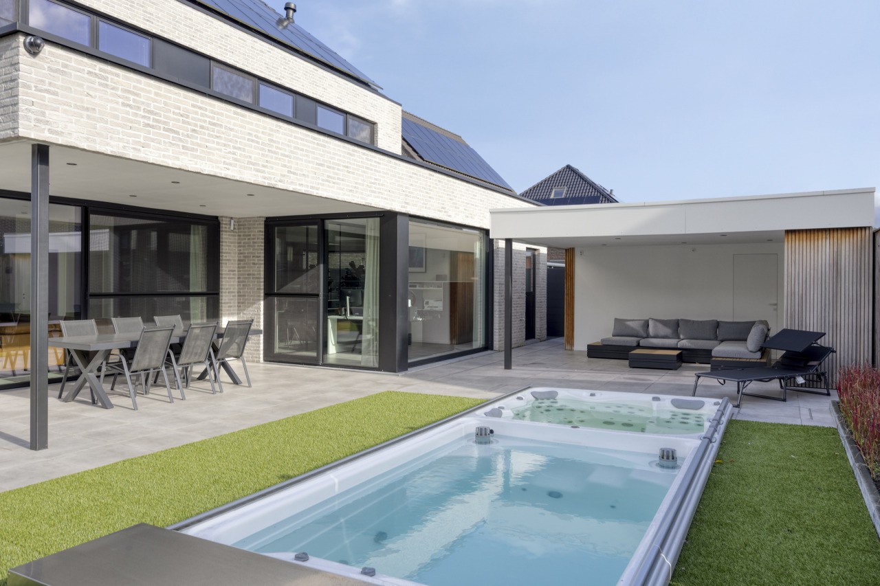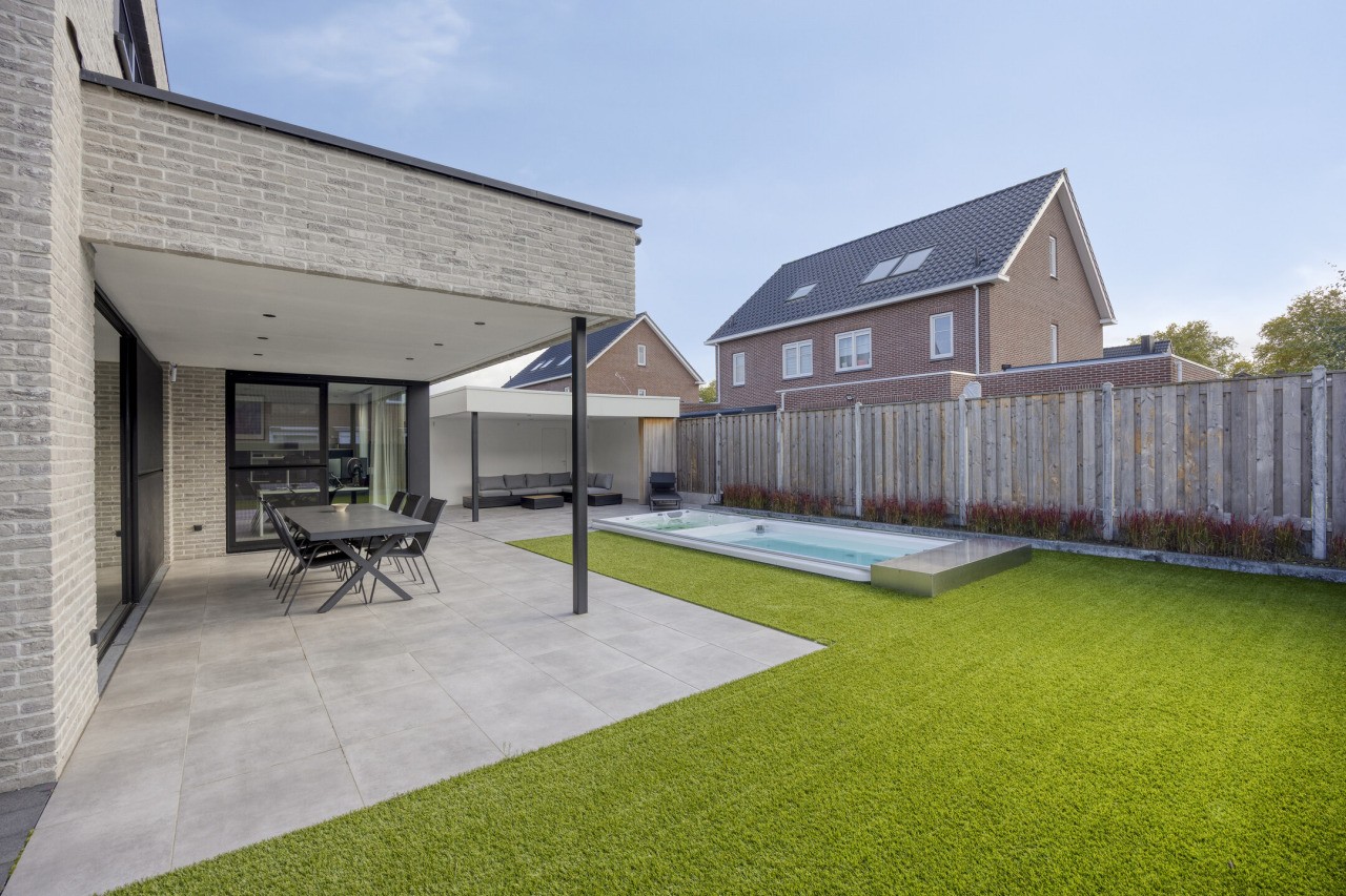 De tuin rondom de woning is met zorg aangelegd en straalt dezelfde luxe uit als het interieur. Een nette overkapping grenst direct aan de woning, ideaal voor lange zomeravonden. Achterin de tuin bevindt zich een tweede, overdekt terras met een extra toilet en fonteintje. Het zwembad met bubbelbad vormt het middelpunt van dit buitenverblijf, omringd door een strak gazon, verzorgde borders en een vrije achterom. Dankzij de ligging op het zuiden geniet je hier de hele dag van de zon.