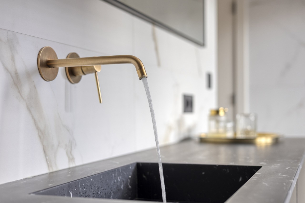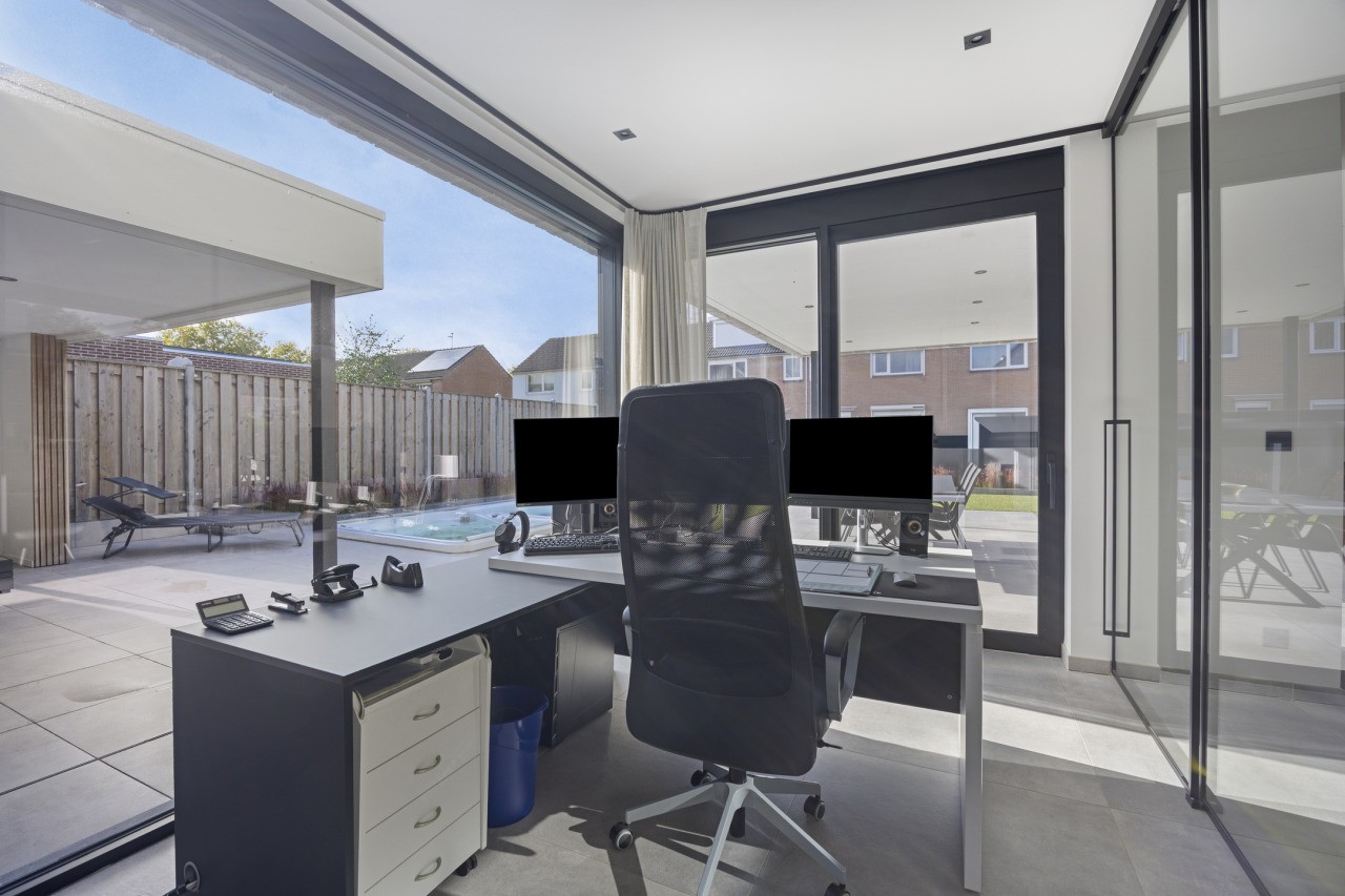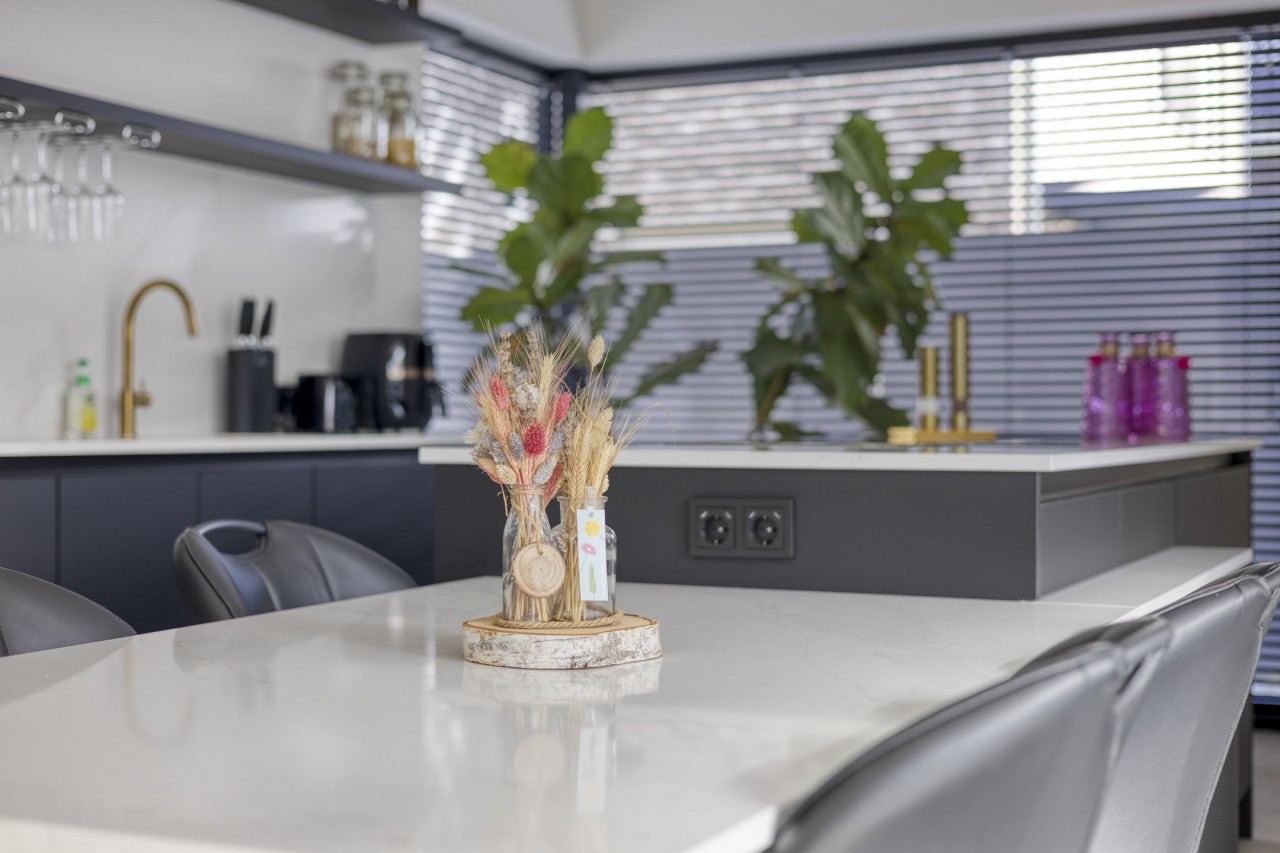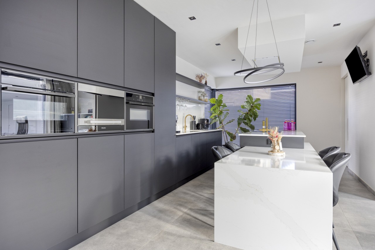 De open keuken vormt het hart van de woning: modern uitgevoerd in antraciet, met kookeiland en hoogwaardige inbouwapparatuur. Deze omvat een combi oven-magnetron, een aparte oven, een inbouw steamer en een klimaatkast. Aangrenzend ligt de bijkeuken met witgoedaansluiting, fonteintje en toegang tot de tuin. Achter de keuken bevindt zich bovendien een praktische werkkamer, eveneens met doorgang naar buiten.