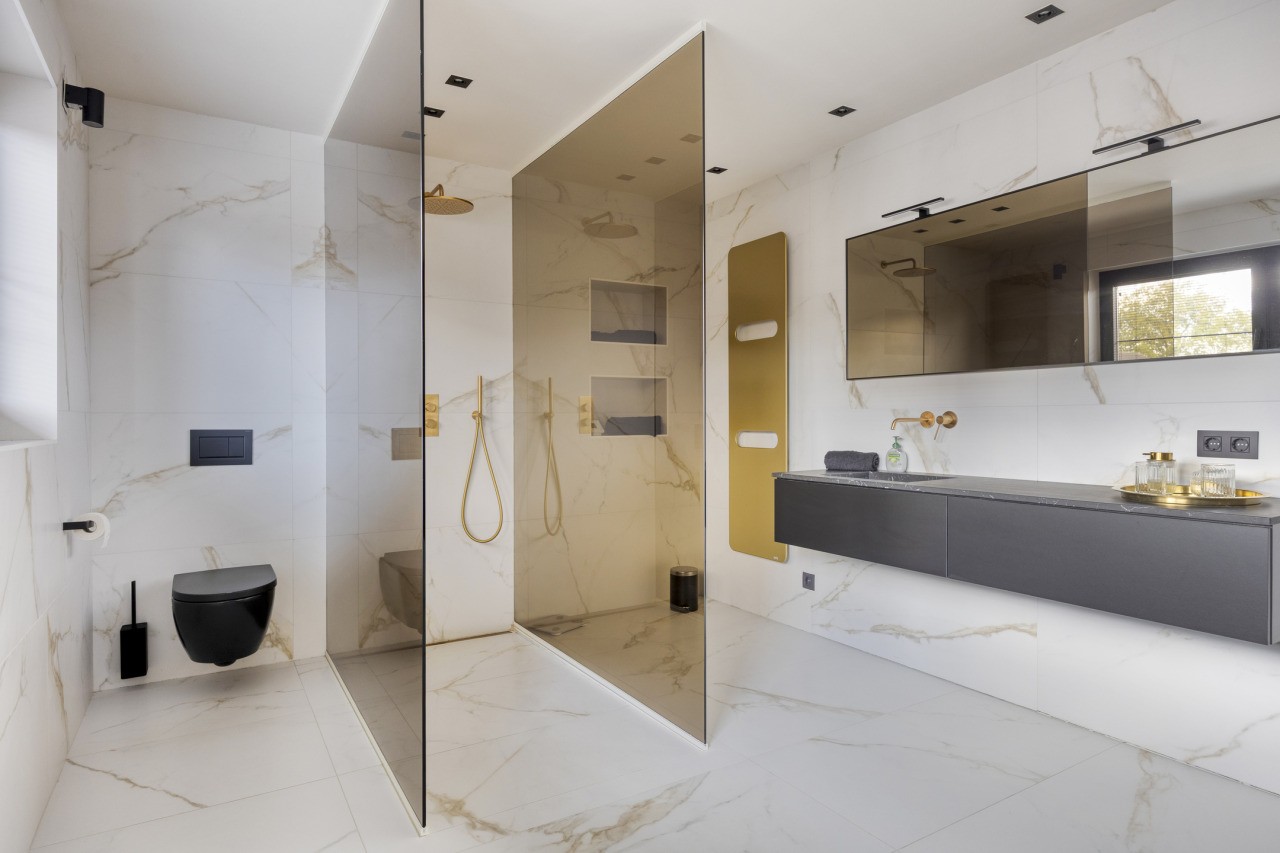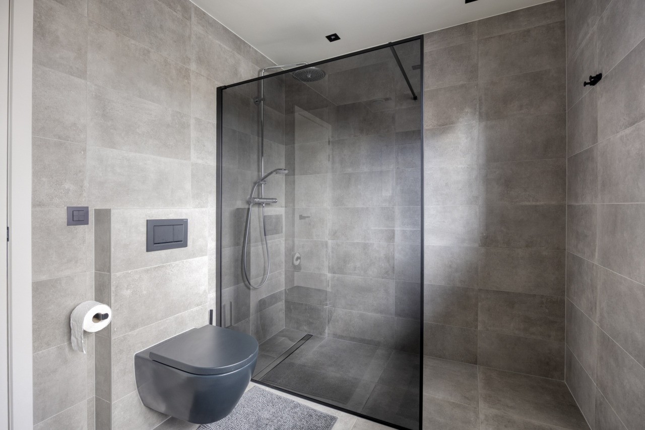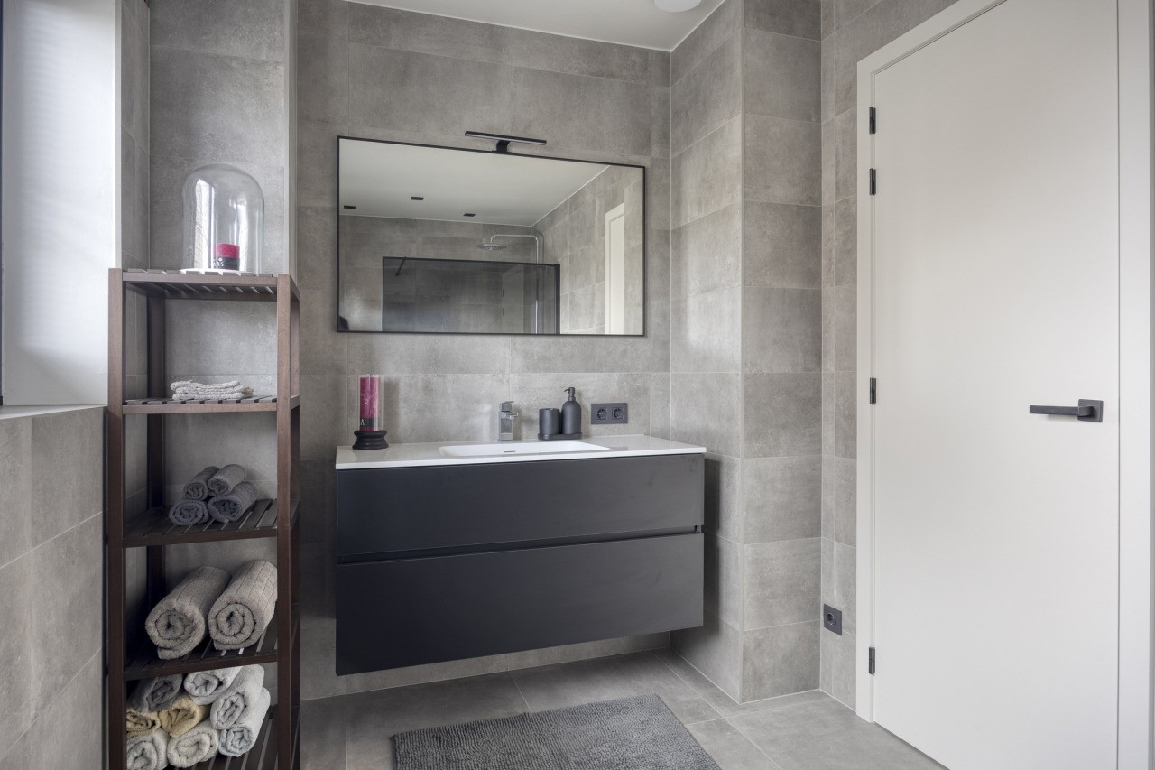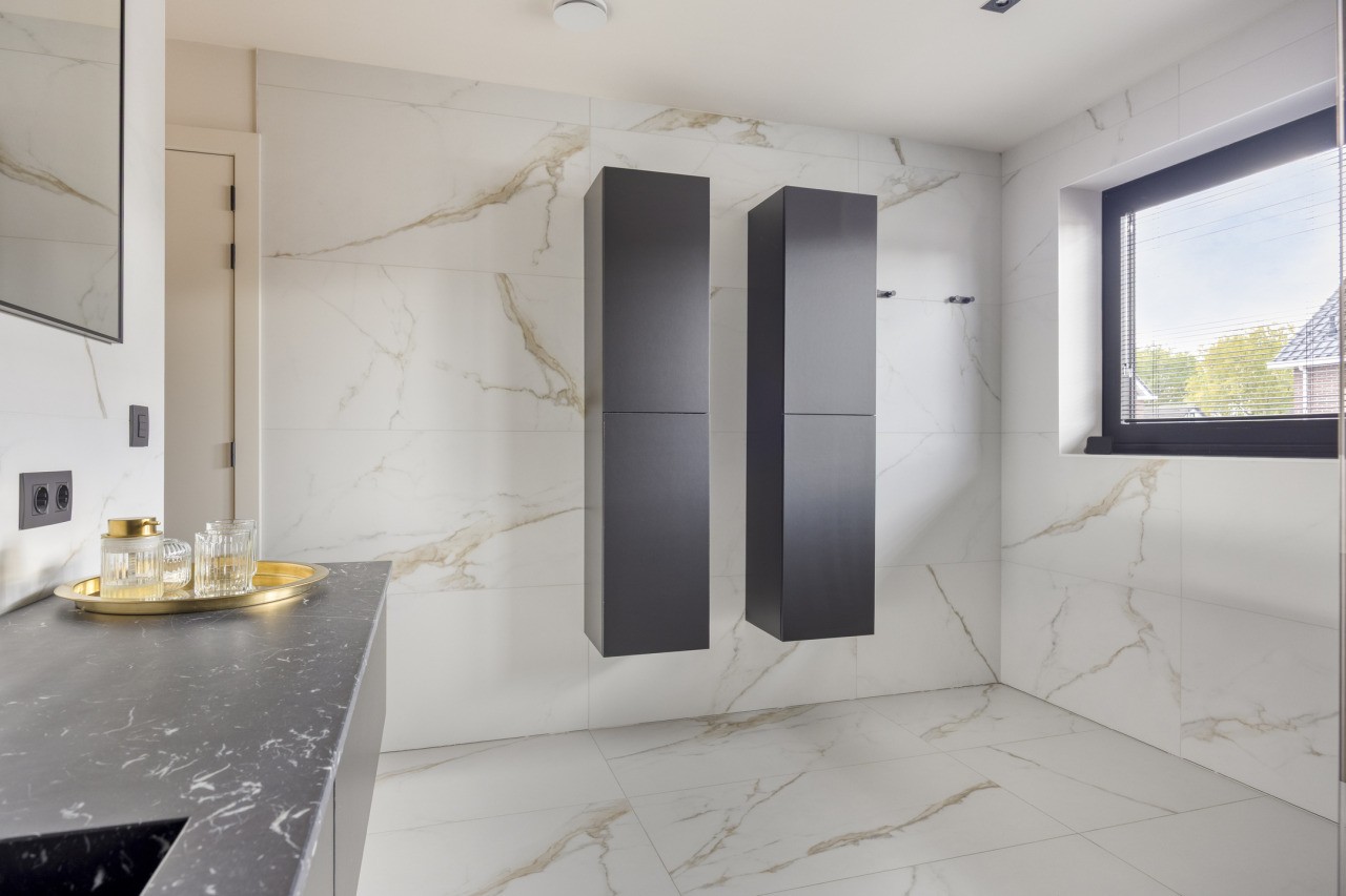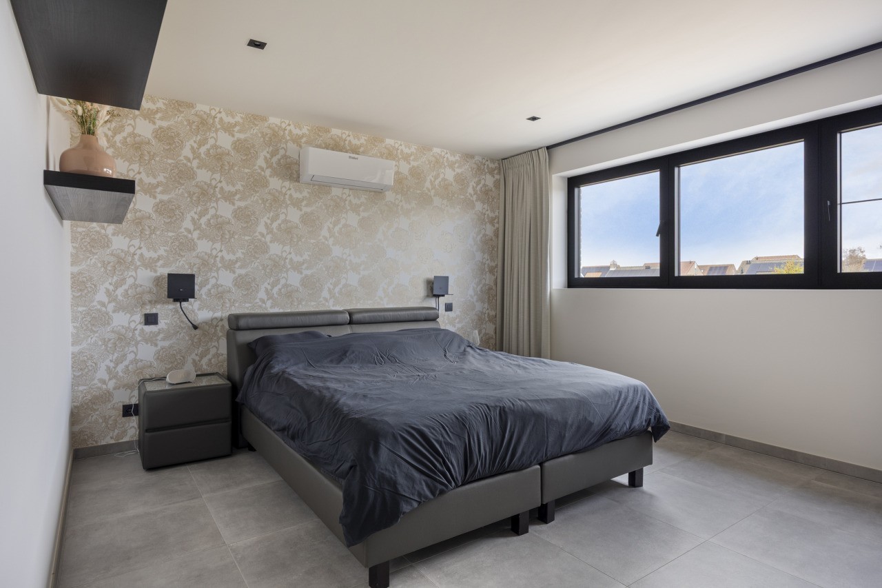 Op de eerste verdieping bevinden zich drie slaapkamers, stuk voor stuk voorzien van airconditioning. De hoofdslaapkamer beschikt over een ruime inloopkast en een luxe ensuite badkamer met inloopdouche, wastafelmeubel en toilet. De tweede badkamer, bereikbaar vanaf de overloop, is eveneens stijlvol afgewerkt en voorzien van een inloopdouche, toilet en wastafelmeubel.