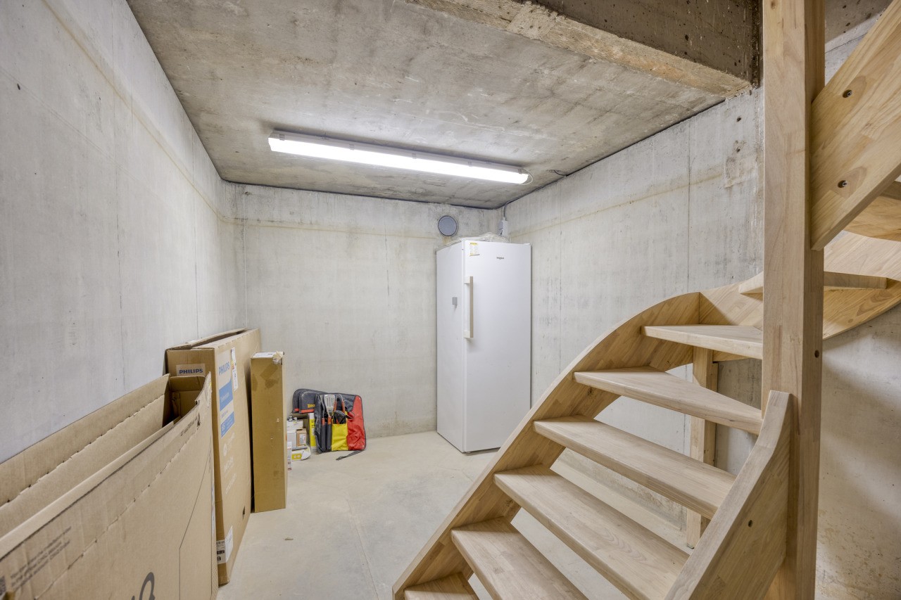 De kelder is toegankelijk via een vaste trap en biedt volop extra bergruimte, ideaal voor voorraad of hobbyspullen.
