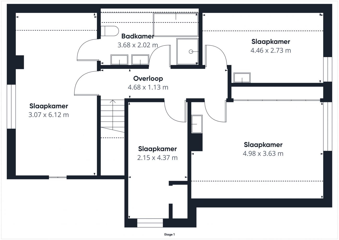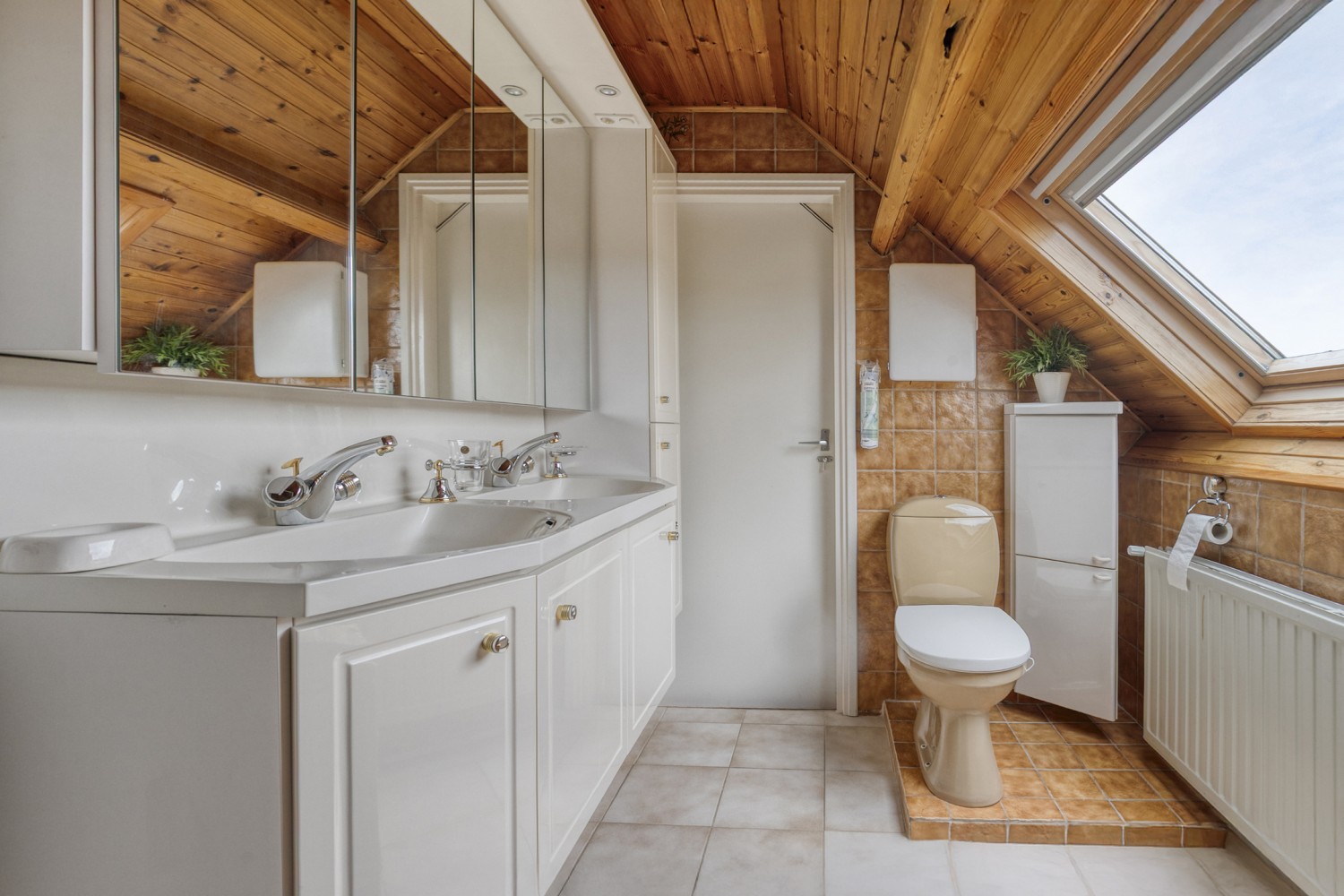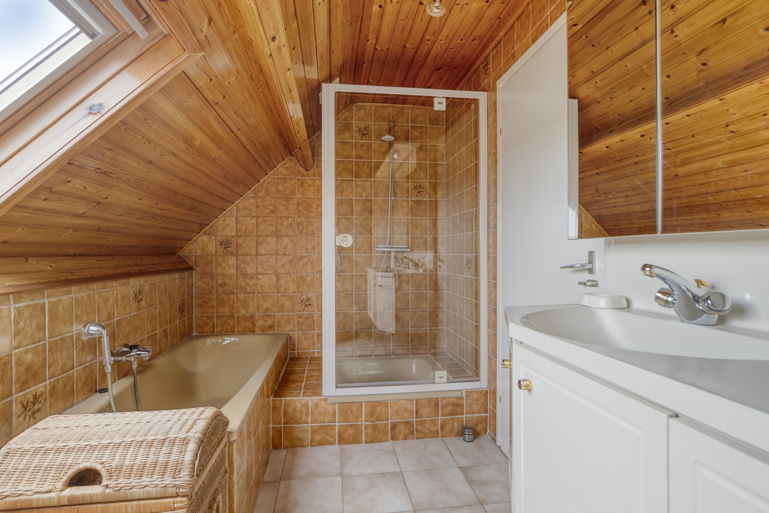 Op de eerste verdieping bevinden zich 4 comfortabele slaapkamers en de badkamer. De ouderslaapkamer is daarbij voorzien van airconditioning, ideaal voor warme zomernachten. De badkamer is voorzien van een ligbad, aparte douche, dubbele wastafel met meubel en een tweede toilet. Via een vlizotrap is de bergzolder bereikbaar.