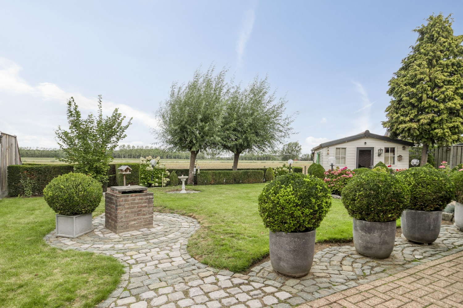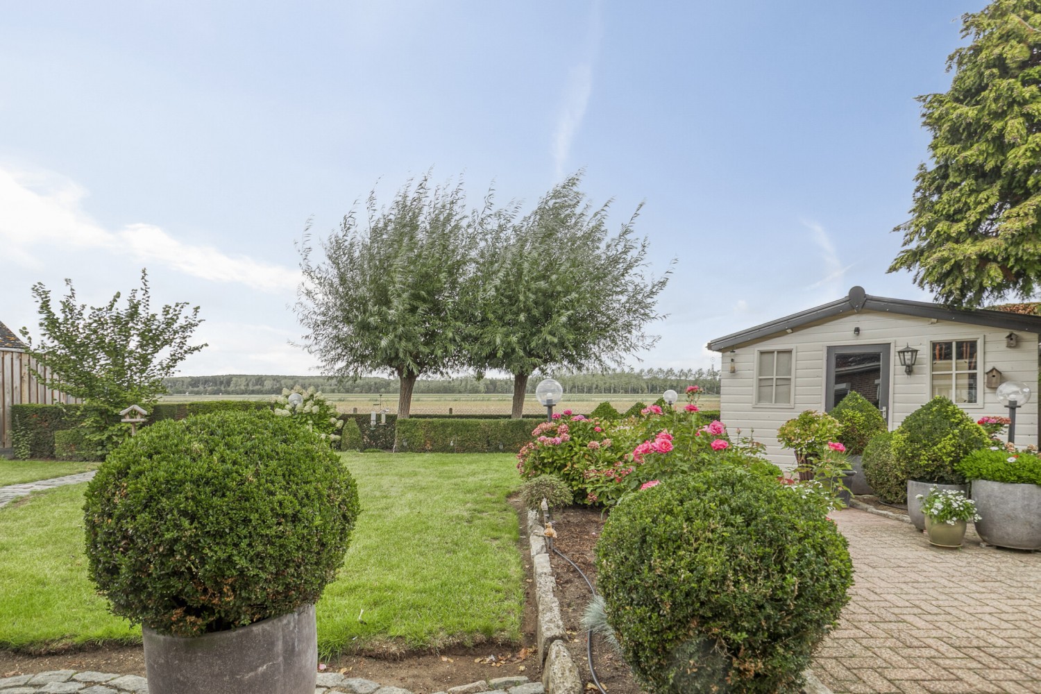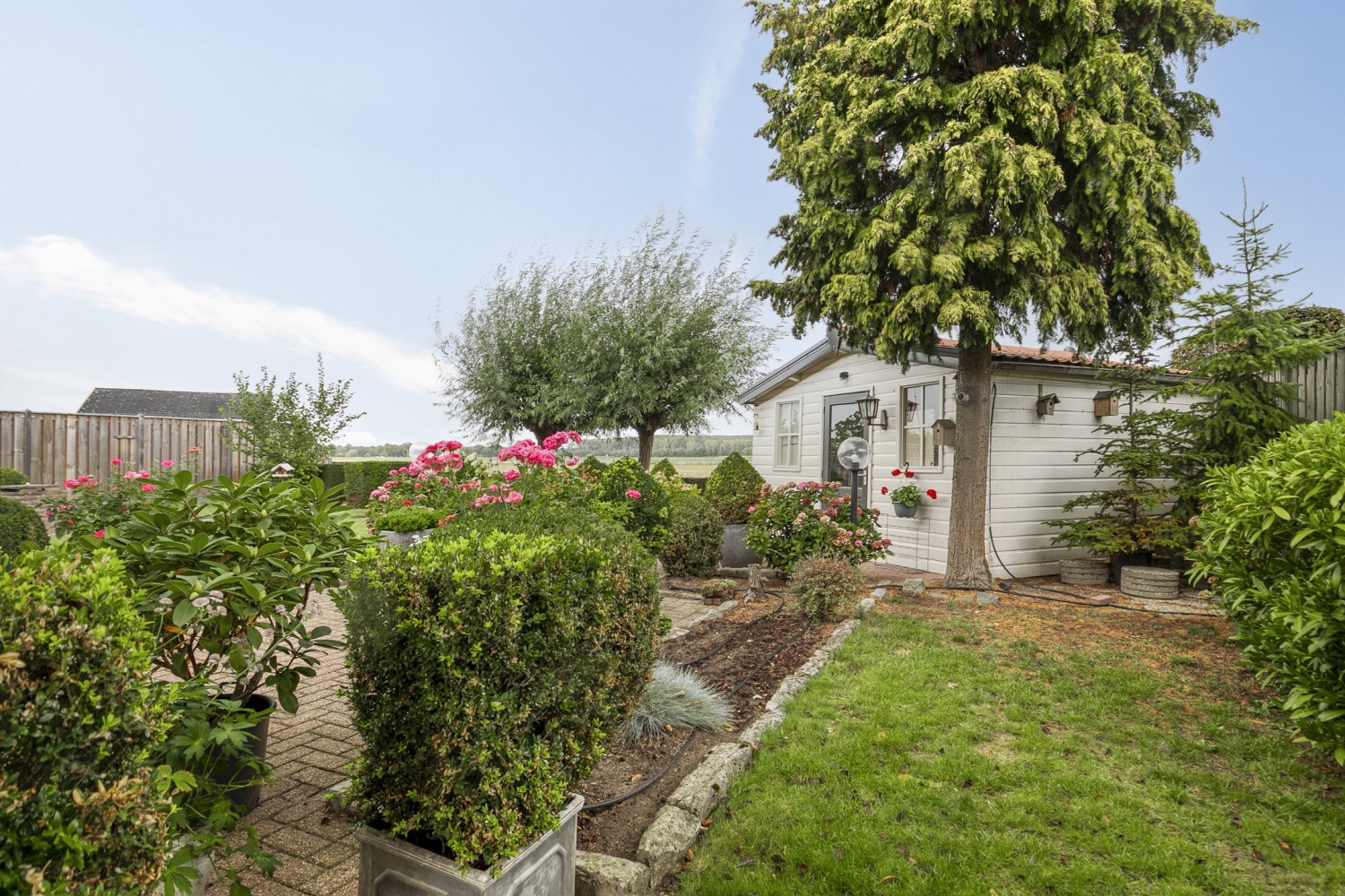 De fraai aangelegde tuin is een oase van rust en ruimte, met als absolute blikvanger het schitterende, vrije uitzicht over het achtergelegen Zeeuws-Vlaamse polderlandschap. Het houten tuinhuis biedt extra bergruimte. In deze tuin geniet je volop van privacy, groen en het heerlijke buitenleven!