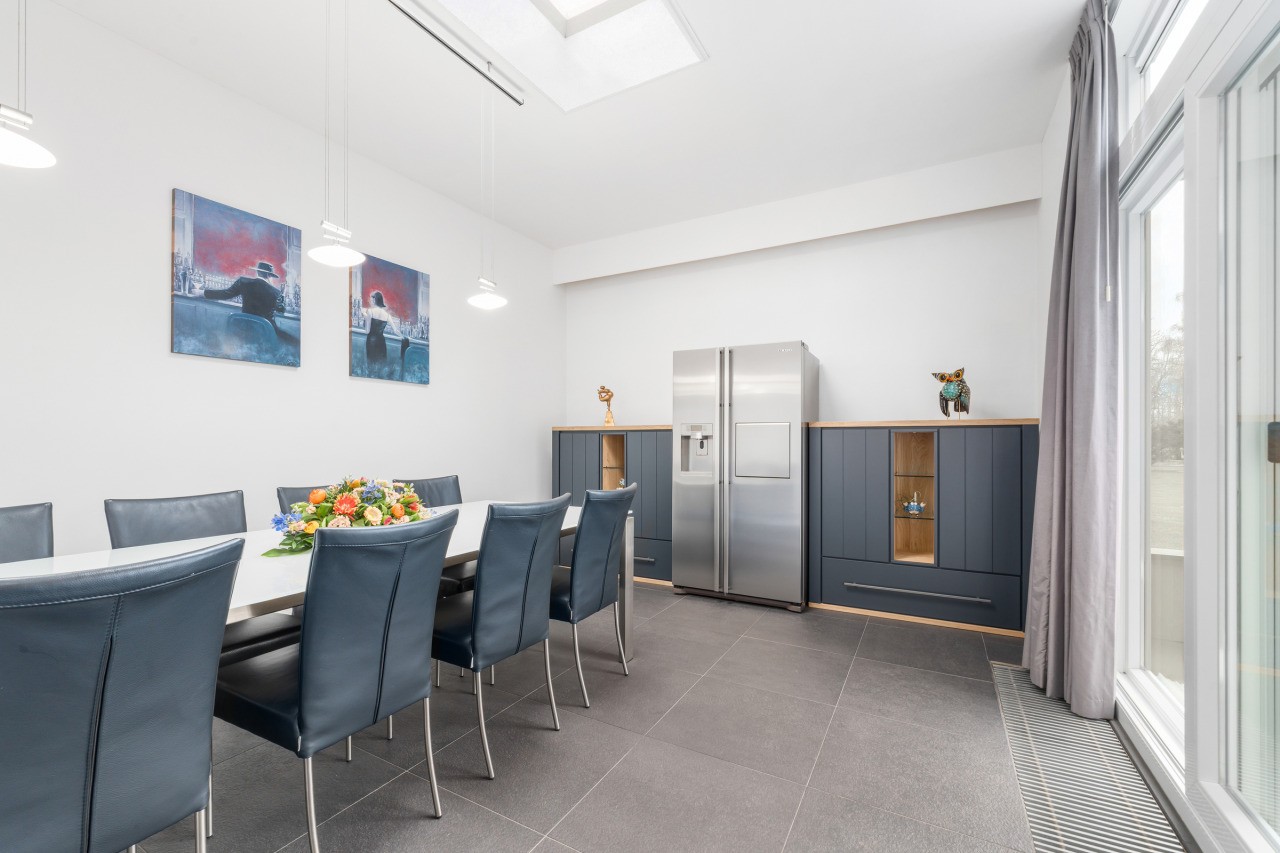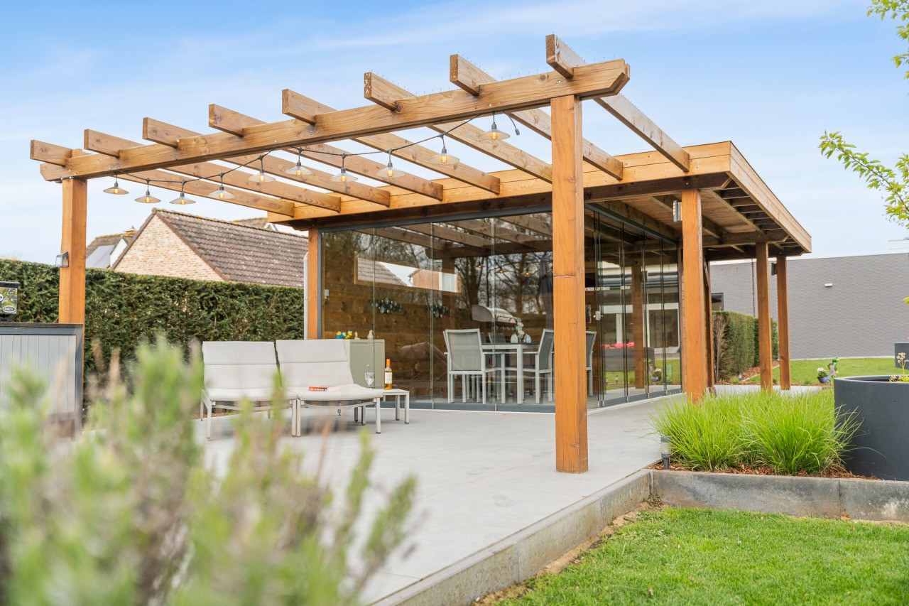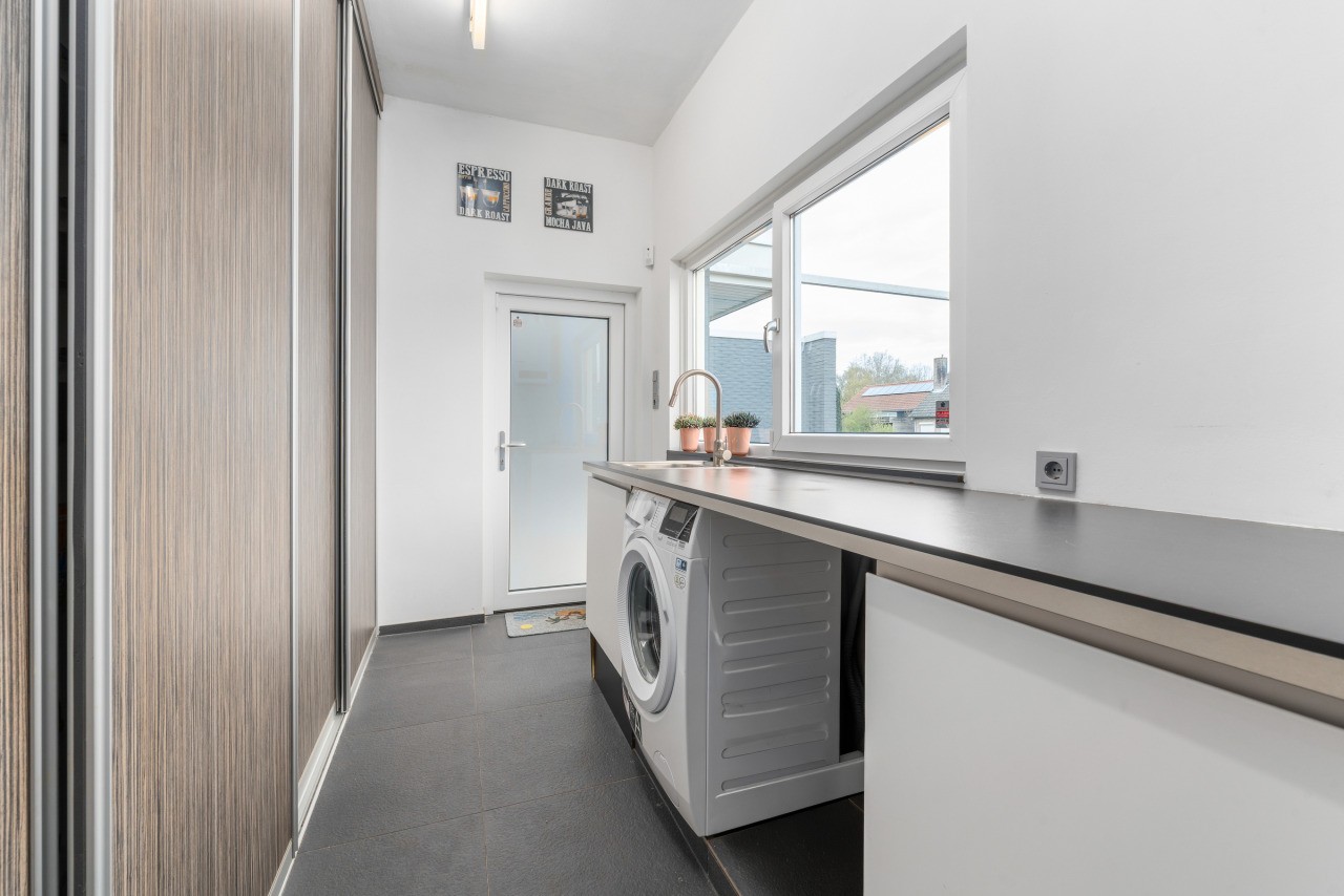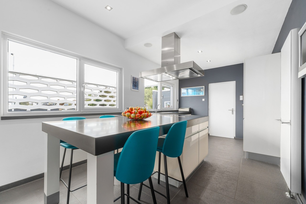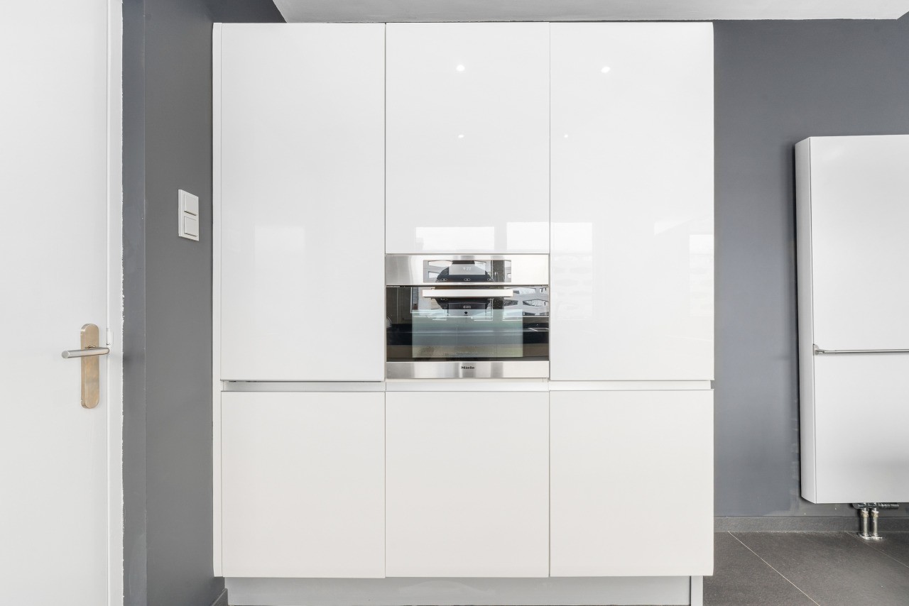 De moderne, volledig ingerichte keuken met eiland is strak en functioneel, voorzien van alle comfort, met aansluitend een praktische bijkeuken. Zowel vanuit de keuken als de leefruimte heb je directe toegang tot de veranda en het overdekte terras, compleet met screens.