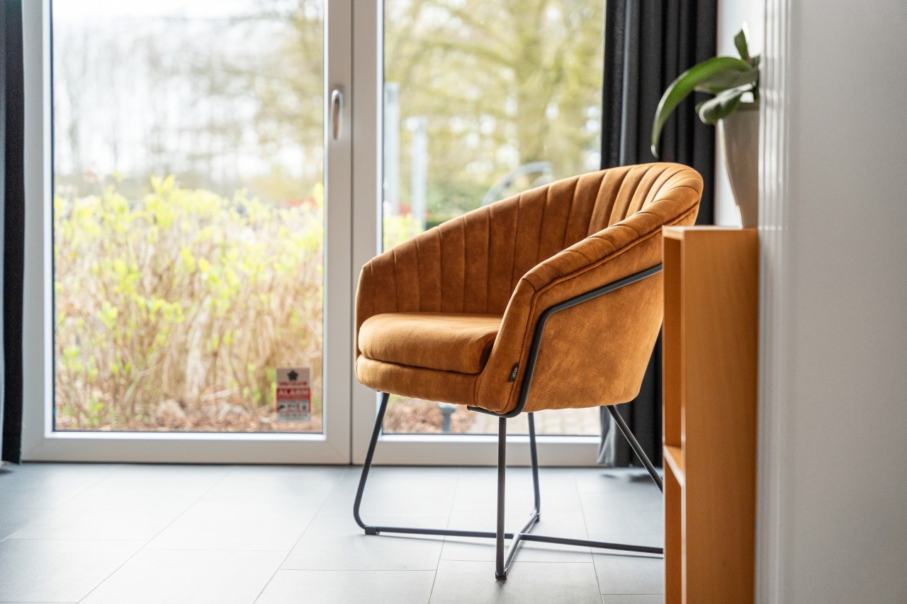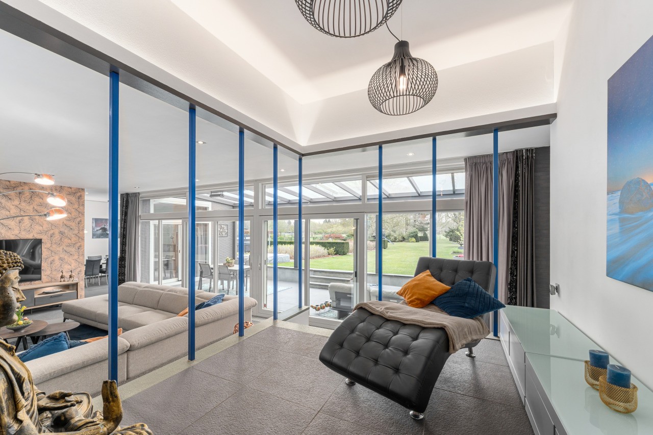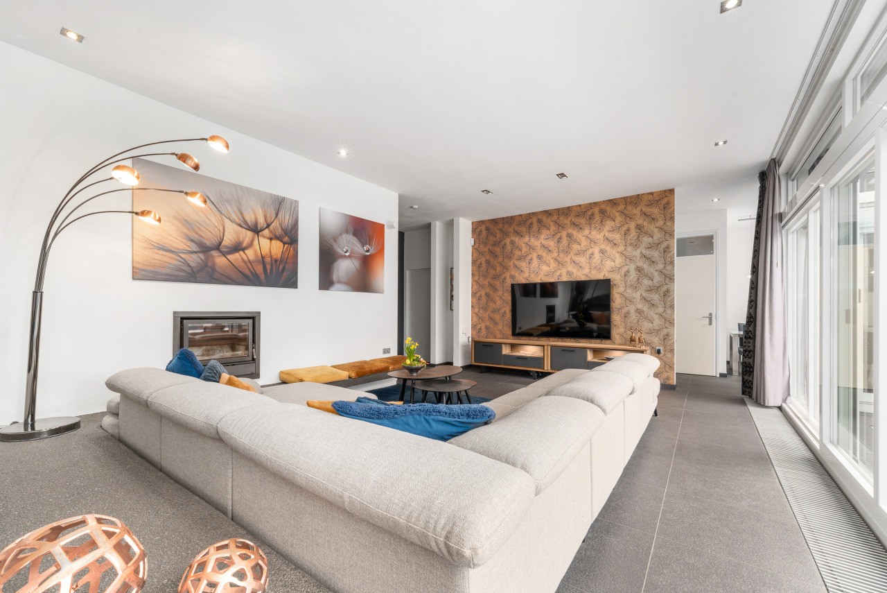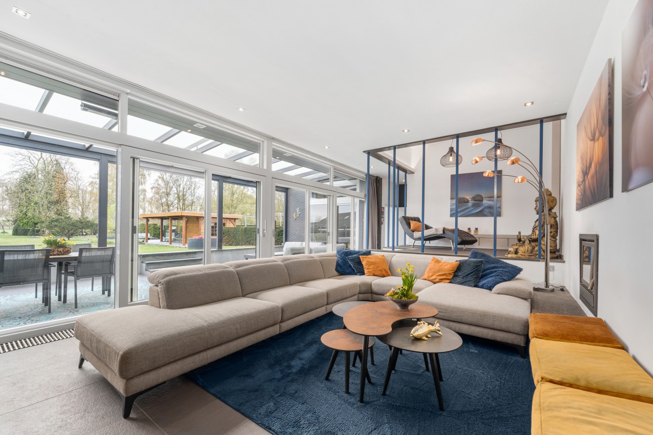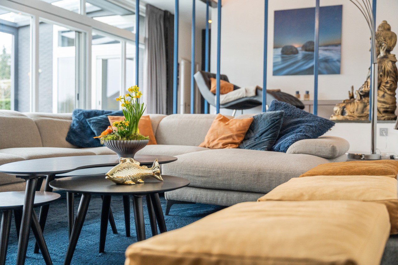 De leefruimte is een echte eyecatcher: open, licht en uitnodigend. Een gezellige houtkachel vormt het hart van de zithoek, terwijl het verhoogde zitgedeelte met lounge een unieke sfeer creëert. De eetruimte sluit hier mooi op aan en biedt een prachtig uitzicht op de tuin.