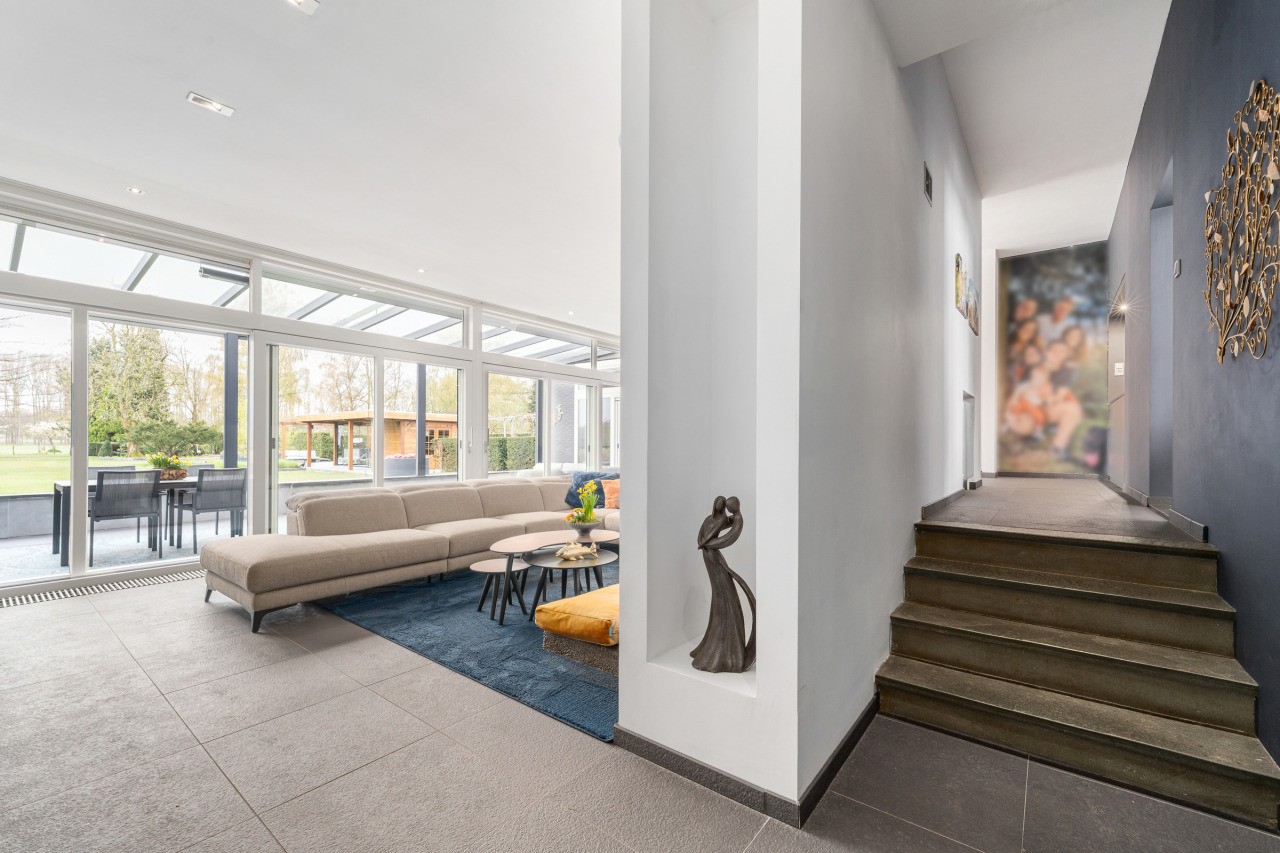 Deze woning is een toonbeeld van moderne architectuur. Oorspronkelijk gebouwd in 1969, werd hij in 2020 volledig gerenoveerd tot een instapklaar, hedendaags geheel. Alles is met zorg en oog voor detail afgewerkt en sindsdien perfect onderhouden. Bij binnenkomst word je verwelkomd in een stijlvolle inkomhal met gastentoilet en vestiaire, die naadloos overgaat in de rest van de woning en toegang biedt tot de inpandige garage.