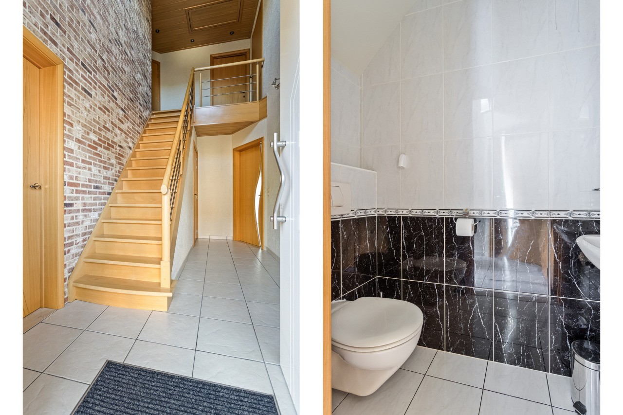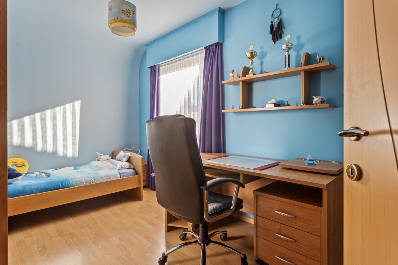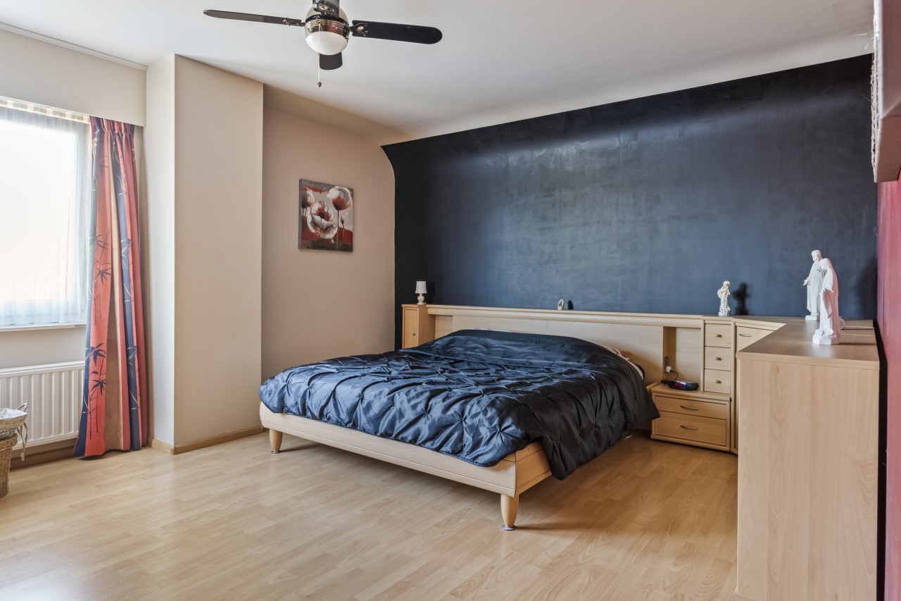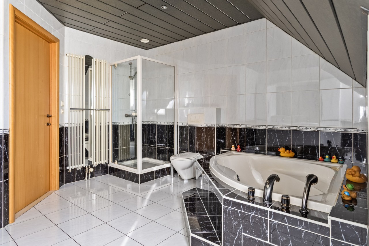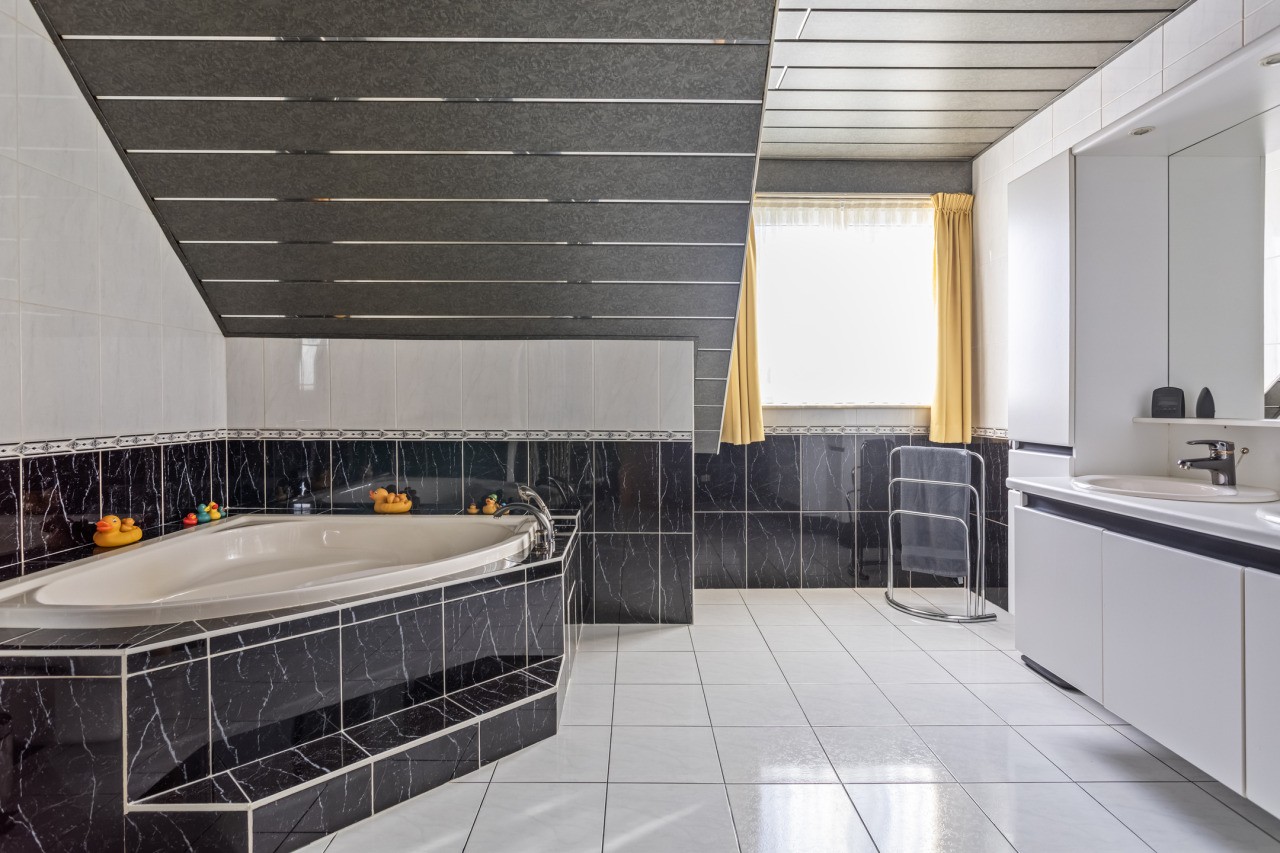Op de eerste verdieping leidt de overloop naar vier slaapkamers, waarvan één kamer toegankelijk is via een andere slaapkamer. Vanuit deze kamer is tevens de vlizotrap naar de garage bereikbaar. De stookruimte bevindt zich aan de achterzijde, boven de garage. De badkamer is compleet ingericht met een ligbad, douchecabine, dubbele wastafel met meubel en een toilet.