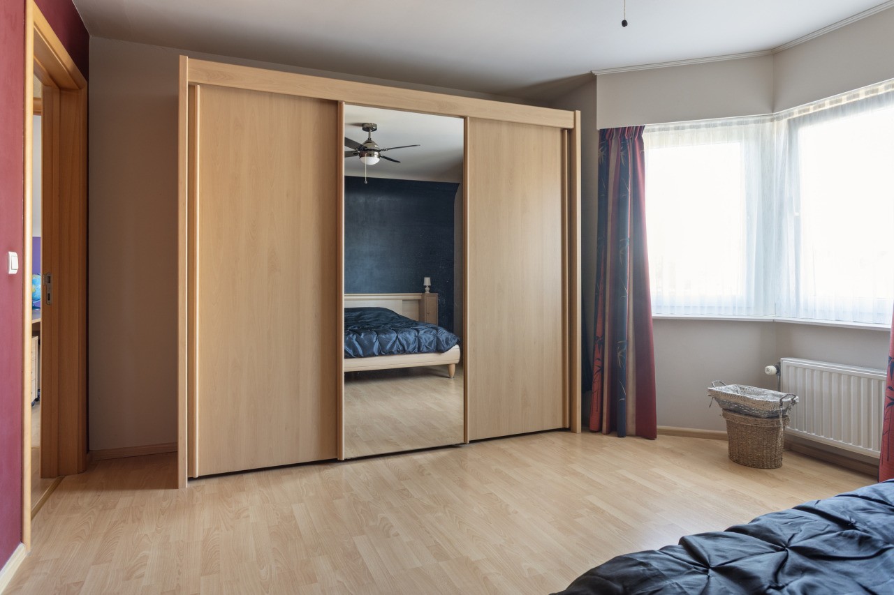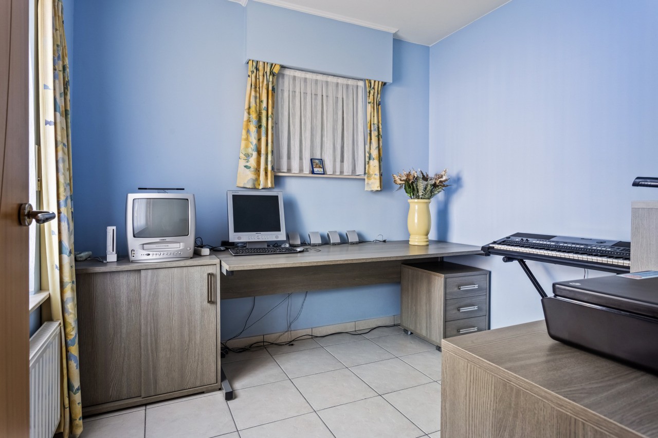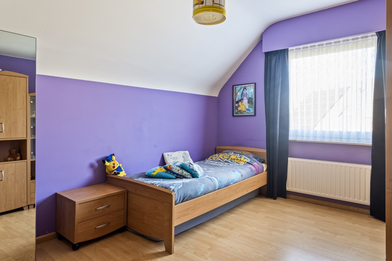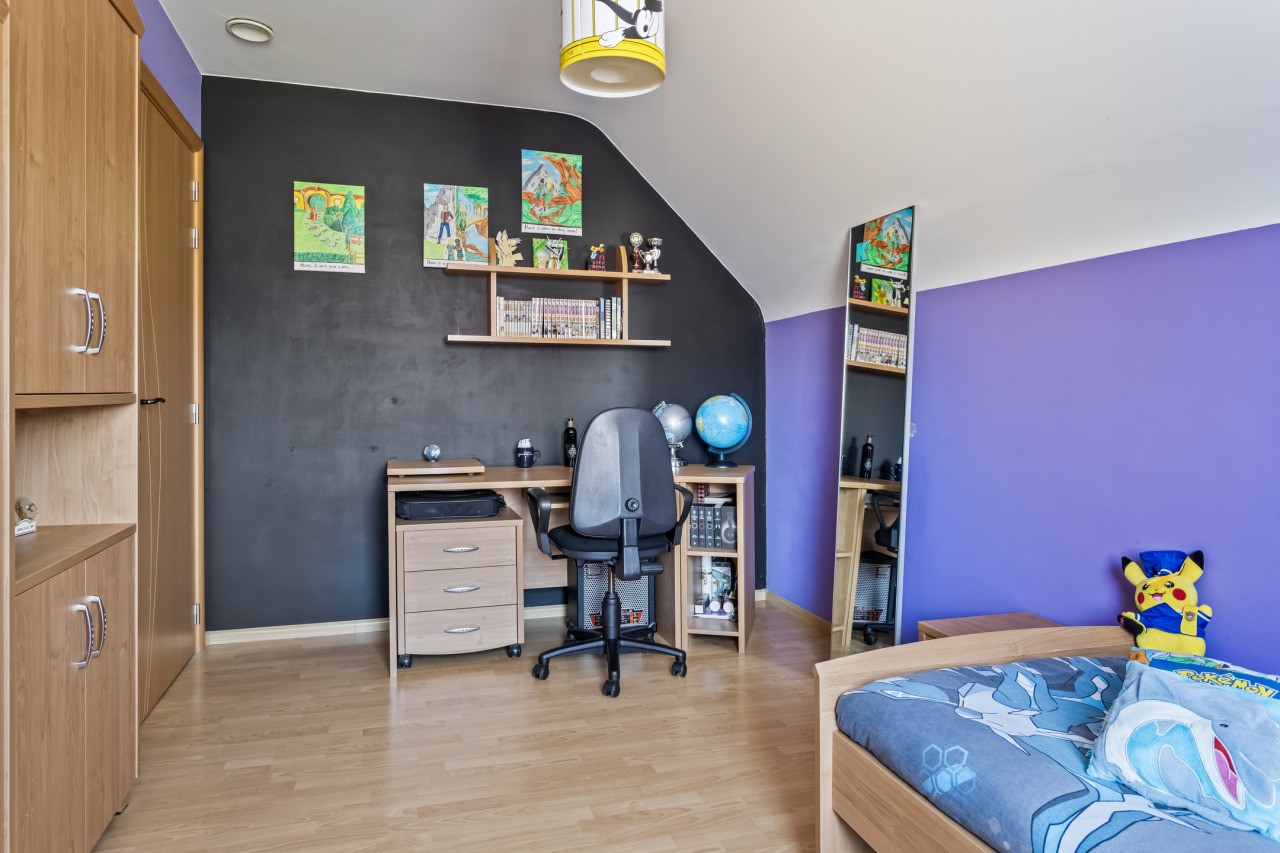 Op de eerste verdieping leidt de overloop naar vier slaapkamers, waarvan één kamer toegankelijk is via een andere slaapkamer. Vanuit deze kamer is tevens de vlizotrap naar de garage bereikbaar. De stookruimte bevindt zich aan de achterzijde, boven de garage. De badkamer is compleet ingericht met een ligbad, douchecabine, dubbele wastafel met meubel en een toilet.