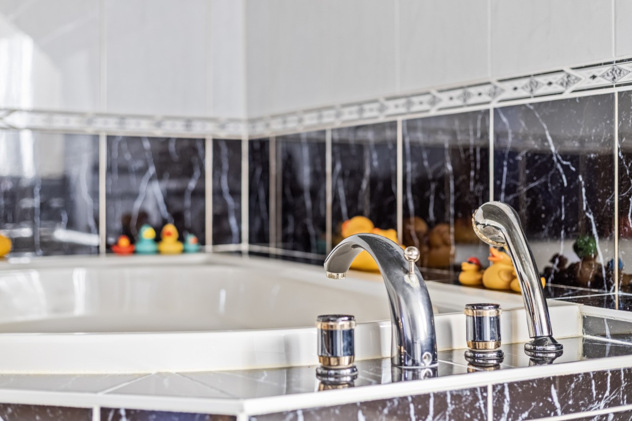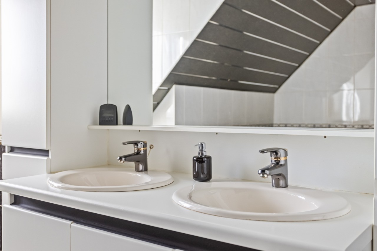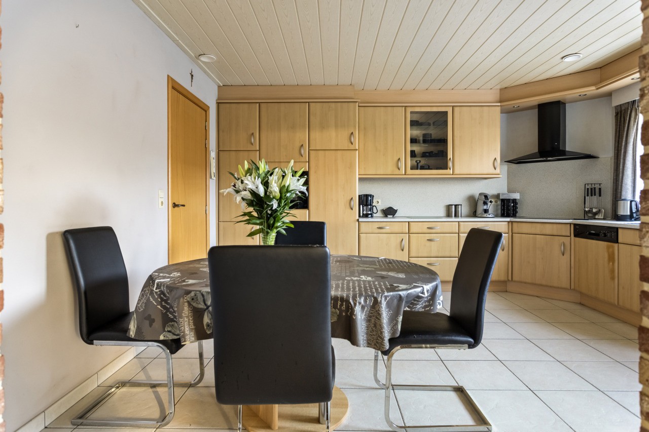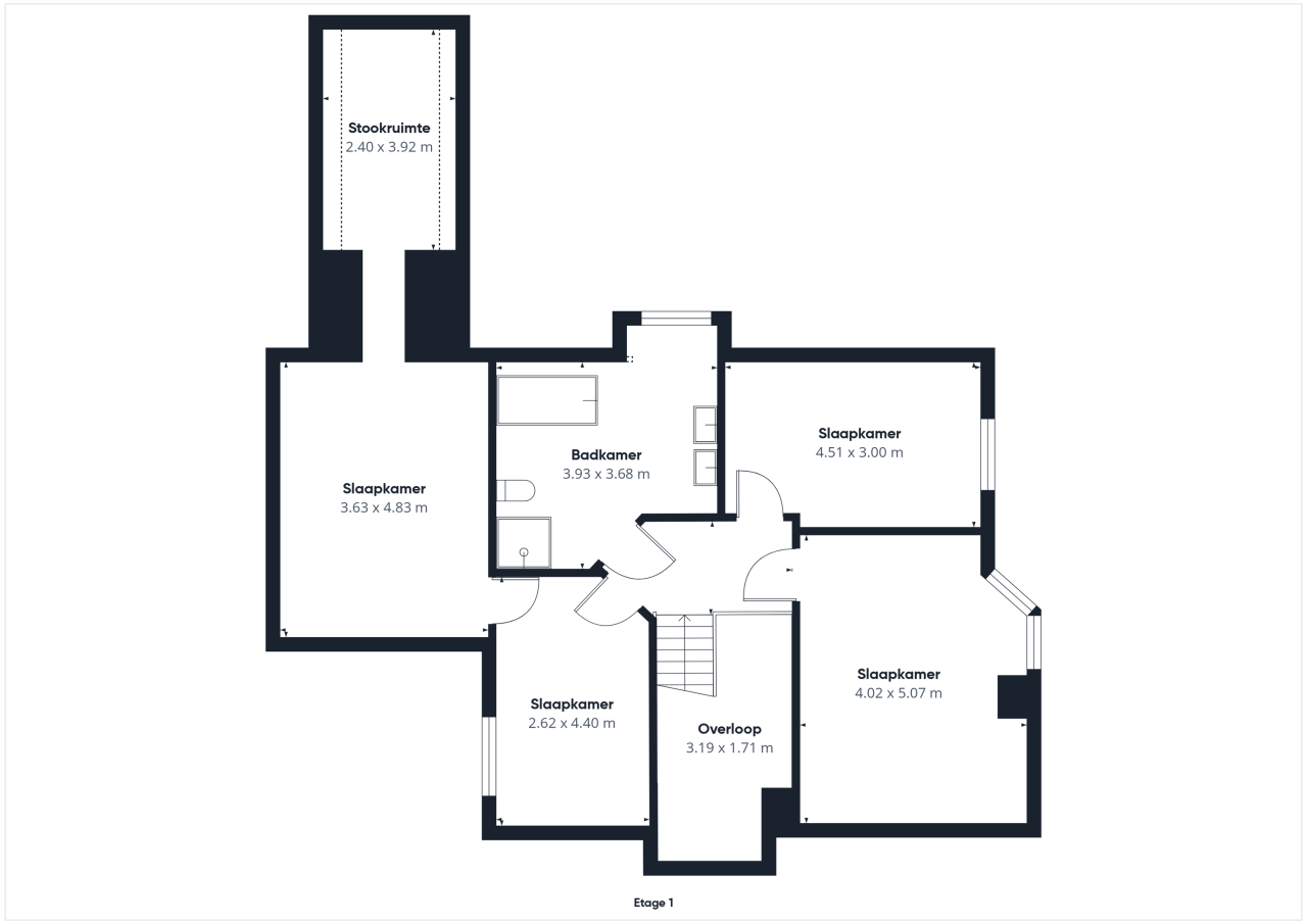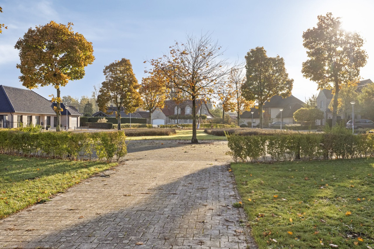 Op de eerste verdieping leidt de overloop naar vier slaapkamers, waarvan één kamer toegankelijk is via een andere slaapkamer. Vanuit deze kamer is tevens de vlizotrap naar de garage bereikbaar. De stookruimte bevindt zich aan de achterzijde, boven de garage. De badkamer is compleet ingericht met een ligbad, douchecabine, dubbele wastafel met meubel en een toilet.