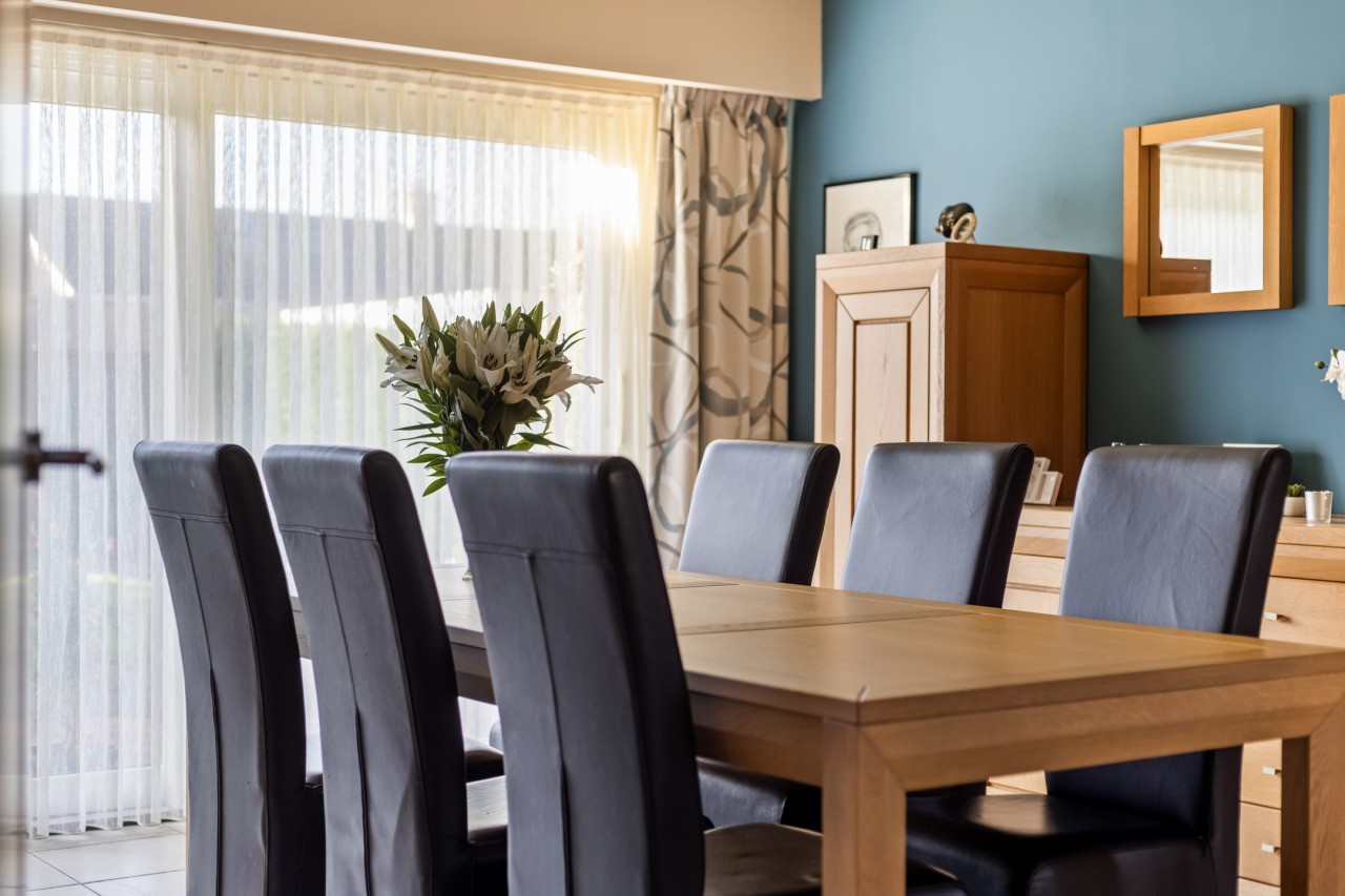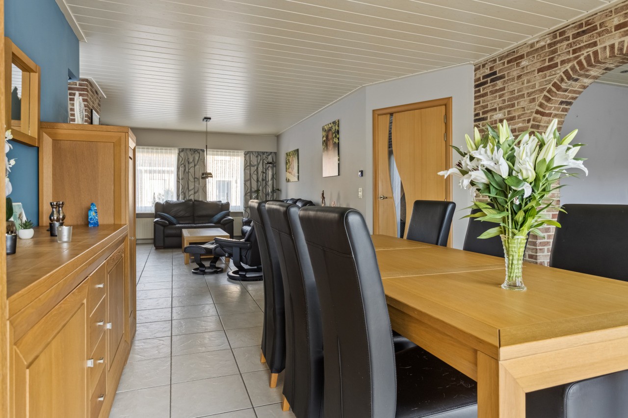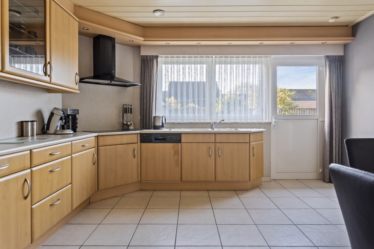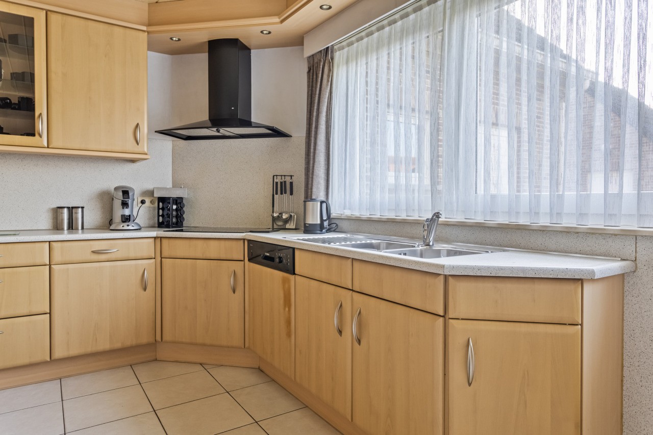 Via de hal met trapopgang, meterkast en toilet kom je binnen in de woonkamer. Links in de hal bevindt zich direct een fijne werkkamer, ideaal voor thuiswerk of als hobbyruimte. De doorzonwoonkamer is ruim en licht, met aan de voorzijde een gezellige zithoek rond de gas brandhaard en aan de achterzijde een eethoek met schuifpui naar de tuin. De open woonkeuken sluit hier mooi op aan en biedt volop ruimte voor een eettafel. De keuken is uitgerust met inbouwapparatuur en geeft toegang tot zowel de achtertuin als de praktische bijkeuken. In de bijkeuken vind je de witgoedaansluitingen en een doorgang naar de garage. De ruime garage beschikt over een extra keukenblok, is voorzien van een elektrische deur en biedt toegang tot de oprit met plaats voor meerdere auto’s.