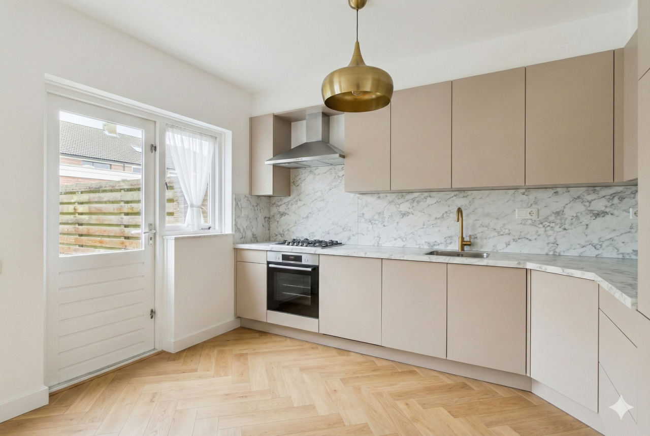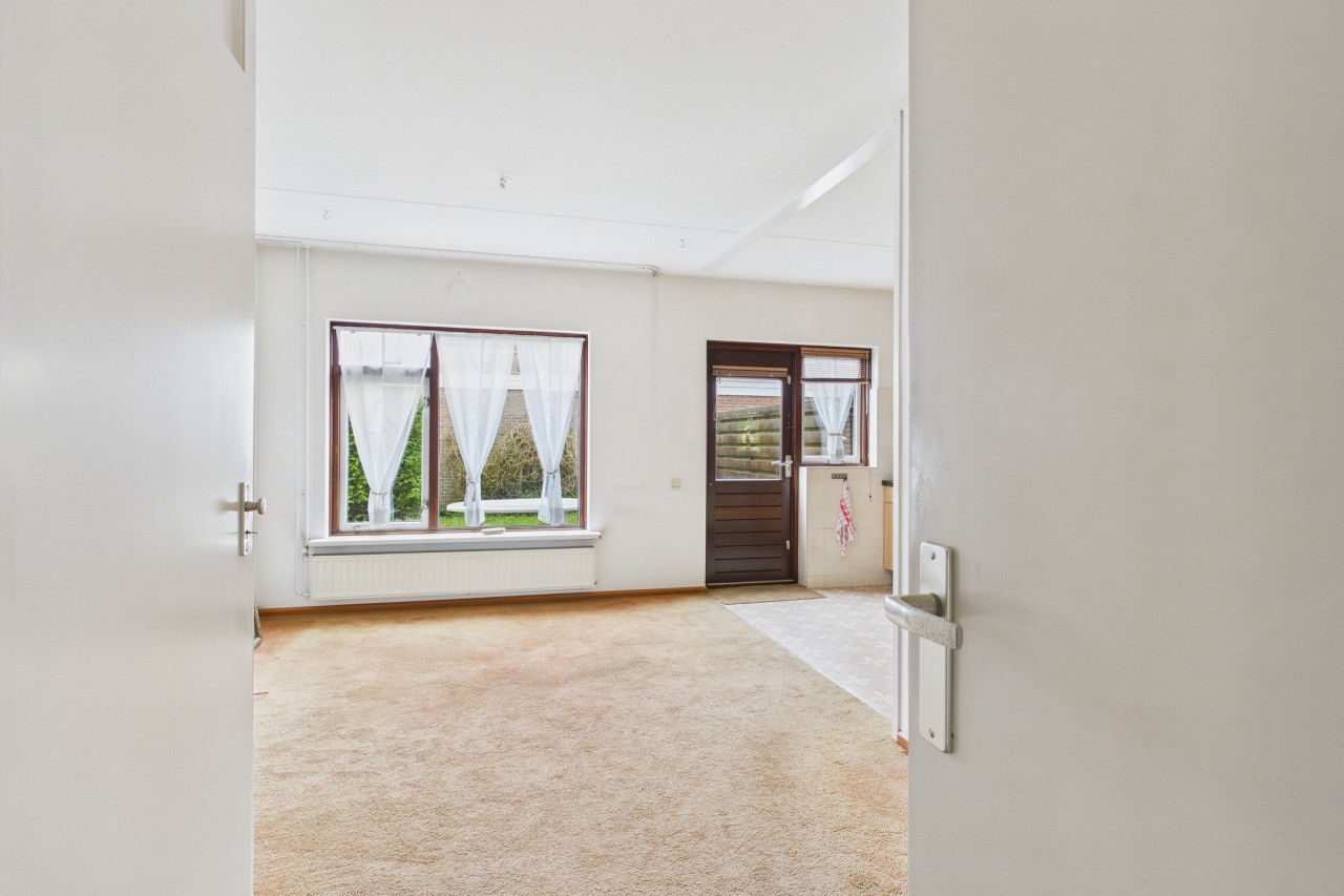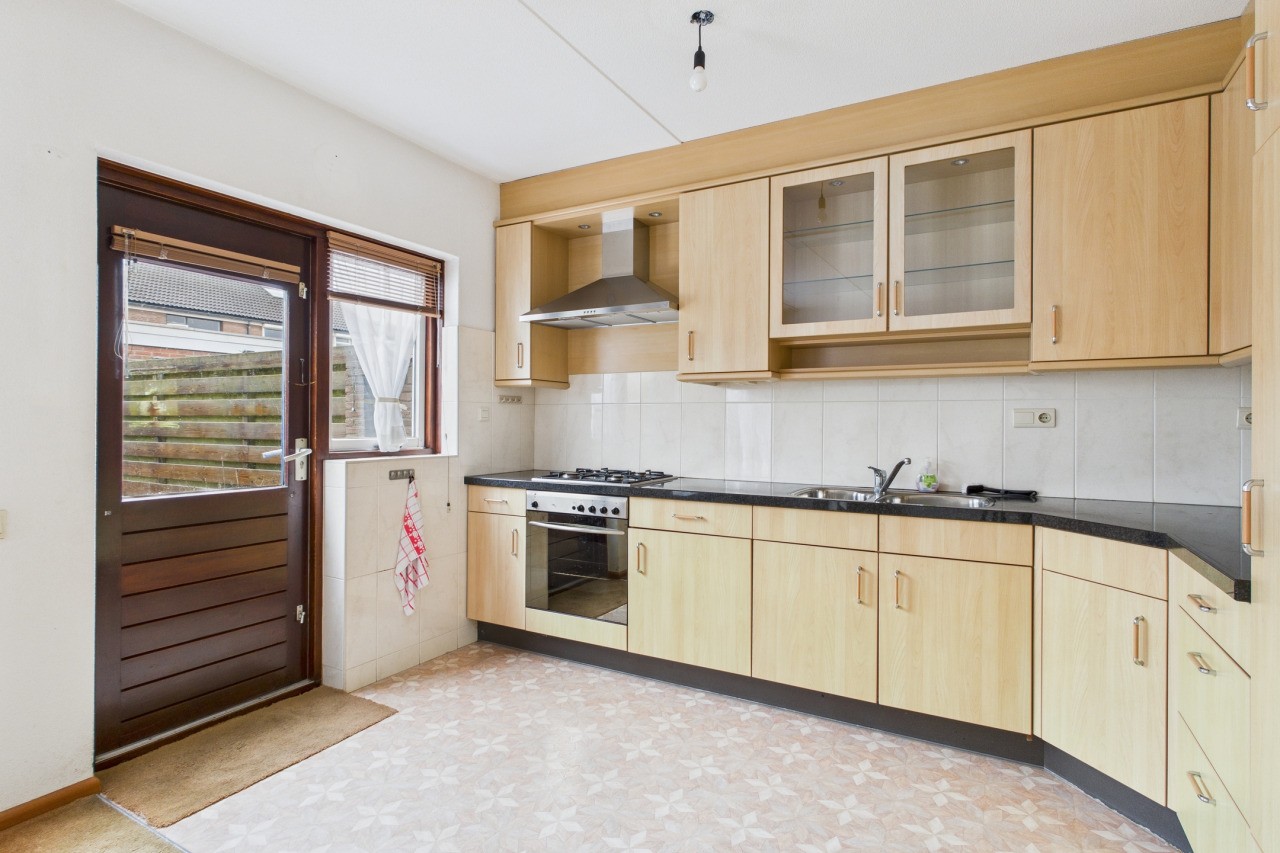 Bij binnenkomst valt de lichte en praktische indeling van de woning direct op. De hal geeft toegang tot het toilet met fontein, de meterkast en de trap naar boven, en leidt naar de gezellige woonkamer. Hier is een comfortabele zithoek aan de voorzijde en aan de achterzijde sluit de open keuken in hoekopstelling aan, met een directe verbinding naar de zonnige achtertuin.