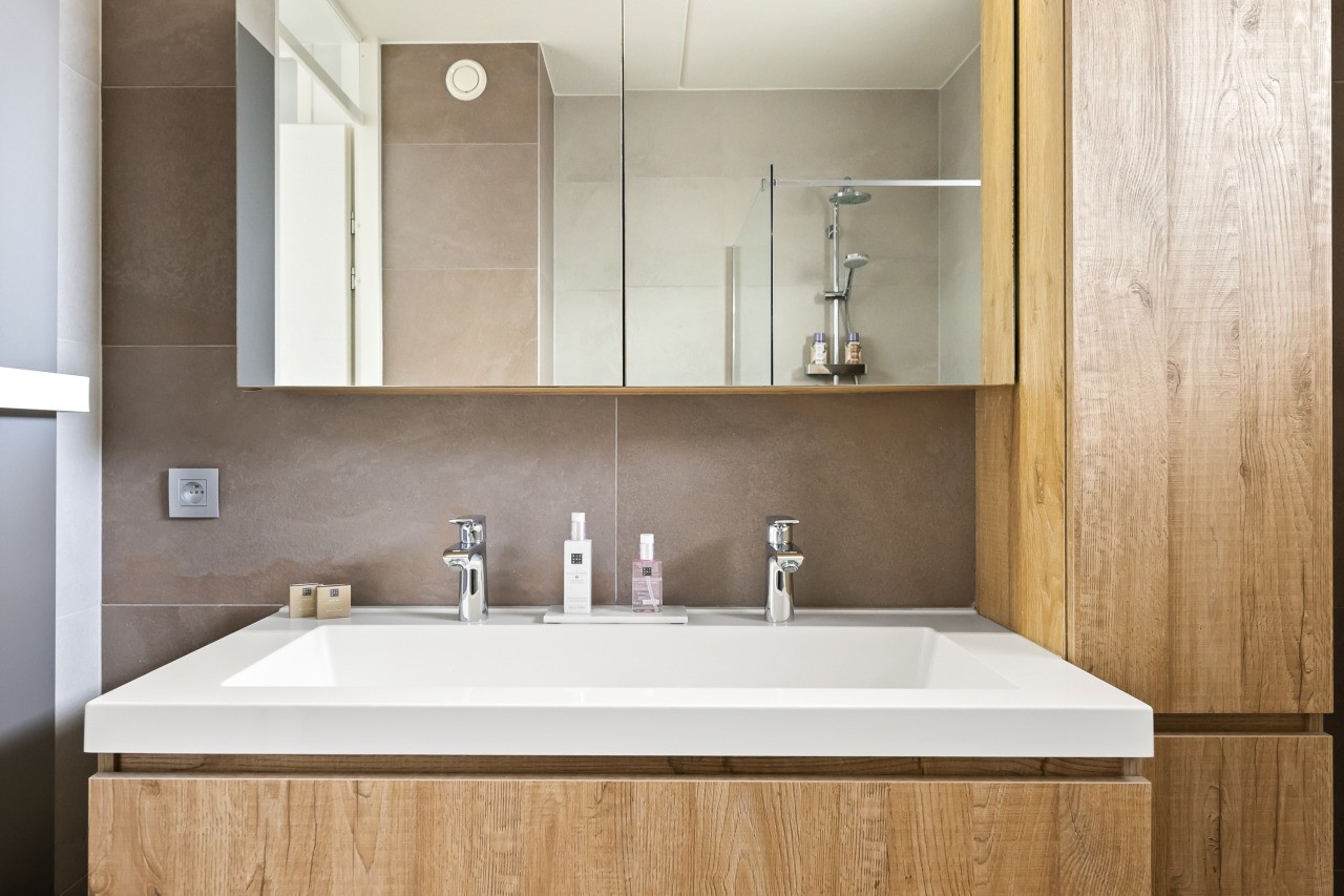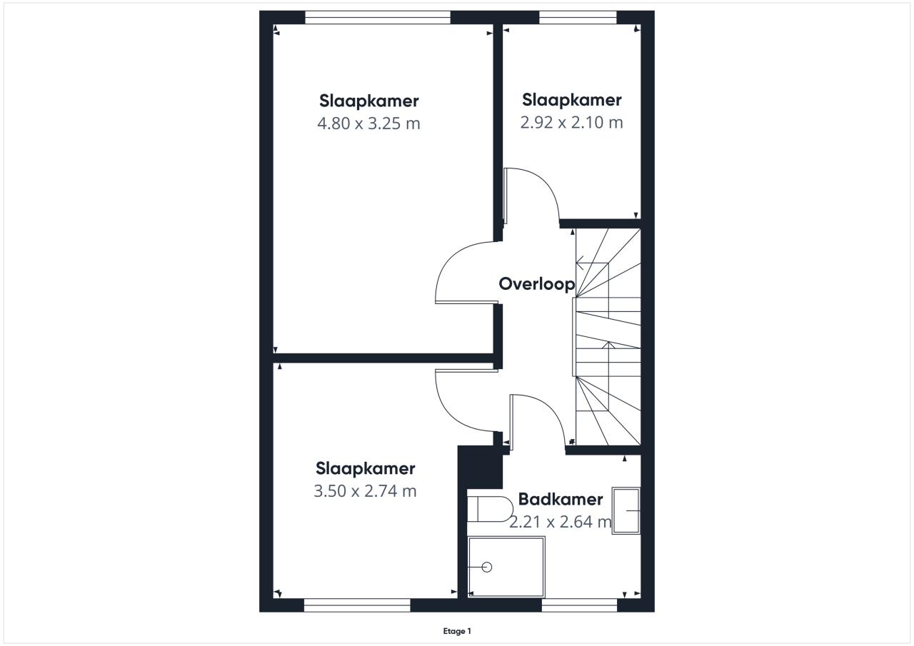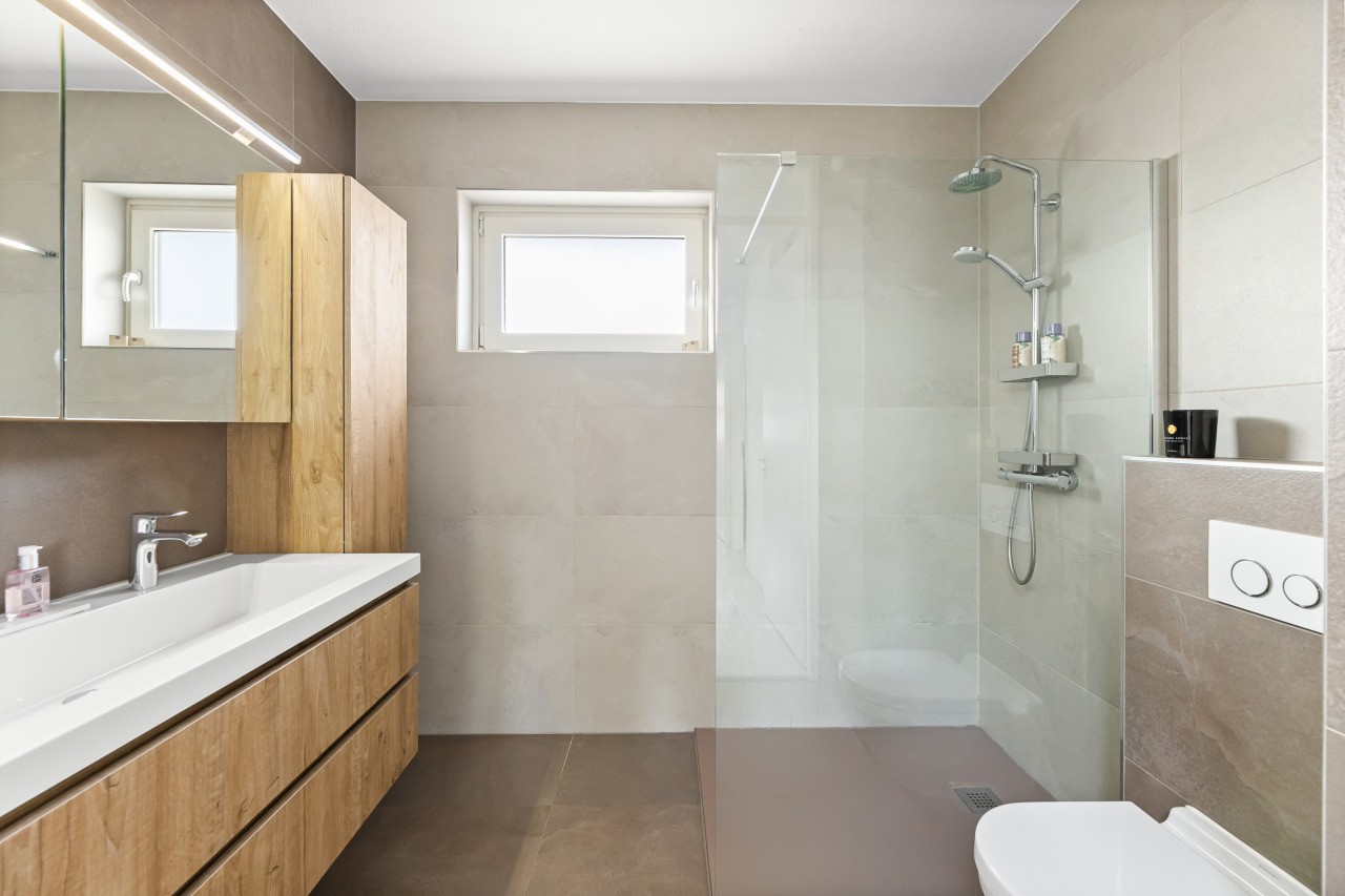 Op de eerste verdieping leidt de overloop naar drie comfortabele slaapkamers en de luxe badkamer voorzien van een douche, dubbele wastafel en toilet. De kamers zijn licht, praktisch ingedeeld en bieden voldoende ruimte voor het hele gezin.