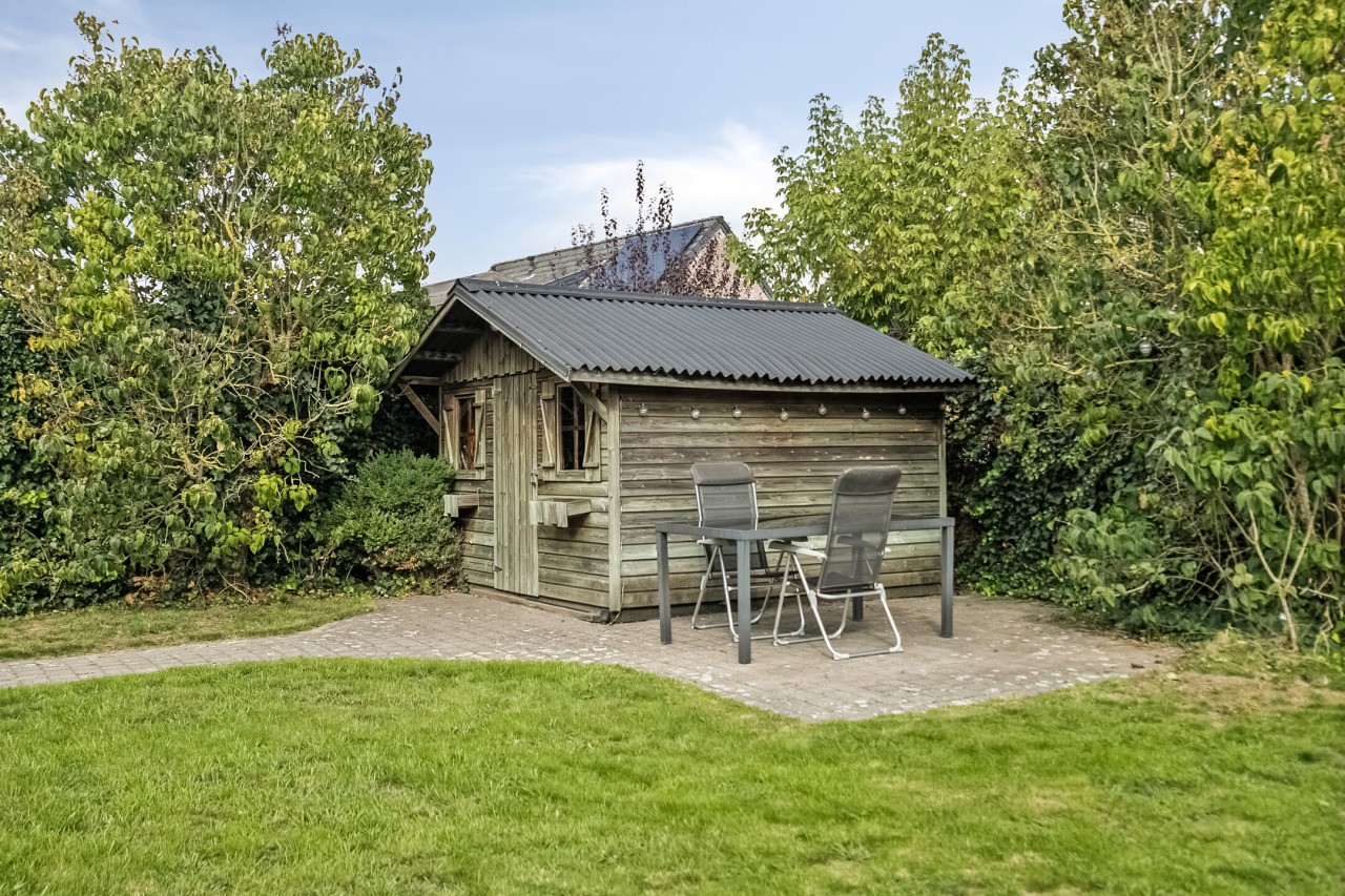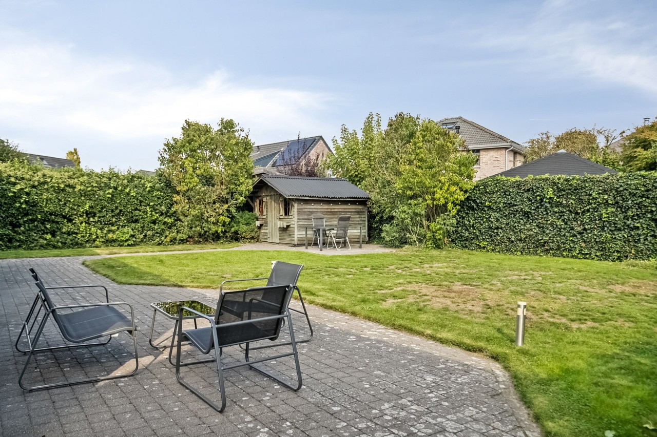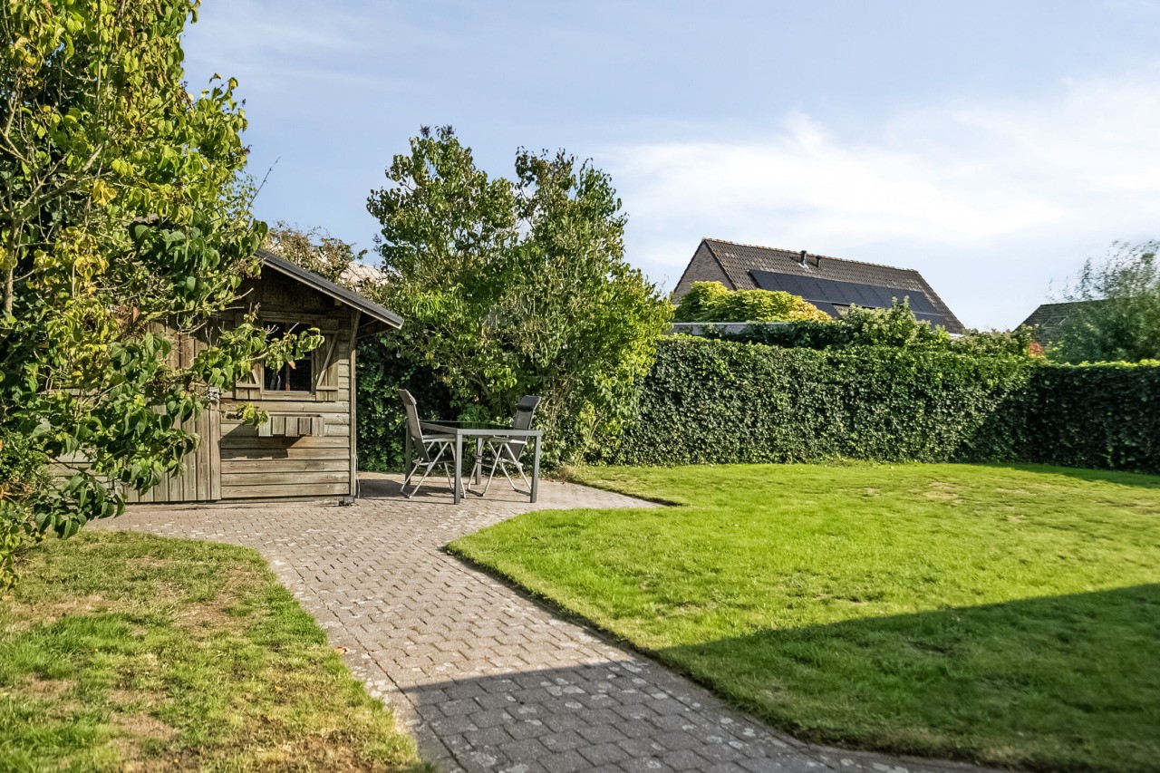 De tuin is een heerlijke buitenruimte om te ontspannen of te spelen. Het terras met zonnescherm grenst direct aan de woning en het gazon biedt volop ruimte voor kinderen om te spelen. Achterin staat een houten berging voor extra opslag. Dankzij de ligging op het oosten kun je ’s ochtends en in de vroege middag genieten van zon, terwijl er ook beschutte plekjes zijn om rustig in de schaduw te zitten.