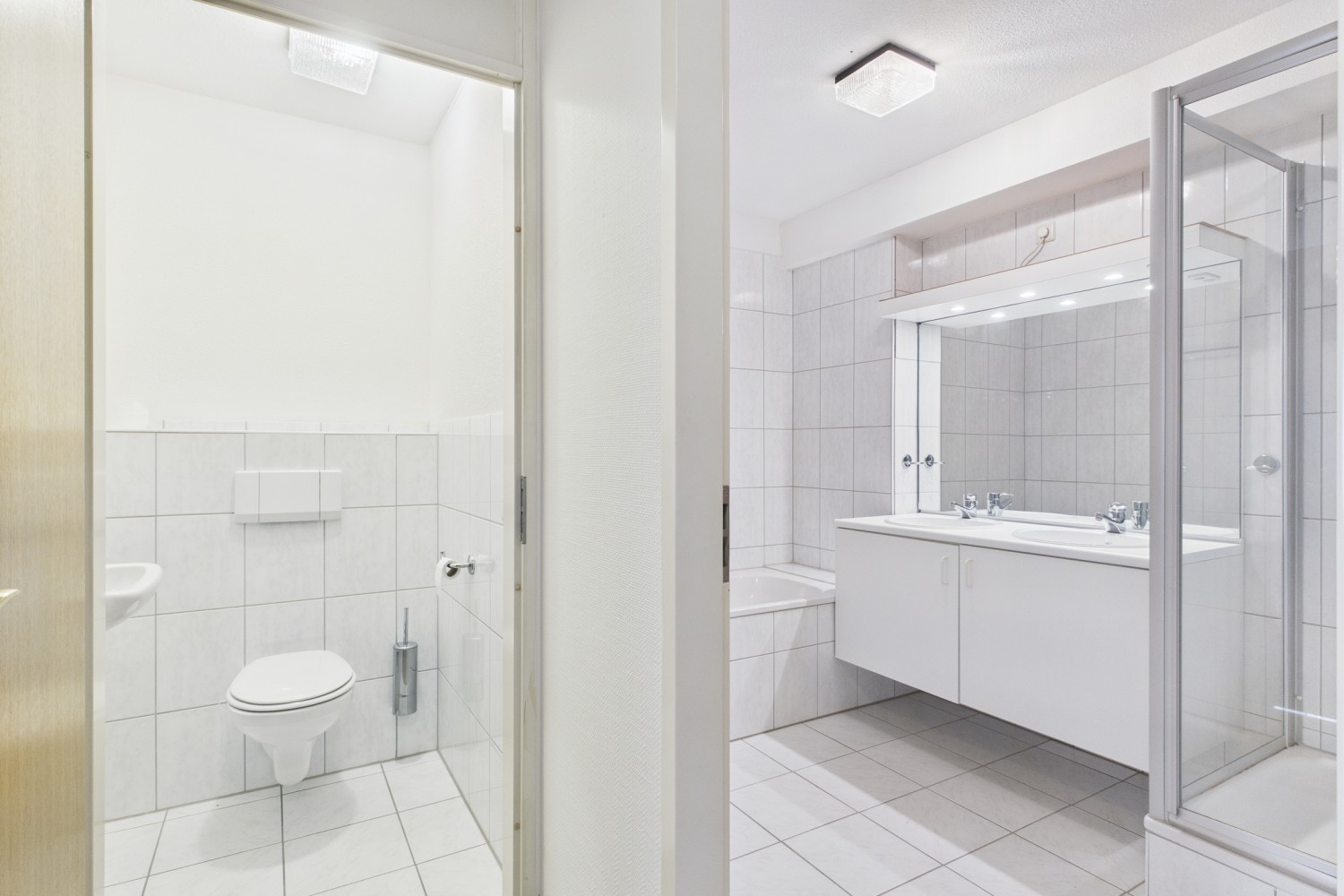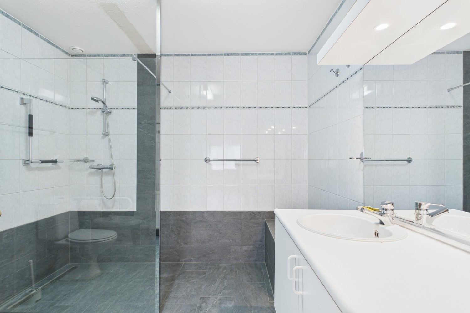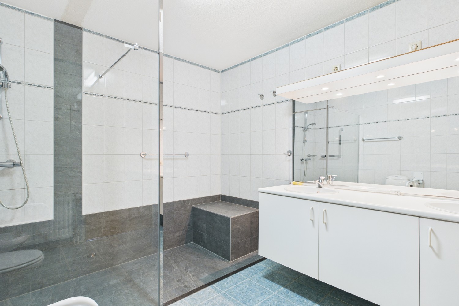 Grenzend aan de woonkamer ligt een extra slaapkamer die zich perfect leent als gastenverblijf, werkkamer of zelfstandige suite. De eigen badkamer met douche en wastafelmeubel maakt deze ruimte bijzonder comfortabel en veelzijdig in gebruik. De masterbedroom is royaal opgezet en straalt rust uit. De aangrenzende en-suite badkamer is luxe uitgevoerd met een ruime inloopdouche, dubbel wastafelmeubel, bidet en een tweede toilet. Twee bijkomende slaapkamers, beide ruim en licht, delen een derde badkamer met douche, ligbad en modern wastafelmeubel. Alle ruimtes zijn afgewerkt met hoogwaardige materialen en hebben een verzorgde, harmonieuze uitstraling.