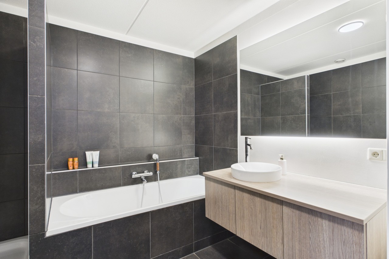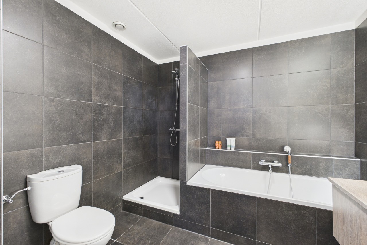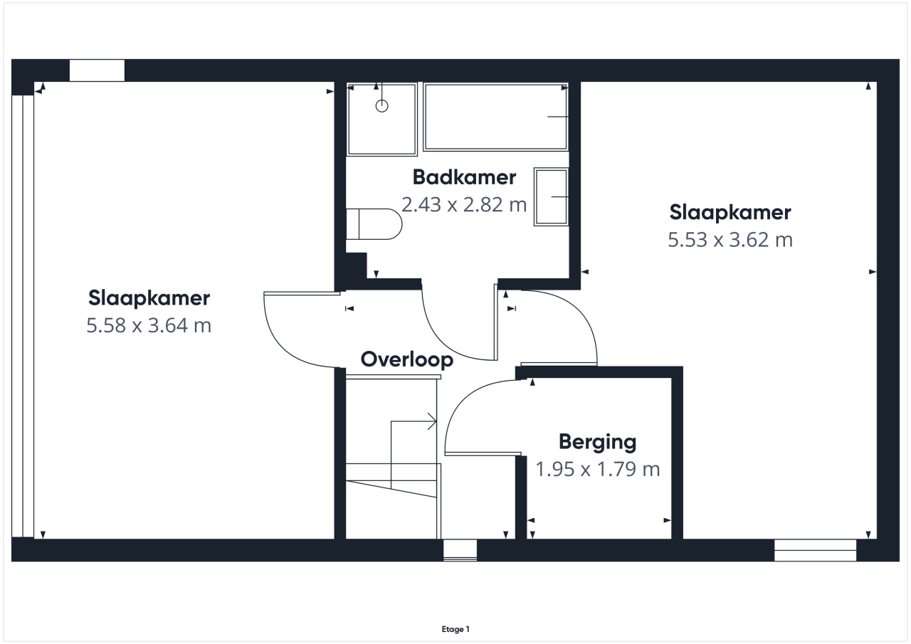 Op de eerste verdieping bevinden zich de overloop, twee royale slaapkamers en een praktische berging/stookruimte. Beide slaapkamers strekken zich uit over de volledige breedte van de woning, waardoor ze opvallend ruim en licht zijn. Door de overloop iets uit te breiden, is er eenvoudig een derde slaapkamer te realiseren. De moderne badkamer is netjes afgewerkt en beschikt over een ligbad, douche, wastafelmeubel en tweede toilet.