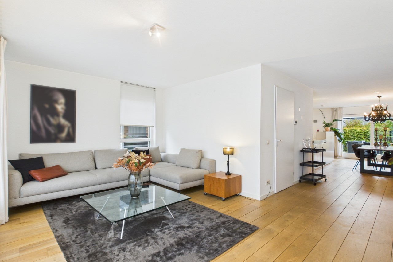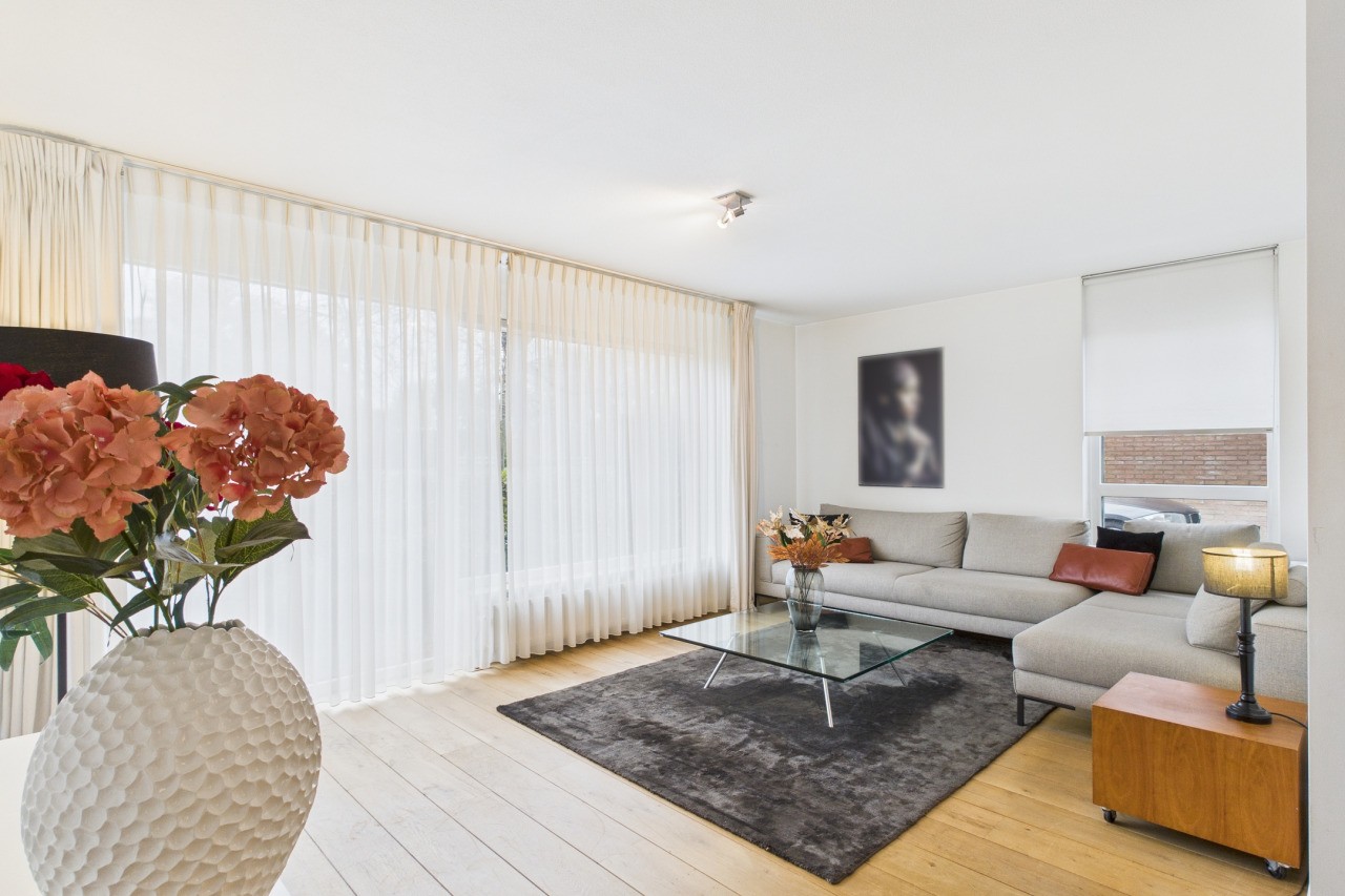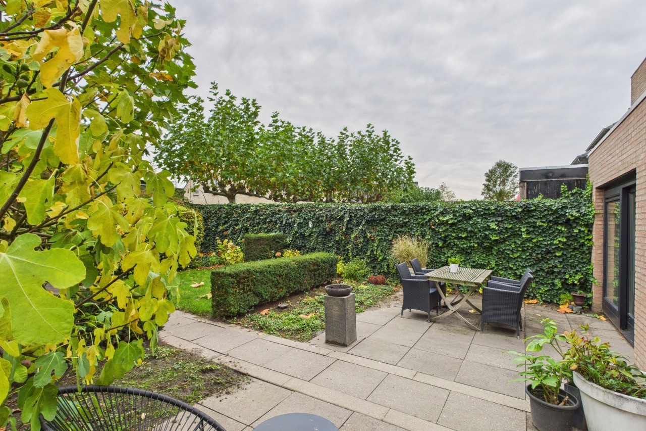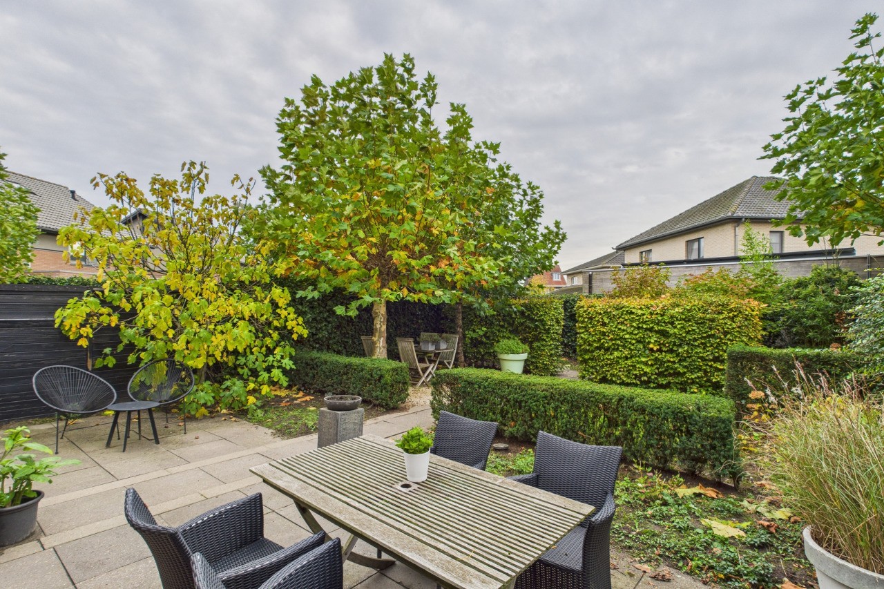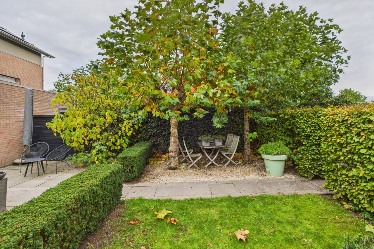 De tuin vormt een heerlijk verlengstuk van de woning. Dankzij de ligging op het zuiden geniet je hier volop van de zon, terwijl het terras uitnodigt tot lange avonden buiten. Het verzorgde gazon en de beschutte zithoek onder de platanen zorgen voor een prettige afwisseling tussen zon en schaduw. Een ideale plek om te ontspannen of gezellig te tafelen met familie en vrienden.