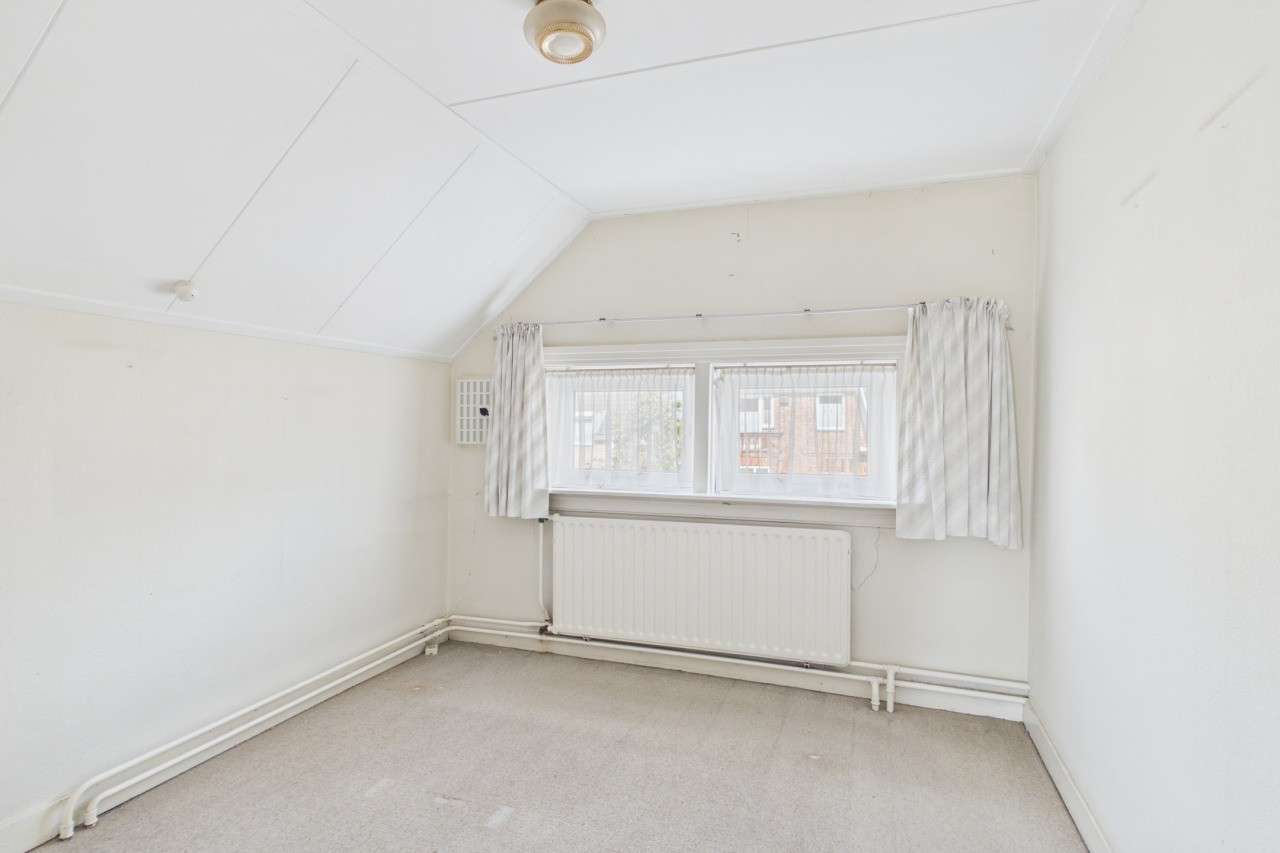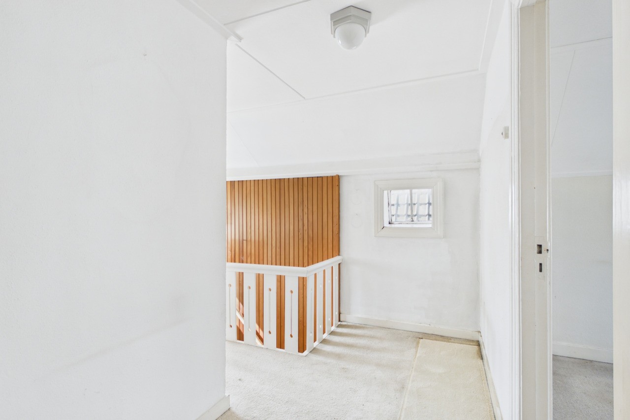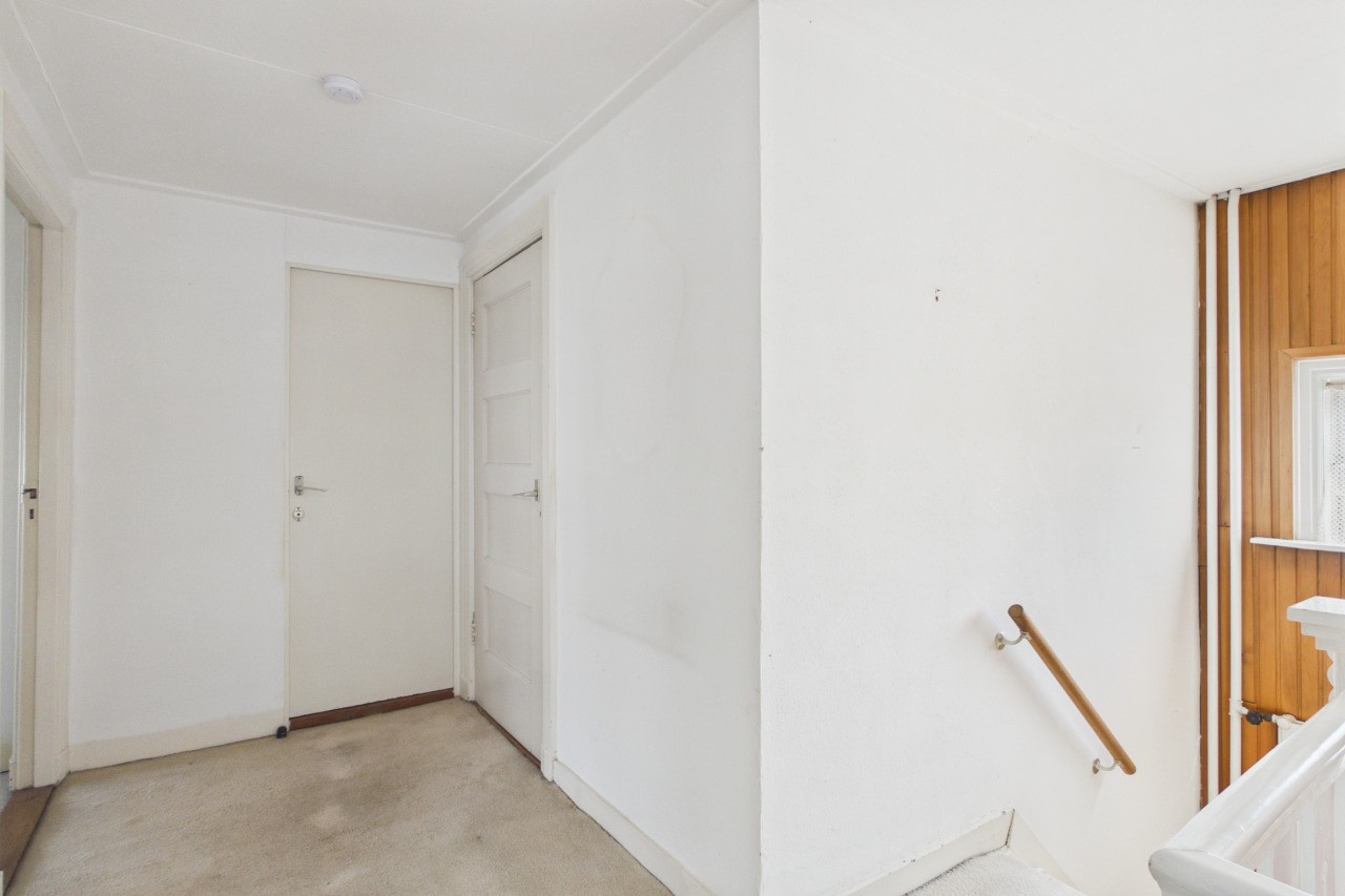 Overloop met toegang tot drie slaapkamers en de badkamer, voorzien van wastafel, ligbad en toilet. Via een luik in de achterste slaapkamer is de bergzolder bereikbaar. De woning beschikt over een Franse kapconstructie.