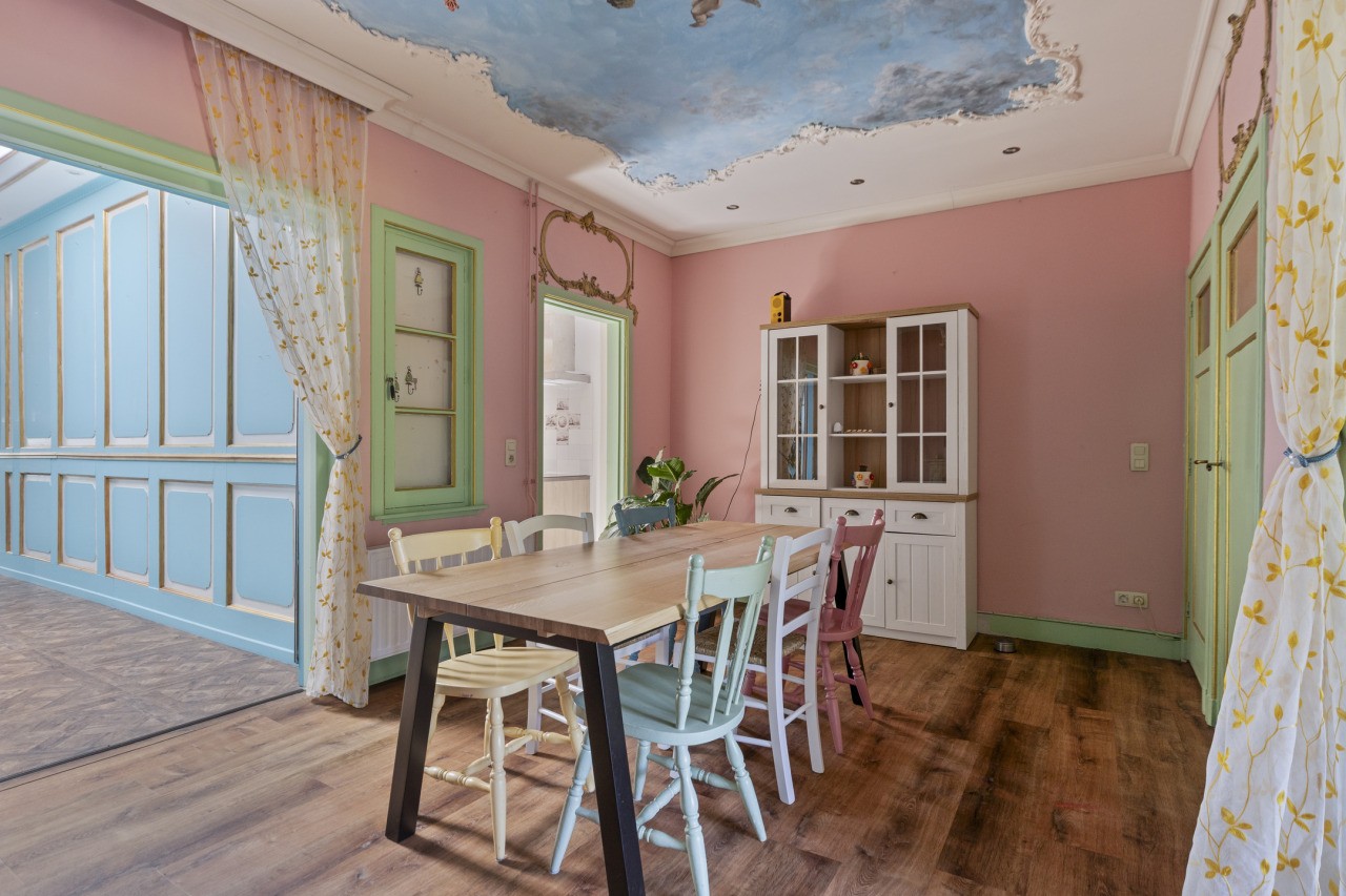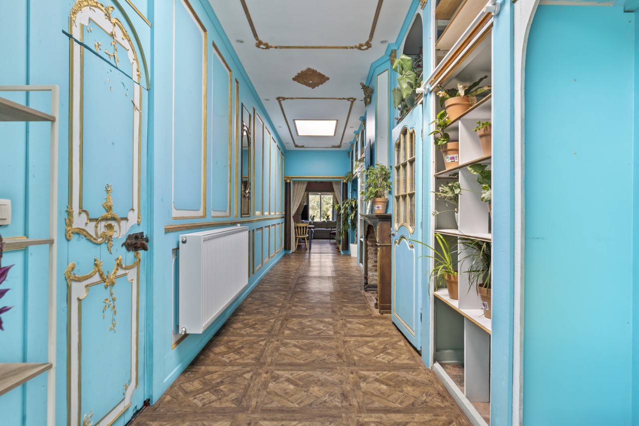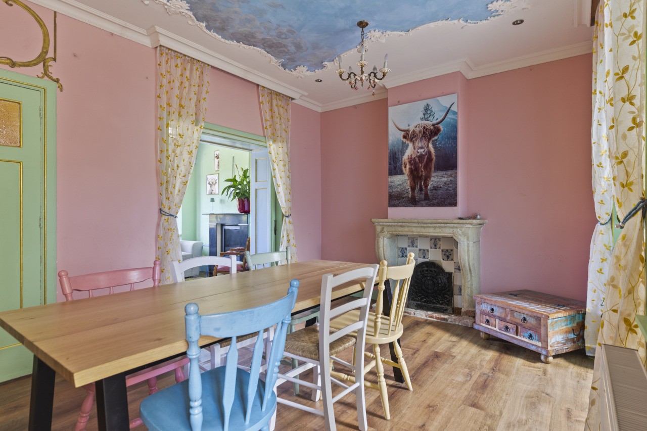 Achter de klassieke gevel ligt een verrassend ruime woning. In de hal vind je originele vloertegels en paneeldeuren, en ook de woonkamer ademt sfeer met een erker, kamer-en-suite en een gashaard. De eetkamer vormt het hart van het huis, met sierplafond, zandstenen schouw en toegang tot de kelder, keuken en aanbouw. Beide kamers zijn voorzien van een solide betonvloer.