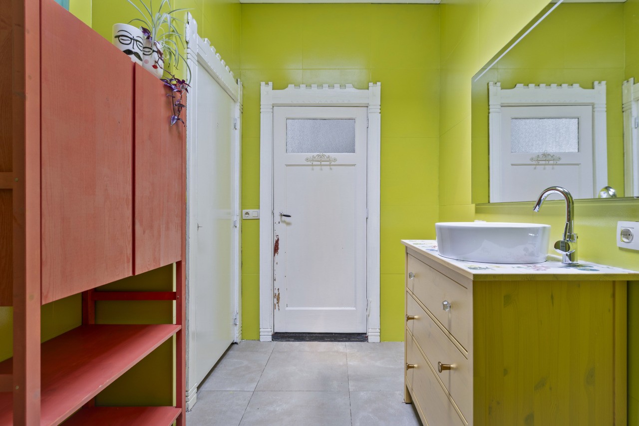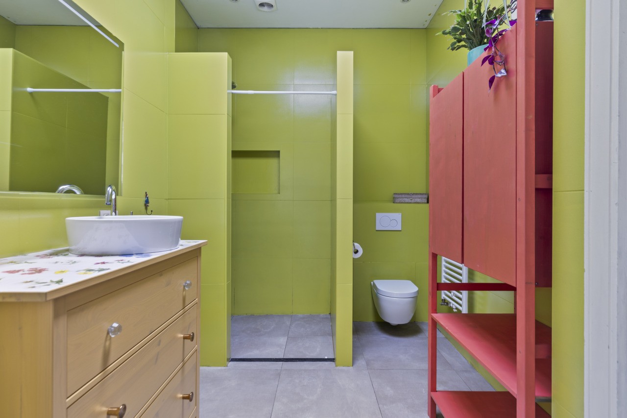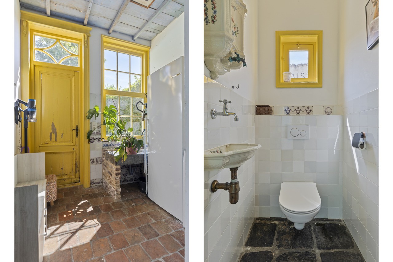 De moderne badkamer is ruim opgezet met inloopdouche, dubbele wastafel en tweede toilet. In de aangrenzende bijkeuken vind je charmante details zoals een antieke pomp en een houten plafond van een oude bedstee. Ook is er een aparte toiletruimte, afgewerkt met een authentieke dallenvloer uit 1620.