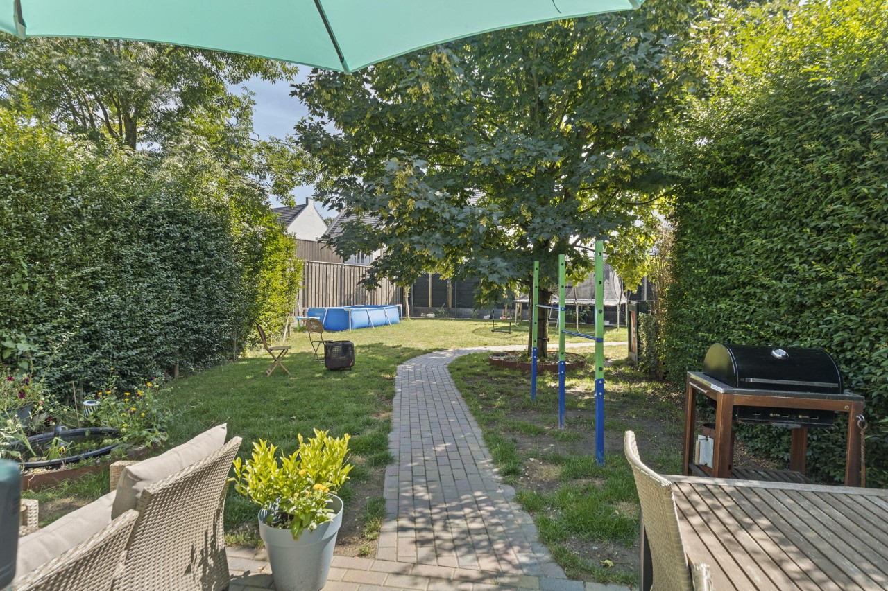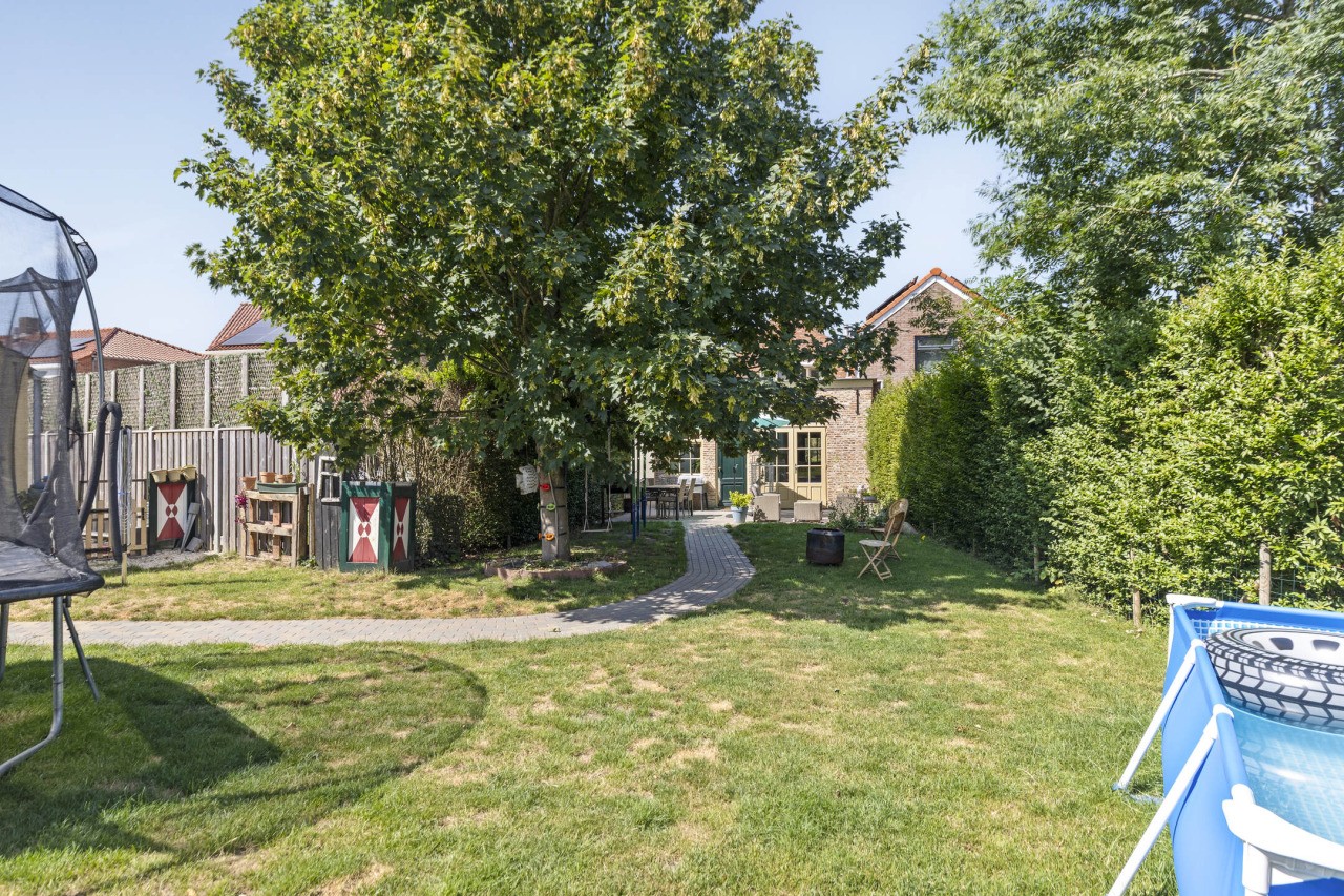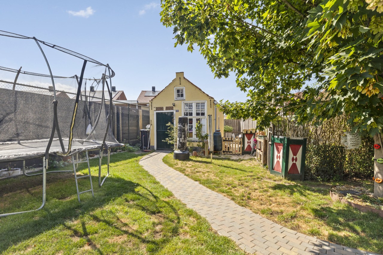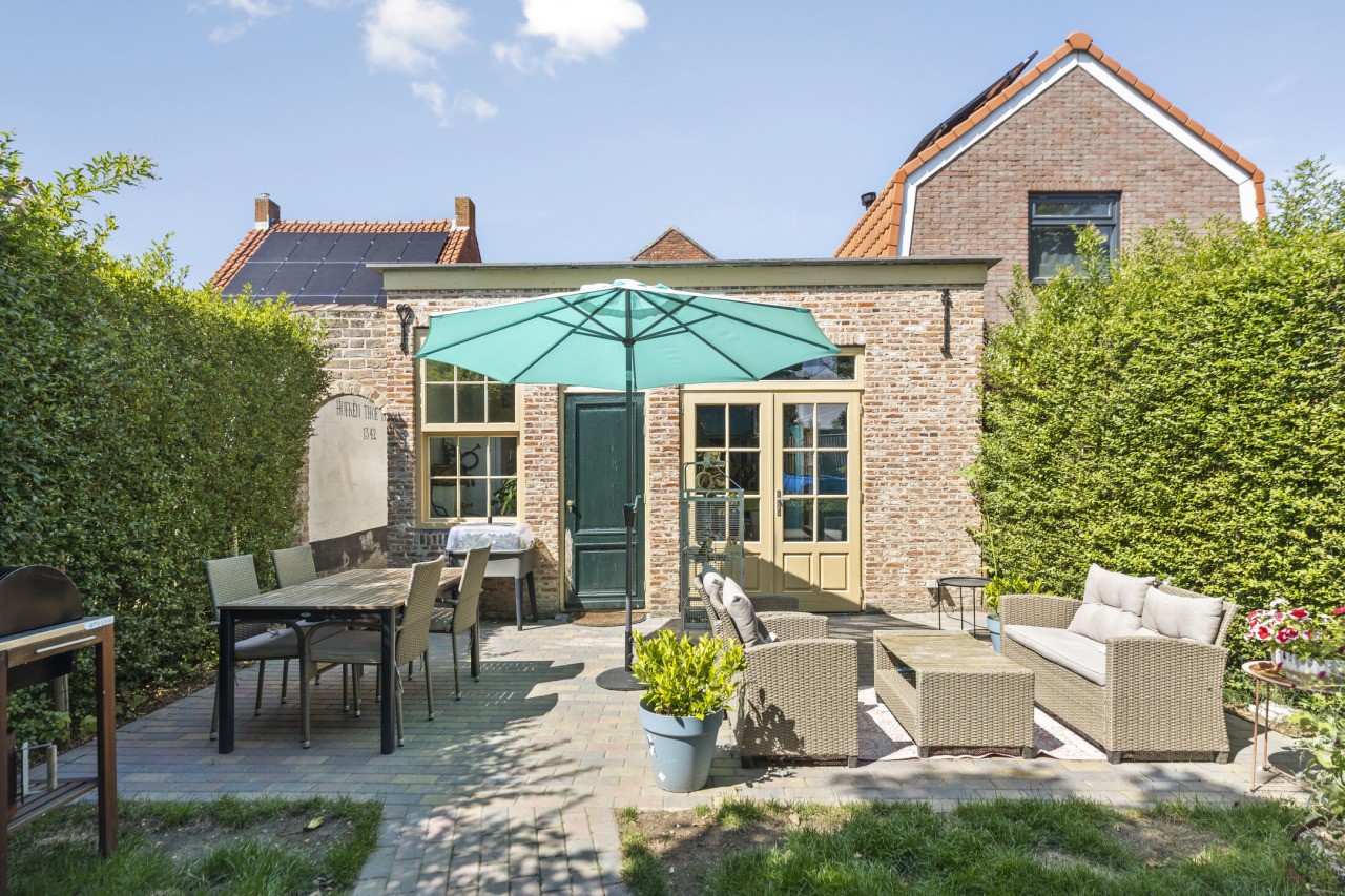 De diepe, zonnige tuin op het zuiden is een groene oase vol rust en privacy. Je vindt er een prieeltje, een ruime stenen schuur in historische stijl en een achterom via het zijpad. De achtergevel van de woning, opgebouwd uit 17e-eeuwse bakstenen, is een plaatje op zich.
