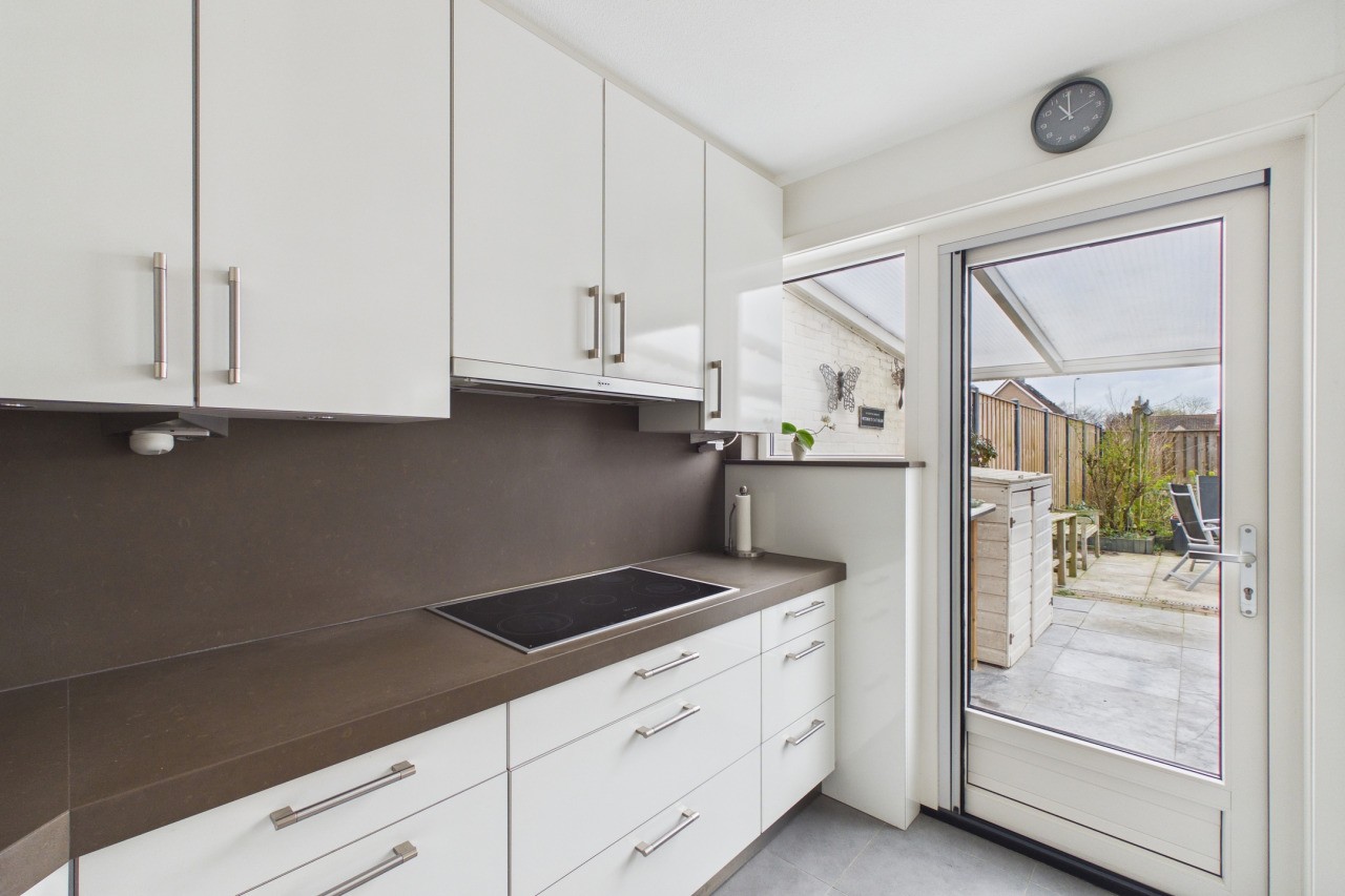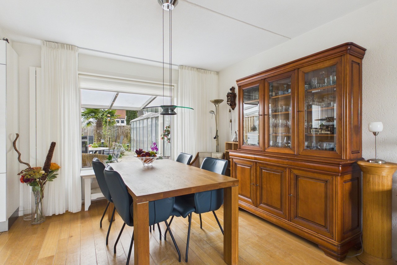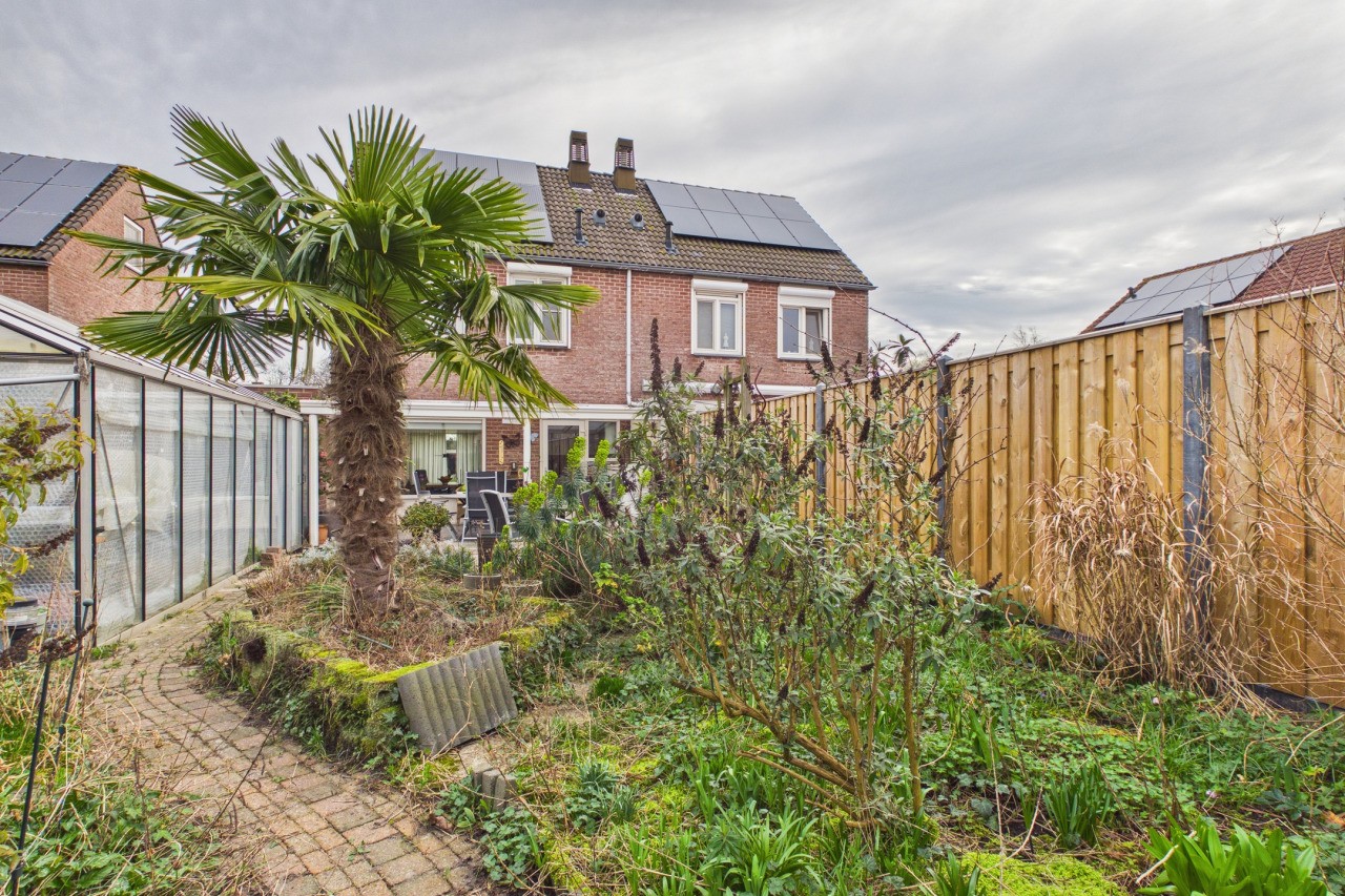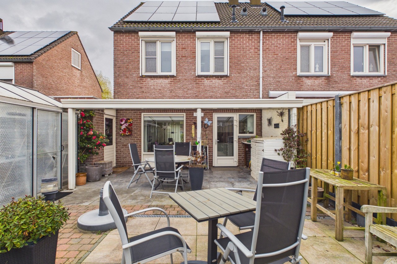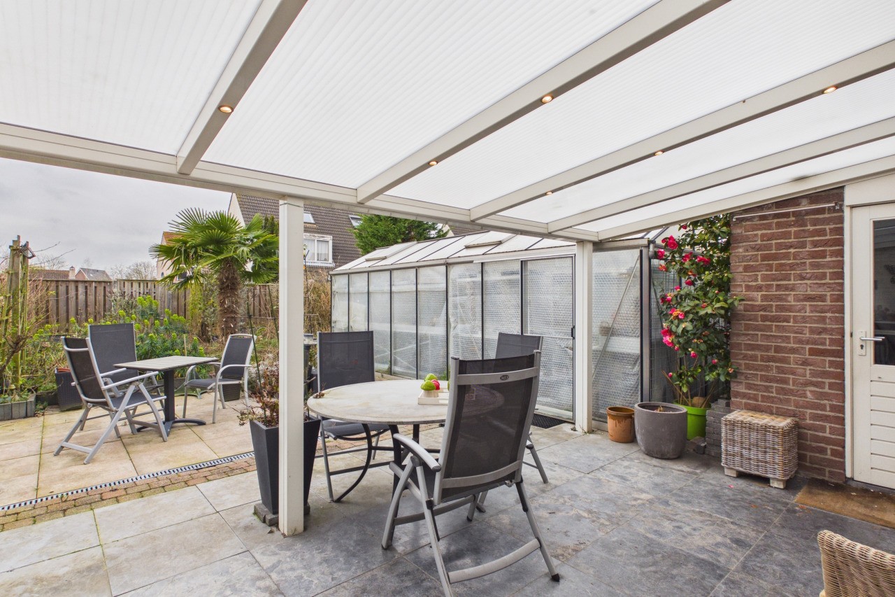 De ruime achtertuin, met eigen achterom, is gelegen op het westen, waardoor je hier volop van de middag- en avondzon kunt genieten. De tuin is verzorgd aangelegd met een terras en diverse bloem- en plantenborders, wat zorgt voor een sfeervol geheel. De aangebouwde overkapping aan de woning vormt een heerlijke verlenging van de leefruimte; hier kun je ook met wat minder weer comfortabel buiten zitten en genieten van het buitenleven. Daarnaast is er een kas aanwezig voor de liefhebber van tuinieren. Vanuit de tuin heb je toegang tot de ruime garage, welke is voorzien van elektra en een extra keukenblok, ideaal voor hobby’s, opslag of extra werkruimte.