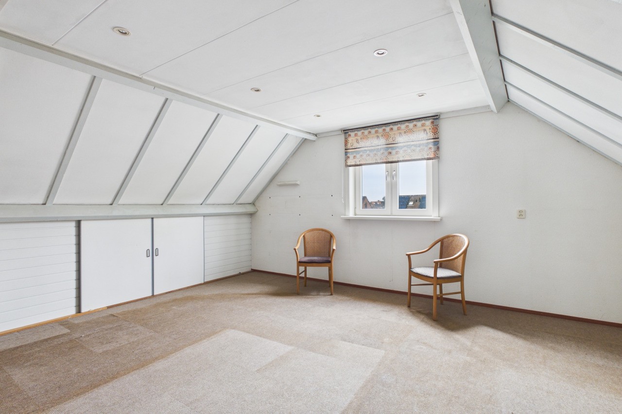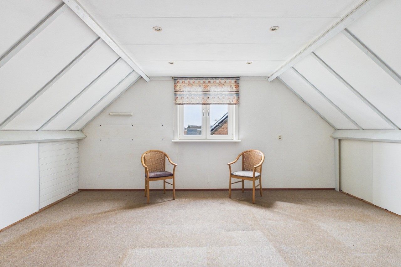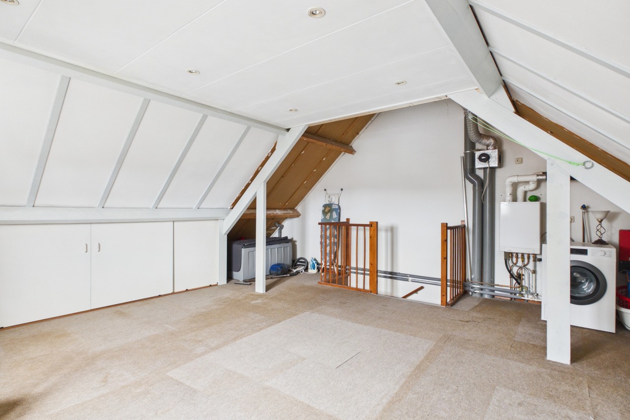 De tweede verdieping bestaat uit een ruime zolderverdieping die zich uitstekend leent als vierde slaapkamer. Ook is deze ruimte zeer geschikt als werk- of hobbykamer. Achter de knieschotten bevindt zich bovendien veel praktische bergruimte, waardoor je hier verrassend veel kunt opbergen.