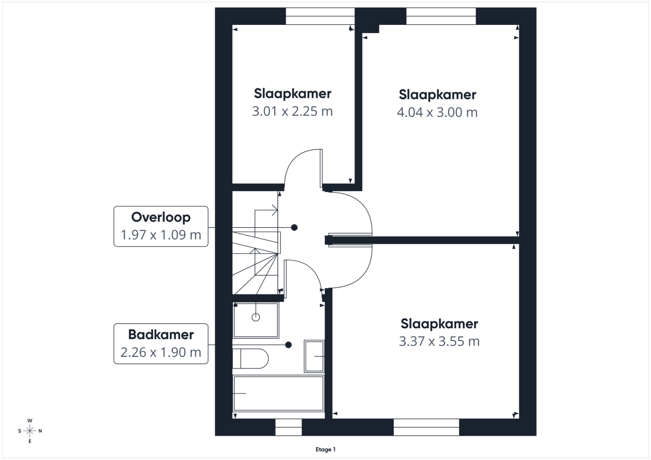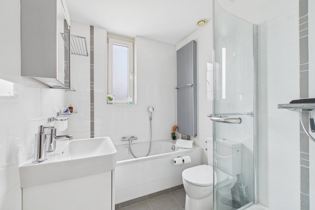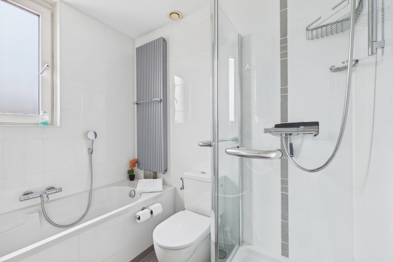 Op de eerste verdieping kom je uit op de overloop die toegang geeft tot drie slaapkamers. De kamers zijn stuk voor stuk netjes afgewerkt en bieden voldoende ruimte voor slapen, werken of studeren. De badkamer is compleet uitgevoerd met een ligbad, douchecabine, wastafel met meubel, toilet en een designradiator.