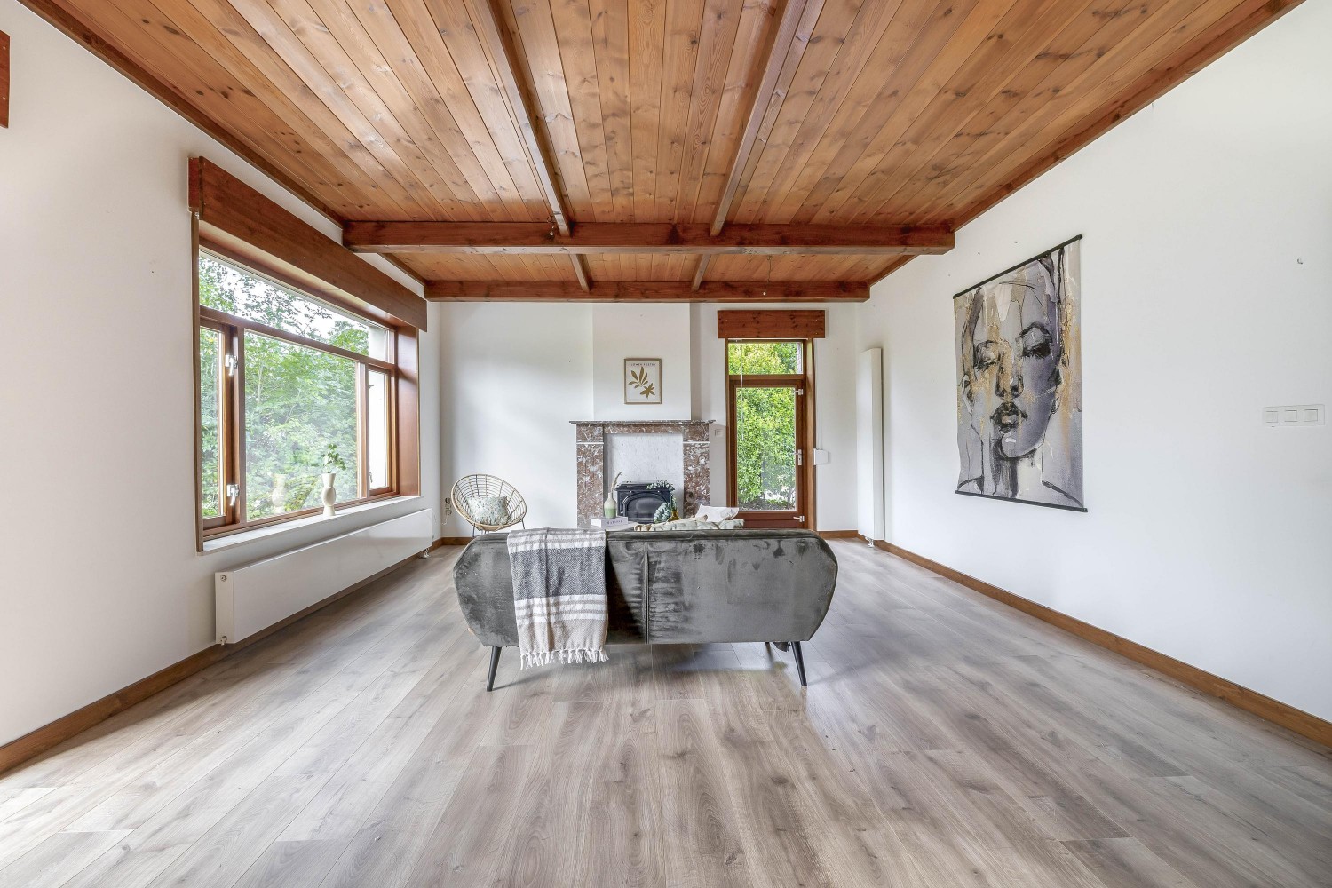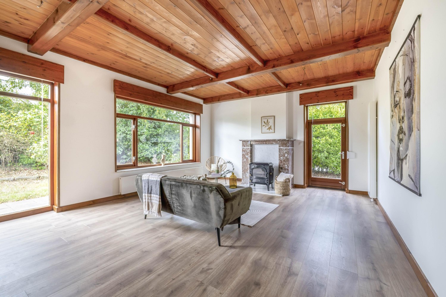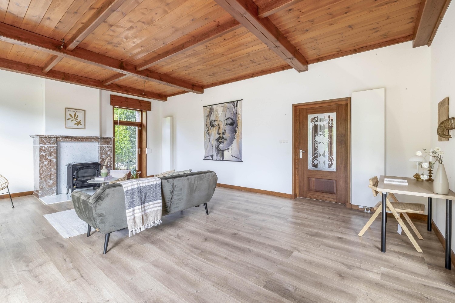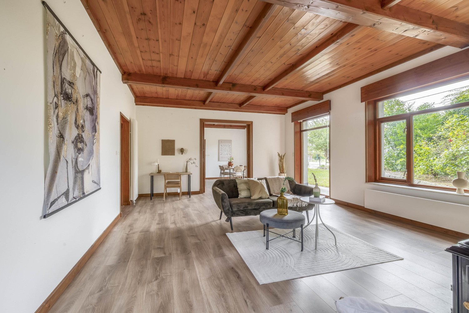 - Vanuit deze kamer bereik je de royale woonkamer met schouw en kachel, een sfeervolle plek met veel ruimte.