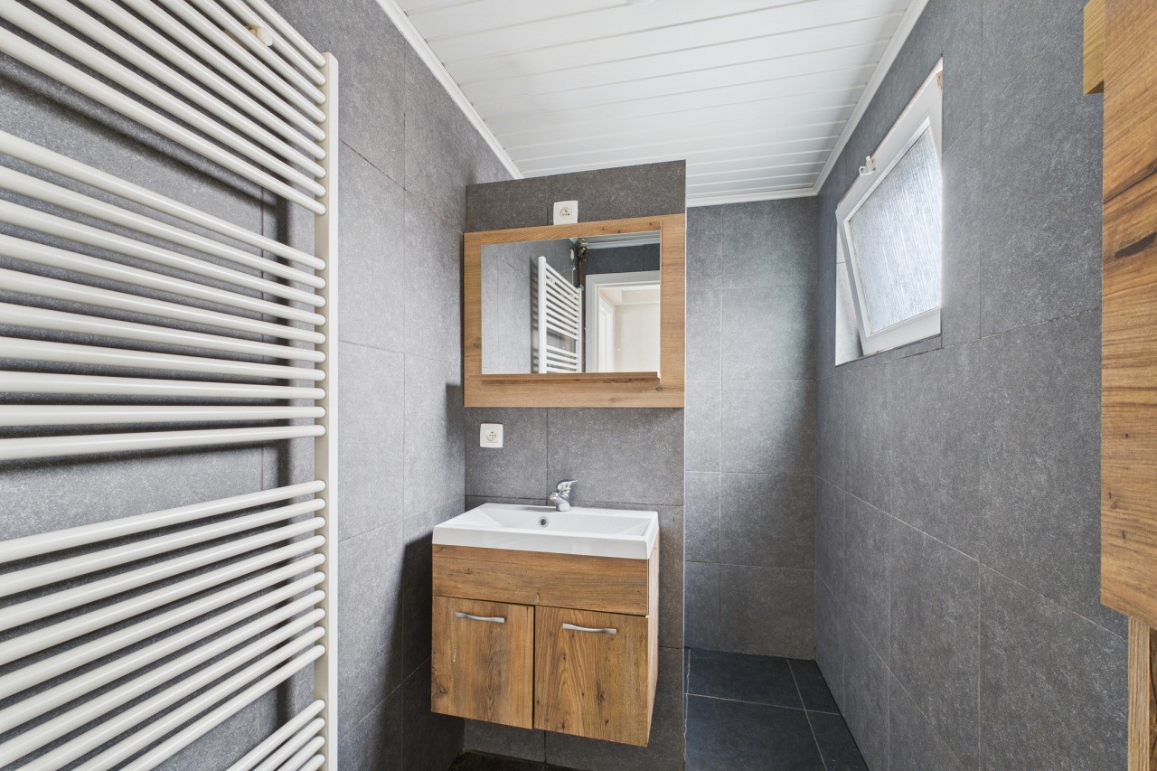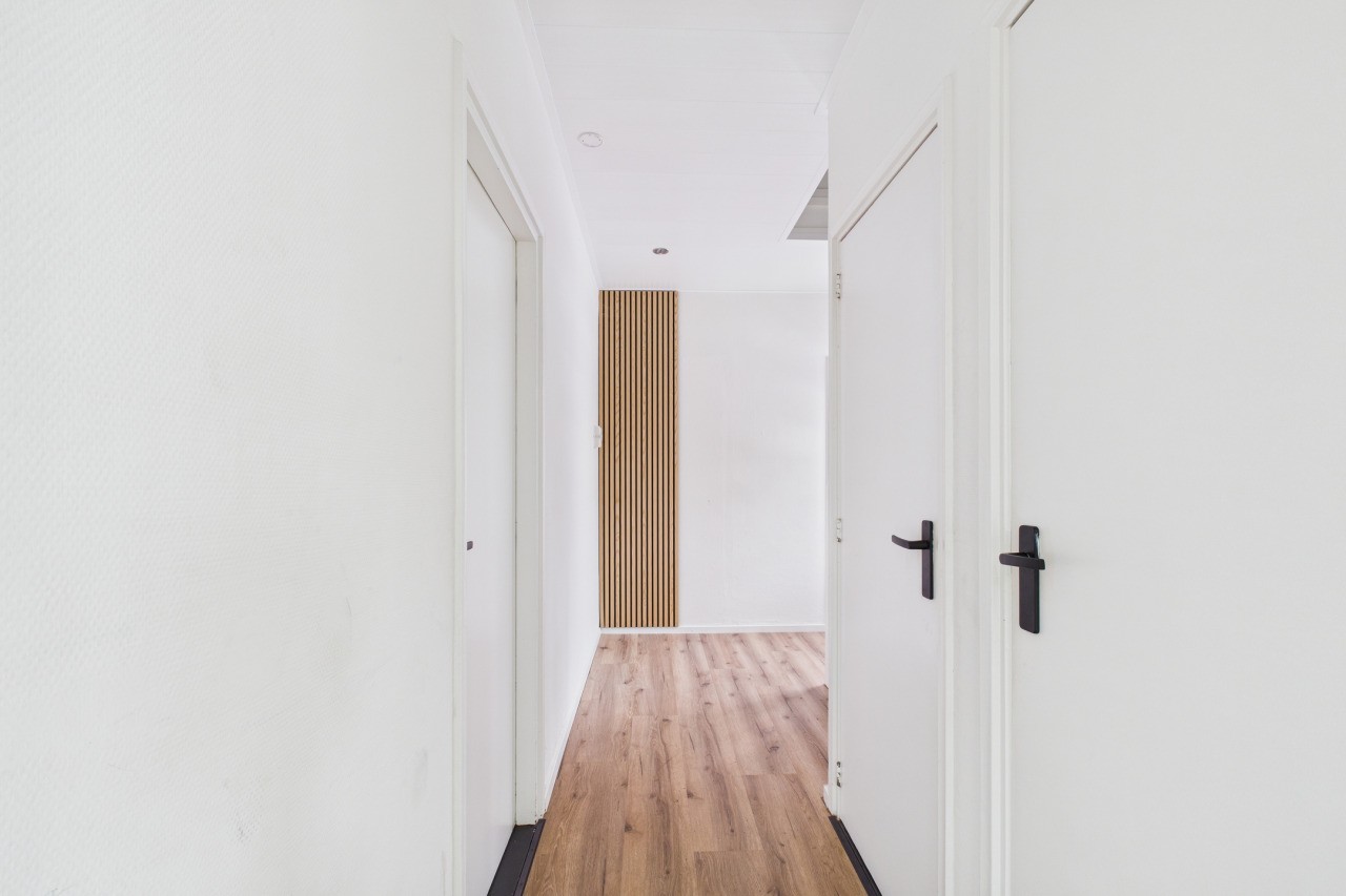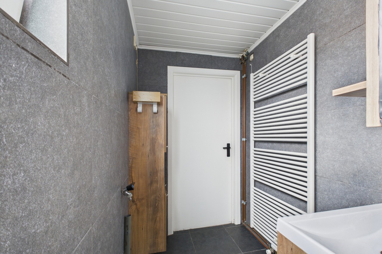 Via de entree kom je binnen in de hal, waar zich de meterkast, het toilet en de trapopgang naar de verdieping bevinden. Onder de trap is een praktische kelderkast aanwezig. Vanuit de hal heb je zowel toegang tot de woonkamer en de keuken. De ruime L-vormige woonkamer voelt warm en uitnodigend aan, mede dankzij de sfeervolle haard en de nette laminaatvloer. De dichte woonkeuken is royaal opgezet en voorzien van een modern keukenblok in een praktische hoekopstelling met de benodigde inbouwapparatuur. Vanuit de keuken bereik je een tussenportaal dat toegang geeft tot de moderne badkamer. Deze is ingericht met een inloopdouche, een wastafel met meubel, een bergkast en een designradiator. Ook zijn hier de aansluitingen voor de witgoedapparatuur te vinden. Vanuit dit portaal geeft de achterdeur toegang tot de tuin.