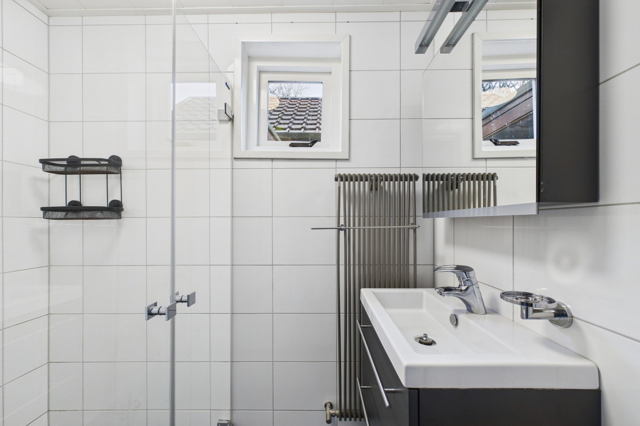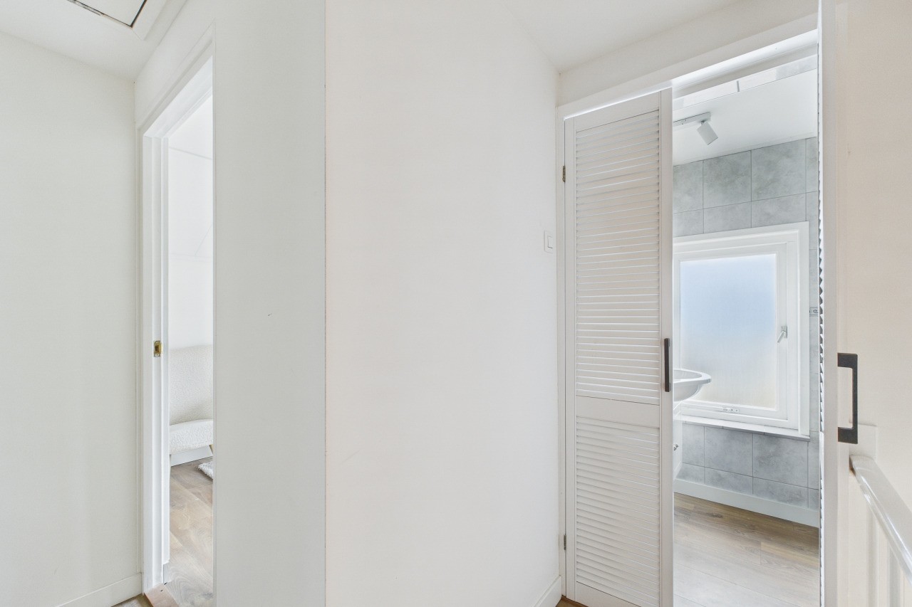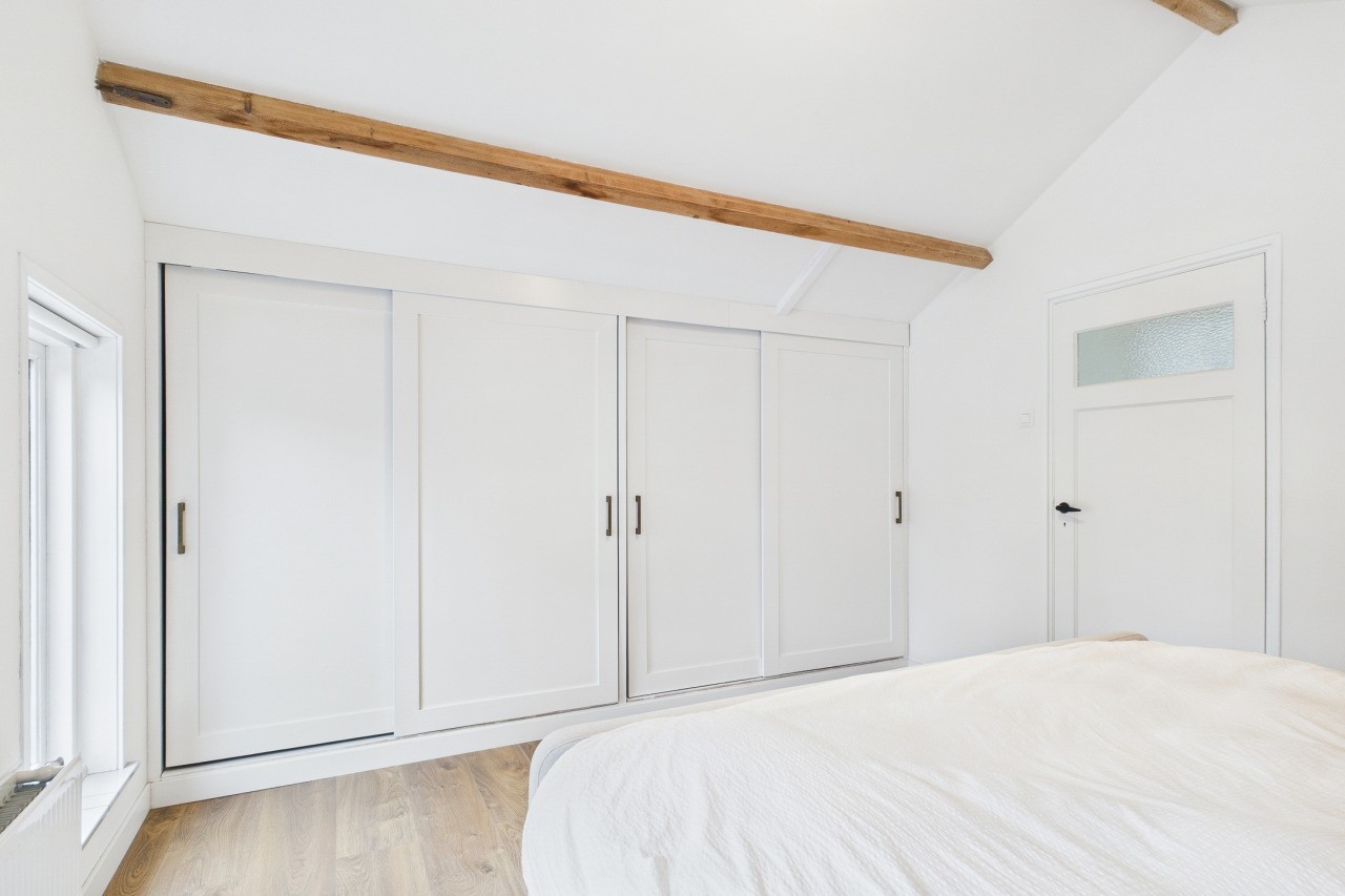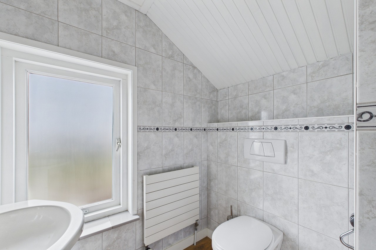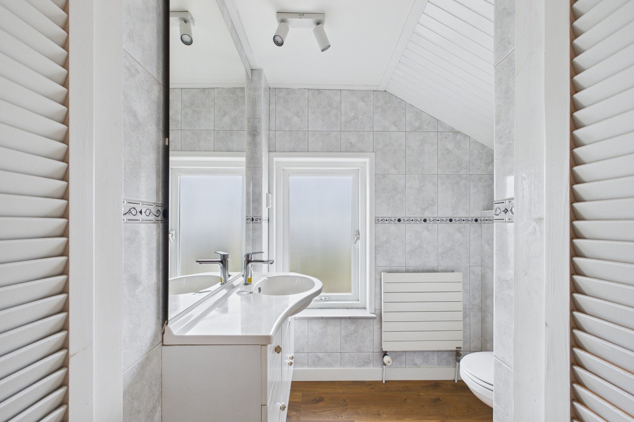 Op de eerste verdieping geeft de overloop toegang tot twee slaapkamers en een royale toiletruimte met wastafel en meubel. De grootste slaapkamer beschikt over een grote inbouwkastenwand, wat veel bergruimte biedt.