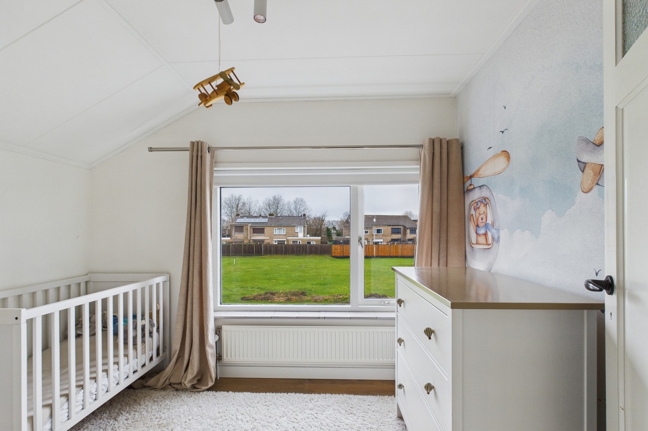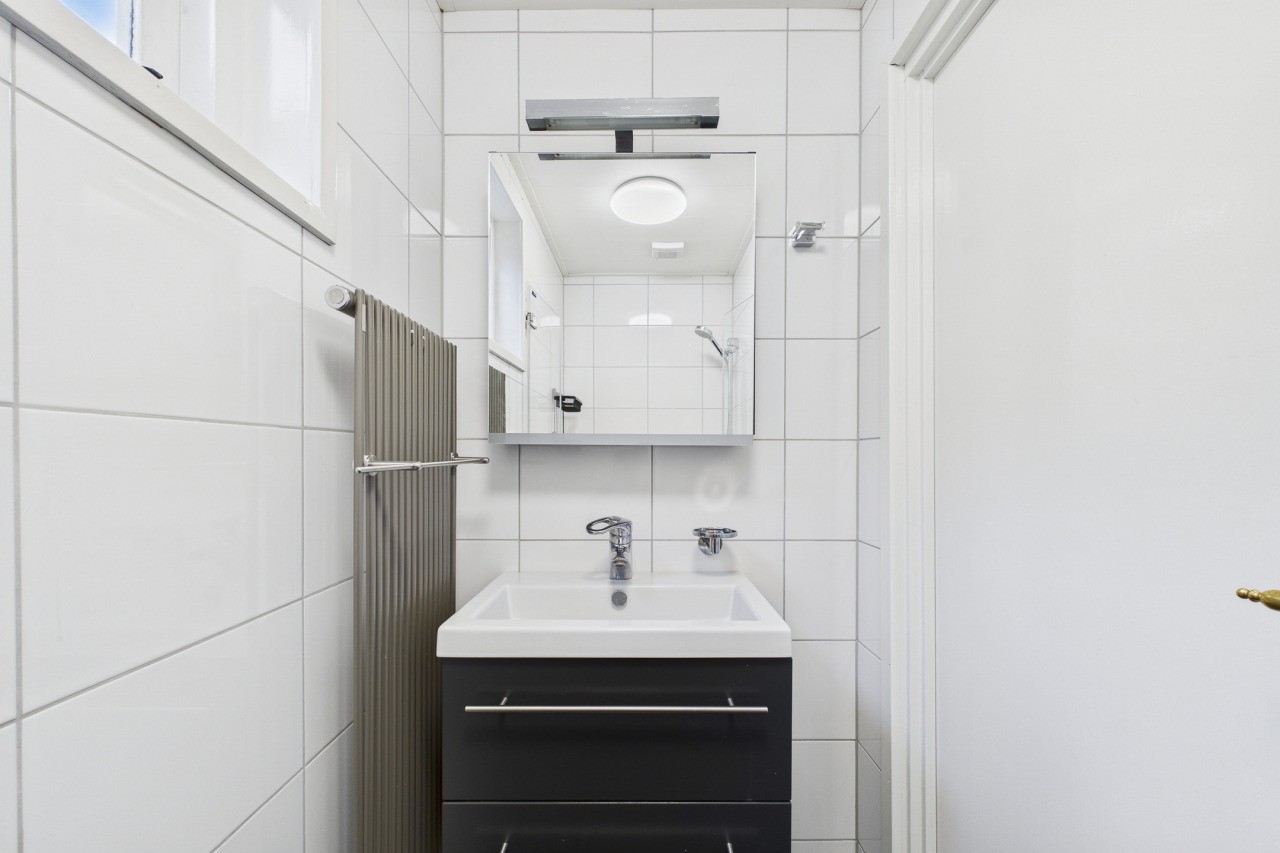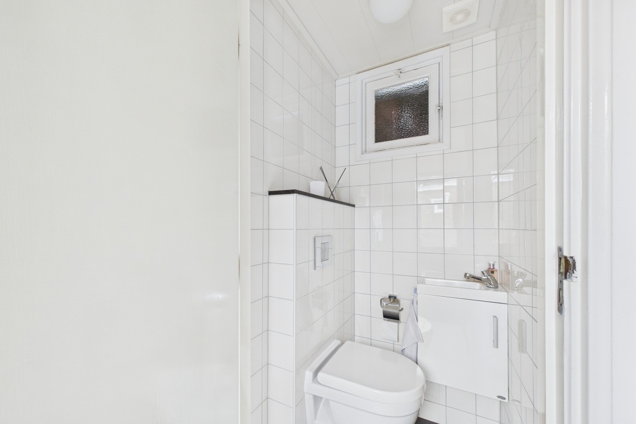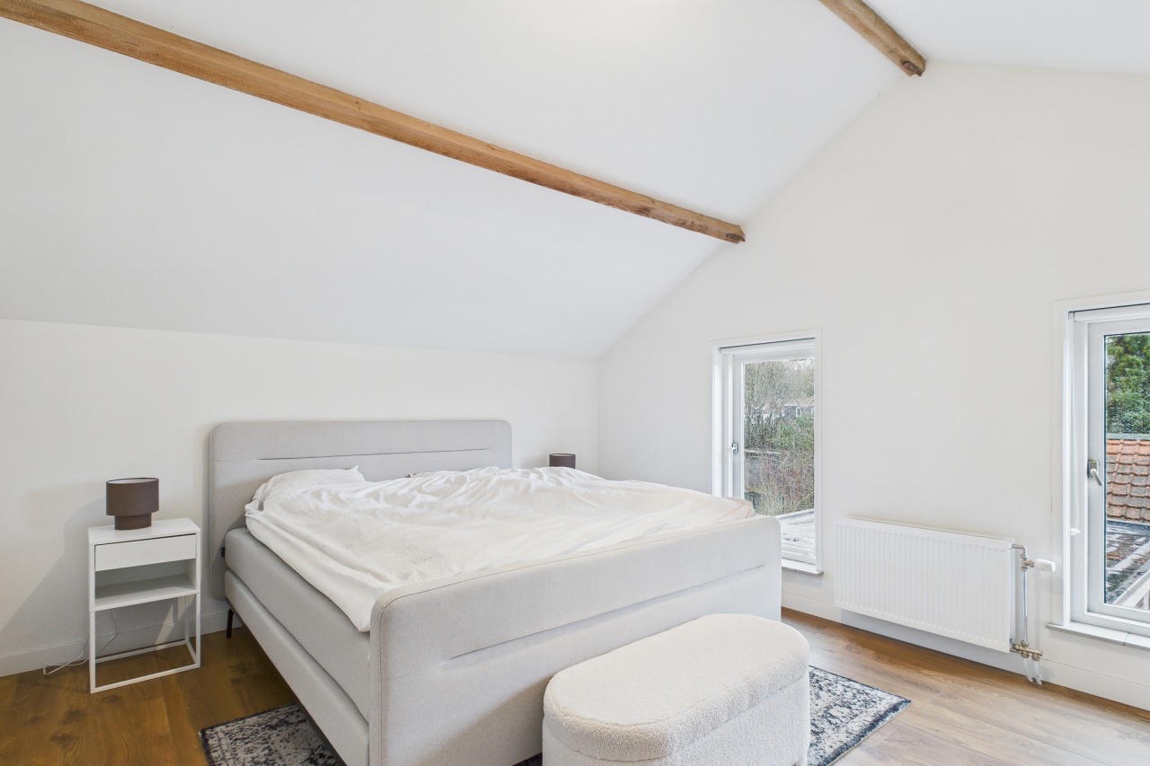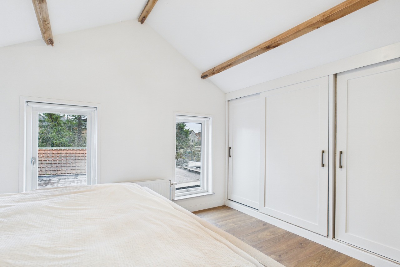 Op de eerste verdieping geeft de overloop toegang tot twee slaapkamers en een royale toiletruimte met wastafel en meubel. De grootste slaapkamer beschikt over een grote inbouwkastenwand, wat veel bergruimte biedt.