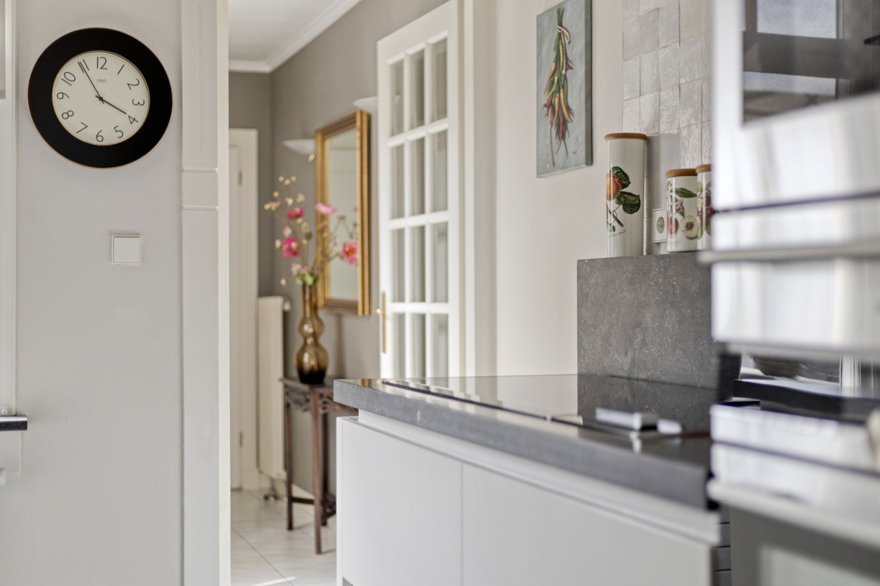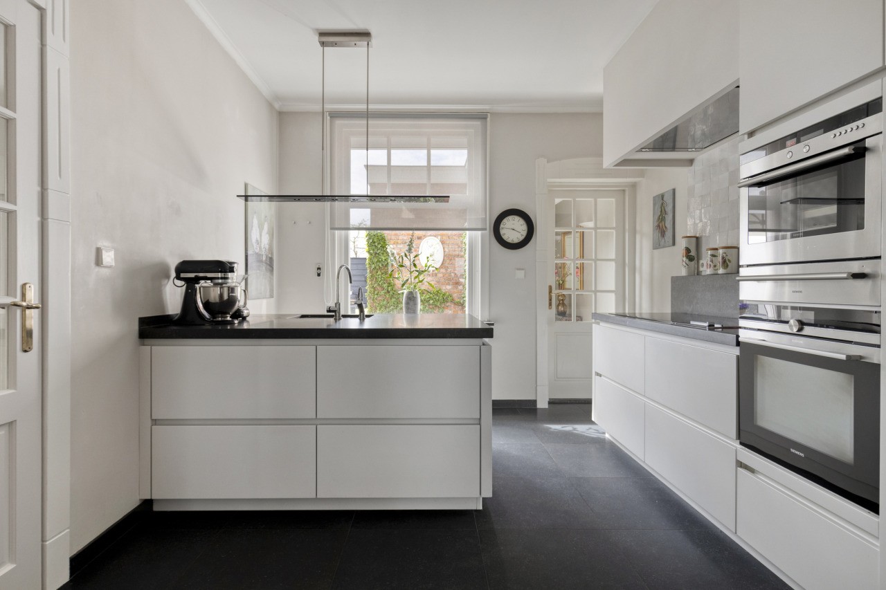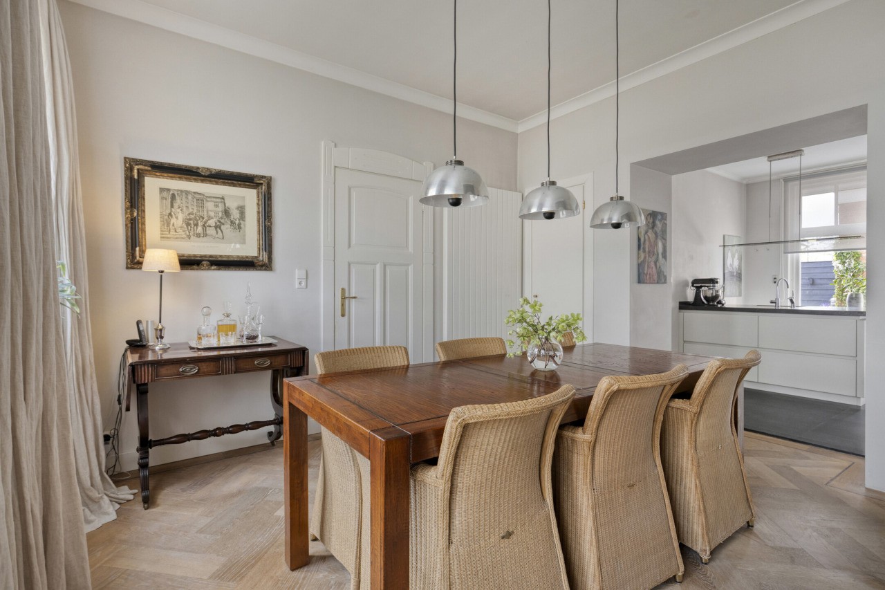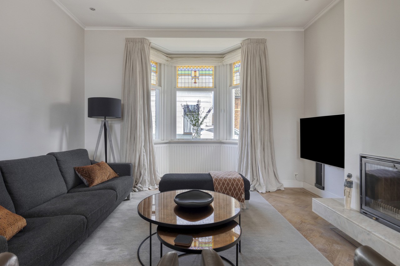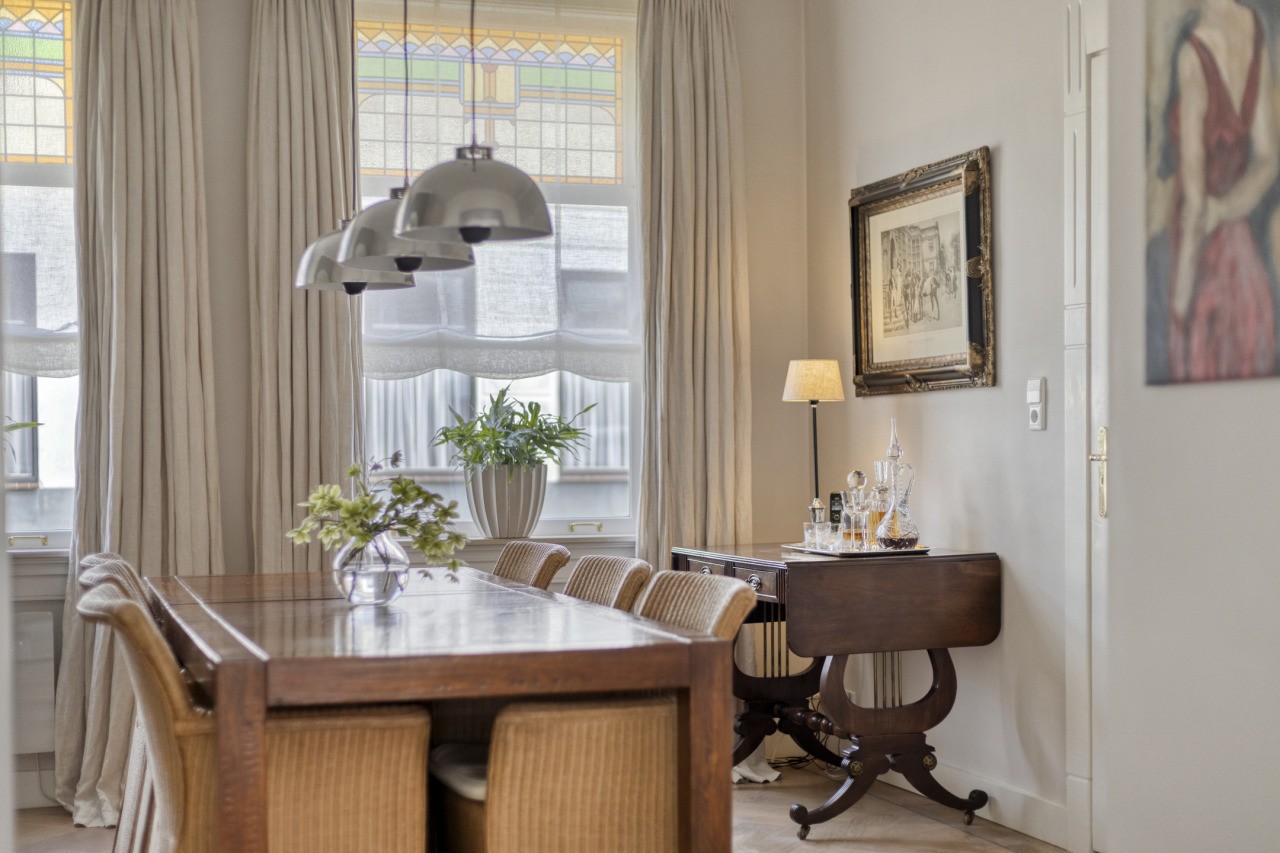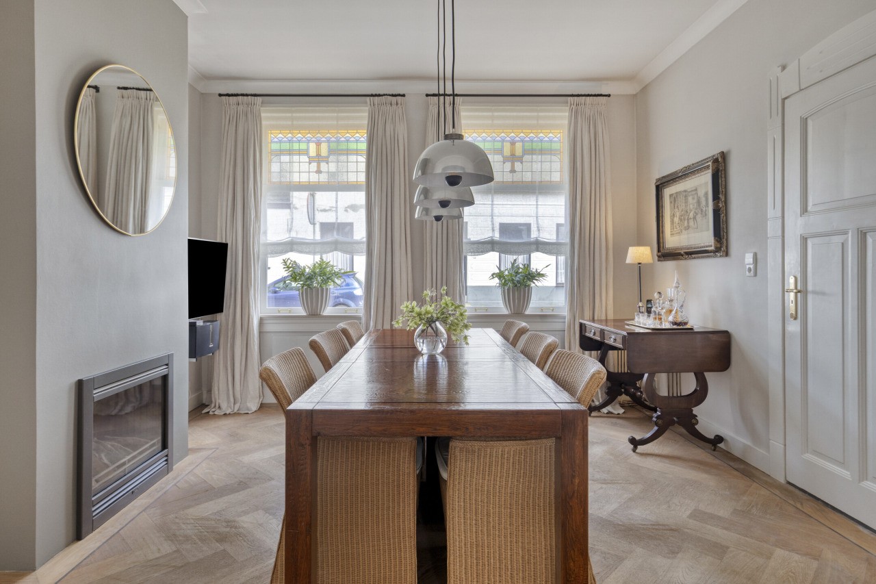 Bij binnenkomst kom je in een lange hal vanuit waar je toegang hebt tot de woonkamer en de keuken, evenals de kelder en de achtertuin, en vind je de trapopgang naar de eerste verdieping. De doorzonwoonkamer is heerlijk licht en voelt uitnodigend aan, met een gezellige haard als centraal punt. Aan de achterzijde bevindt zich de voormalige ensuite eetkamer met directe toegang tot de tuin. Authentieke elementen zoals glas-in-lood, sierlijke lambrisering en originele deurposten zijn hier prachtig bewaard gebleven en geven de ruimte een karaktervolle uitstraling. Aan de andere zijde van de hal ligt de eetkamer die in verbinding staat met de keuken en beschikt over vaste kastruimte. De keuken is verzorgd uitgevoerd en voorzien van inbouwapparatuur en een spoeleiland. Vanuit hier bereik je een tussenhal met toegang tot het toilet, extra bergruimte en de tuin.