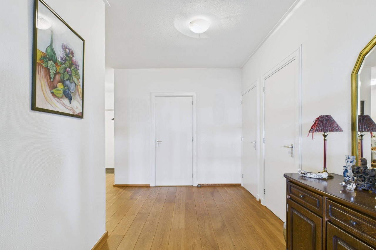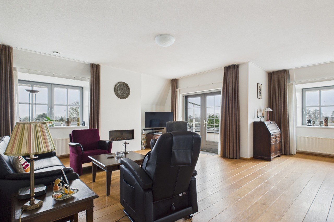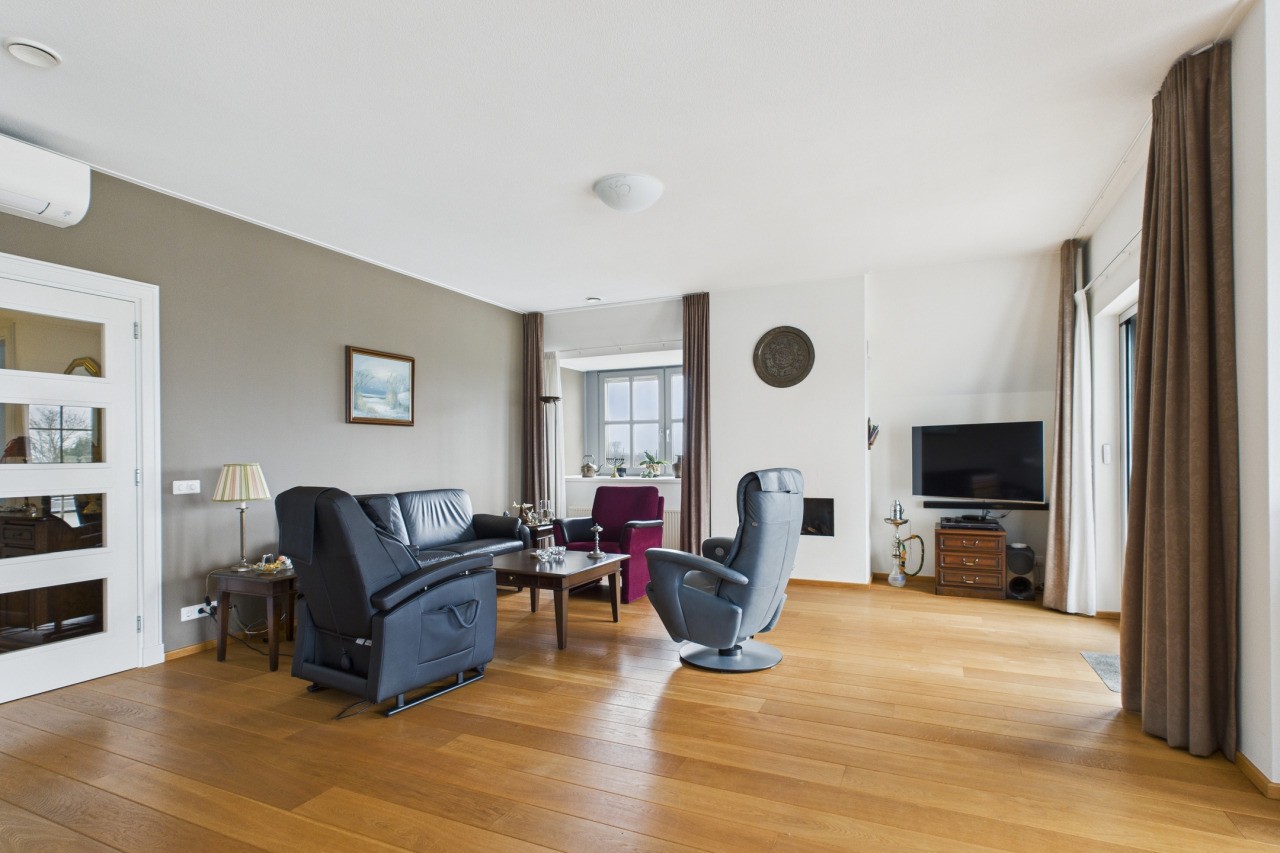 Je komt het appartement binnen in een royale hal met meterkast en videofoon/intercom. De massieve eikenhouten vloerdelen zorgen direct voor een warme, luxe uitstraling. Vanuit de hal bereik je de toiletruimte met hangtoilet en fonteintje. De woonkamer is bijzonder ruim en heerlijk licht (circa 57 m2), voorzien van massieve eikenhouten vloerdelen en een schouw met gashaard. Voor extra comfort is in 2023 bovendien een airco-unit geplaatst, zodat je hier ook op warme dagen aangenaam koel woont. Via de woonkamer is er toegang tot het op het zuiden gelegen balkon (3,8 x 2,3m).
