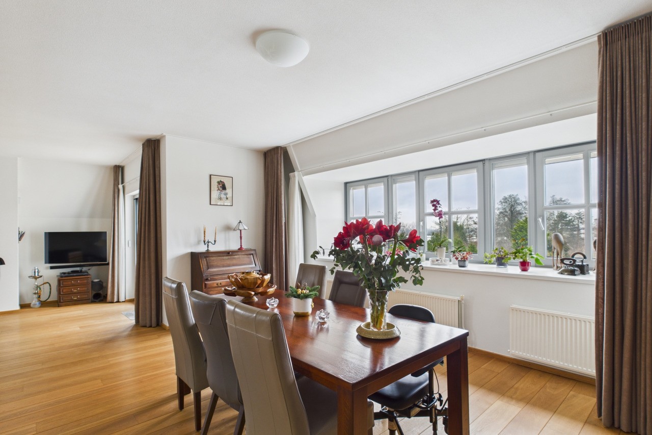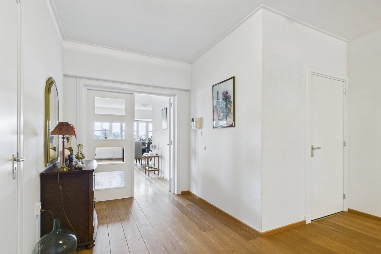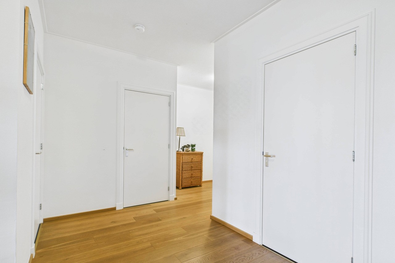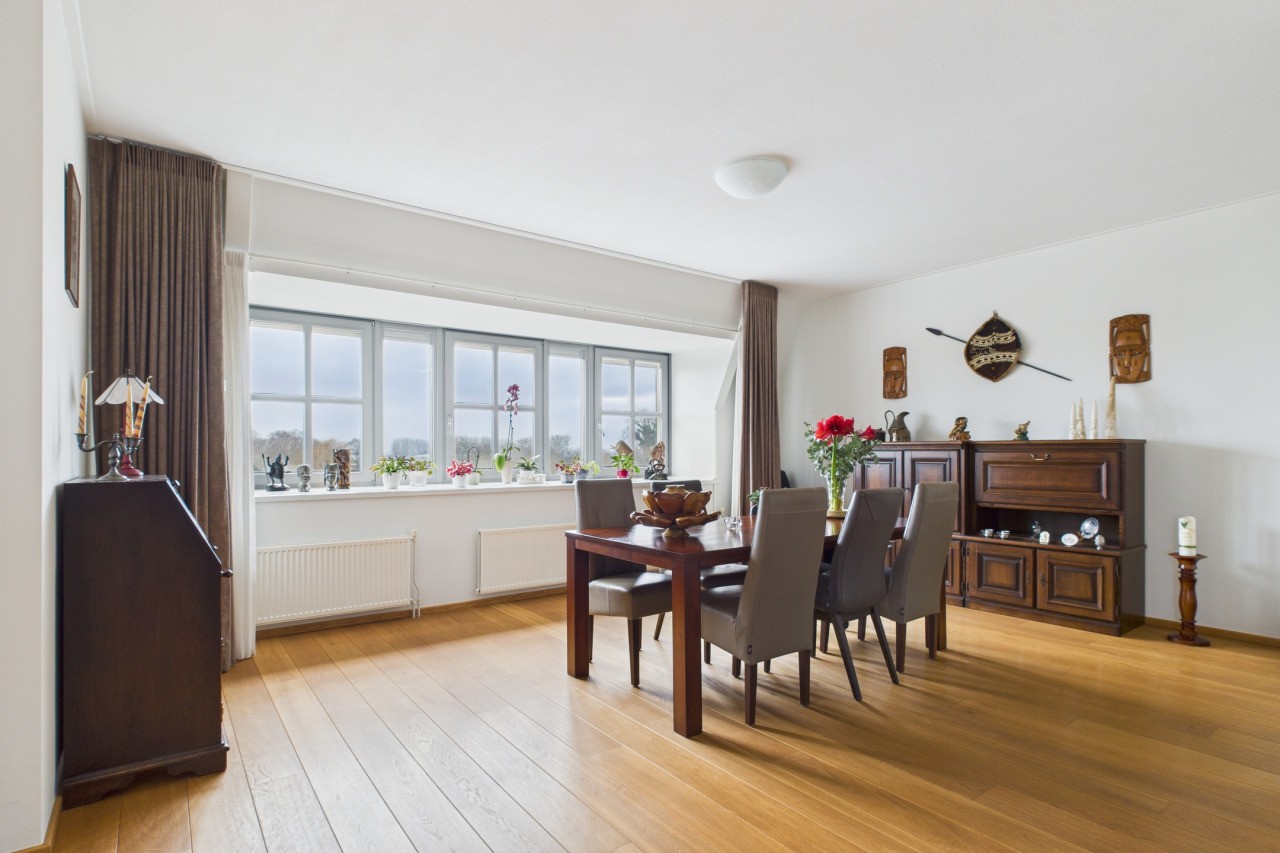 Je komt het appartement binnen in een royale hal met meterkast en videofoon/intercom. De massieve eikenhouten vloerdelen zorgen direct voor een warme, luxe uitstraling. Vanuit de hal bereik je de toiletruimte met hangtoilet en fonteintje. De woonkamer is bijzonder ruim en heerlijk licht (circa 57 m2), voorzien van massieve eikenhouten vloerdelen en een schouw met gashaard. Voor extra comfort is in 2023 bovendien een airco-unit geplaatst, zodat je hier ook op warme dagen aangenaam koel woont. Via de woonkamer is er toegang tot het op het zuiden gelegen balkon (3,8 x 2,3m).