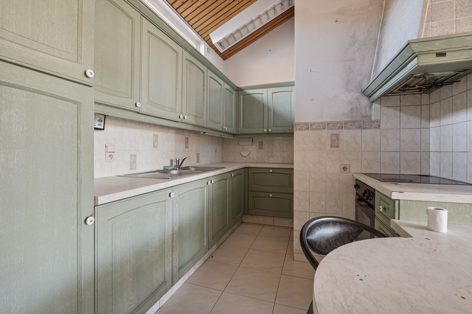 Je komt binnen in de hal met doorgang naar de lichte woonkamer, voorzien van een praktische witte tegelvloer. De keuken in L-opstelling biedt volop werk- en kastruimte en is uitgerust met een oven, keramische kookplaat en koelkast.