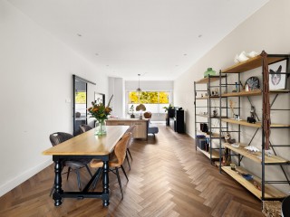 Entrance hall with staircase to the first floor and access to the living room. The spacious and bright living room has a beautiful herringbone floor. Through the stylish steel ensuite doors you enter the modern kitchen where you can enjoy cooking and dining. The kitchen is fitted with a kitchen unit, cooking and sink island and equipped with all conceivable built-in appliances; an induction hob with integrated extractor (Whirlpool), oven, microwave, fridge, dishwasher, freezer and a quooker. The living room and kitchen have designer air conditioning. From the kitchen, you step out onto the sunny balcony. Here it is lovely to sit and enjoy a snack and a drink. The stairs from the balcony lead to the cosy west-facing garden.