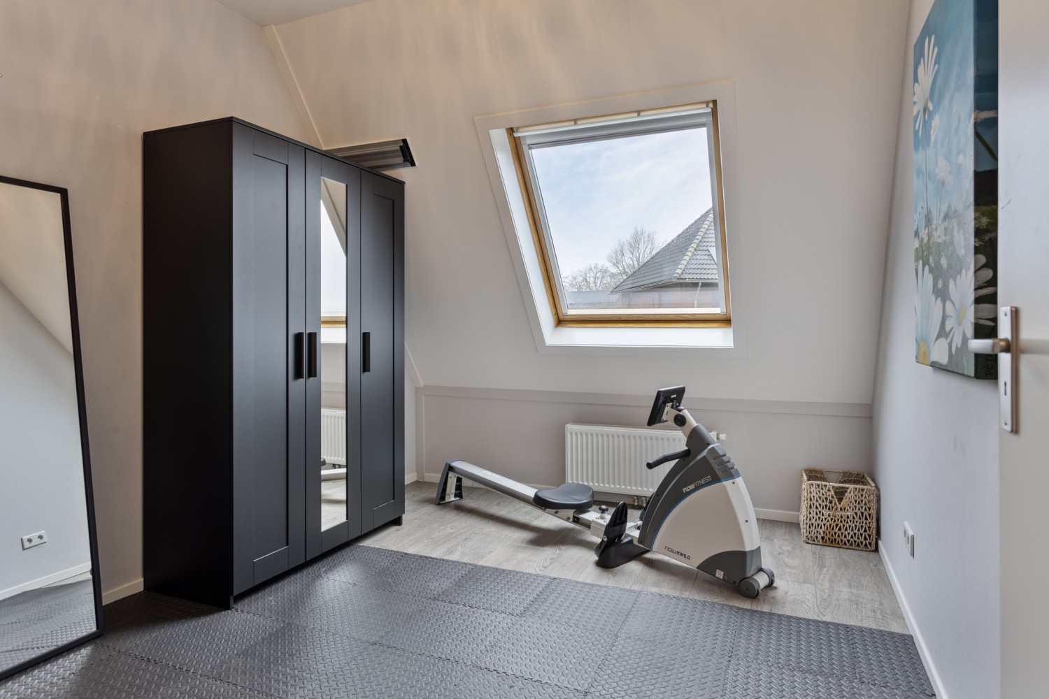 Via de vaste trap bereik je de tweede verdieping, die verrassend veel ruimte biedt. Hier is een sfeervolle vierde slaapkamer gerealiseerd, met grote dakramen die zorgen voor veel natuurlijk licht. Het is een plek die direct prettig aanvoelt – ruim genoeg voor een groot bed en een bureau, maar ook knus genoeg om er een gezellige logeerkamer of inspirerende werkruimte van te maken.