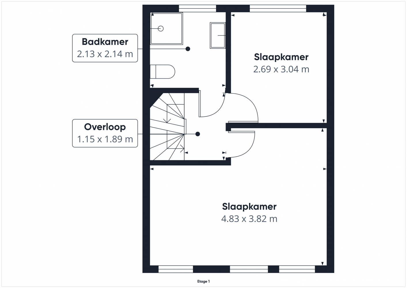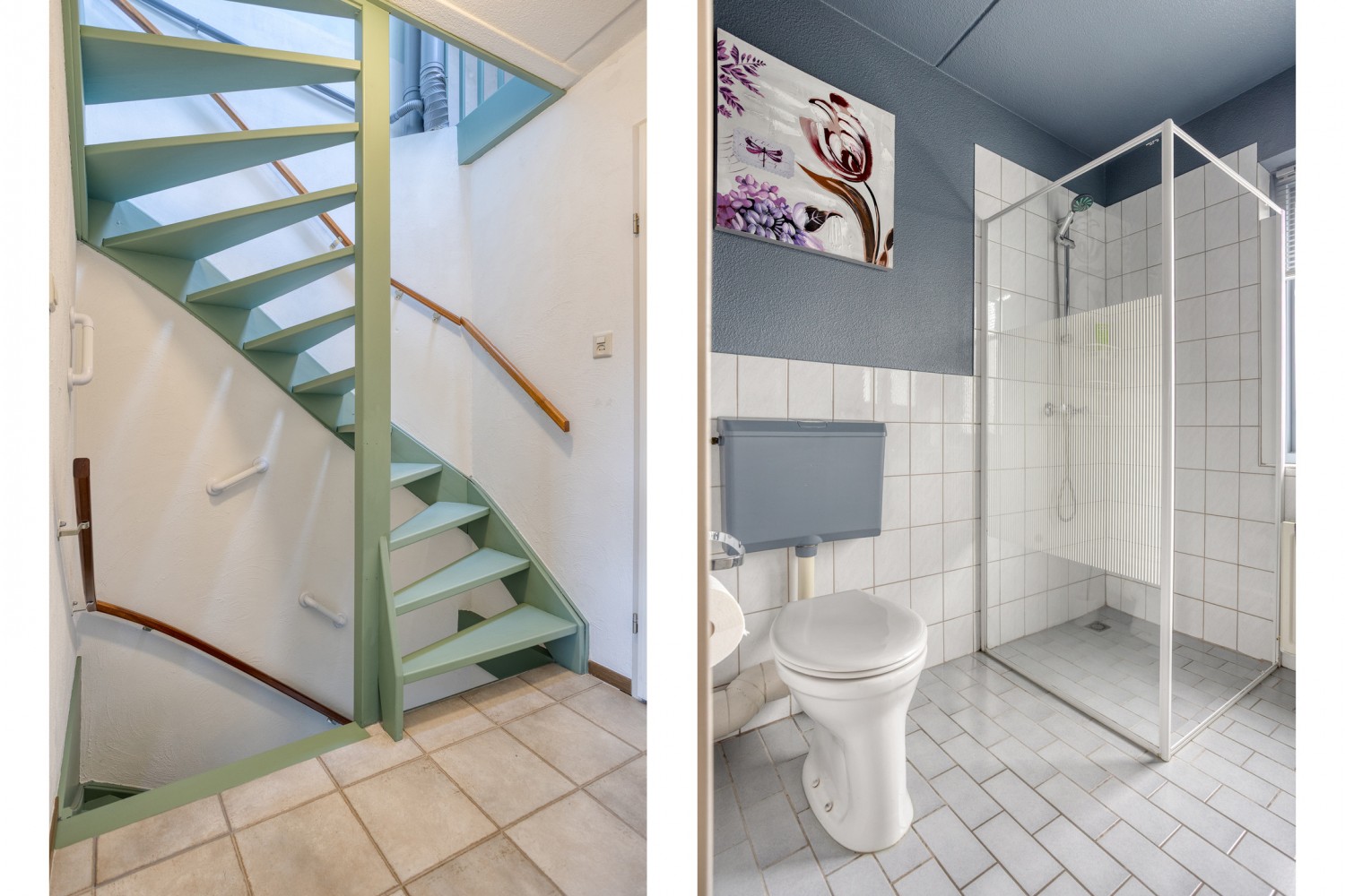 Op de eerste verdieping leidt de overloop naar twee slaapkamers, waarvan één extra ruim en gelegen aan de voorzijde van de woning. De badkamer is praktisch ingericht met een douche, toilet en wastafel.