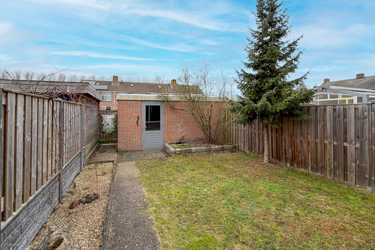 De tuin ligt op het zuidwesten, dus reken op fijne middag- en avondzon. Achterom aanwezig, en daarnaast een stenen berging van circa 11 m2: ideaal voor fietsen, gereedschap en tuinspullen.