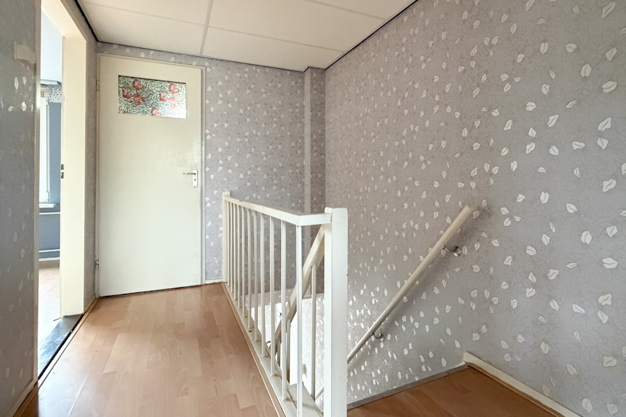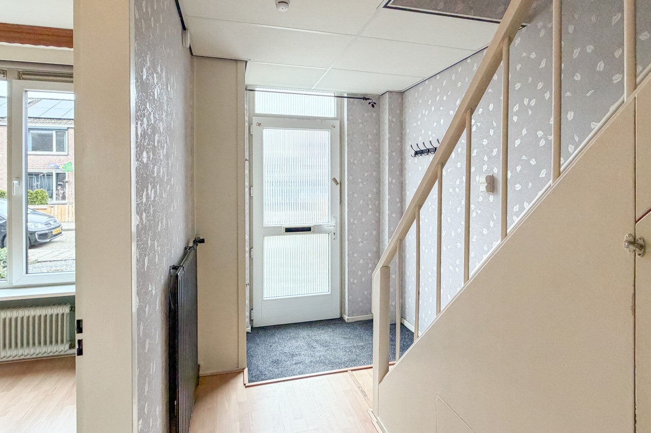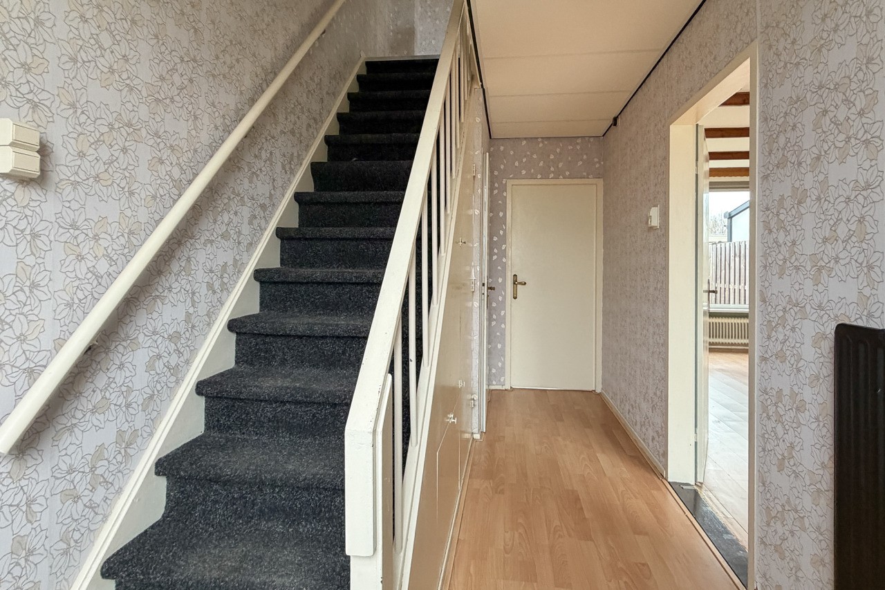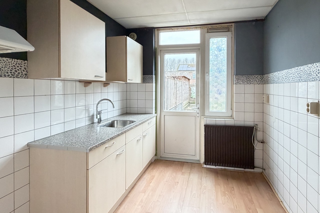 Je komt binnen in de hal met meterkast, trapopgang, trapkast en een toilet. De woonkamer is een echte doorzonwoonkamer: lekker licht, met een prettige indeling. De keuken is gesloten en voorzien van een eenvoudig keukenblok (zonder apparatuur).
