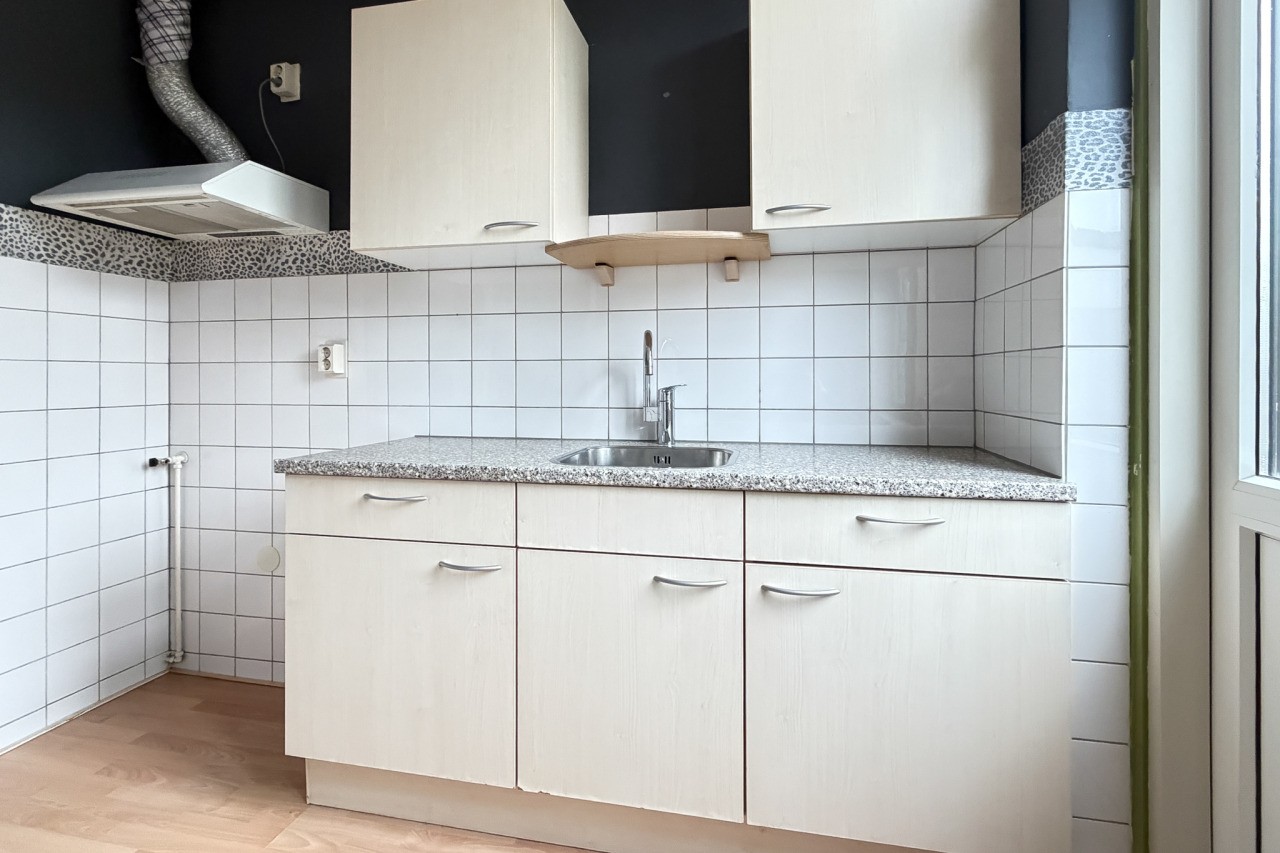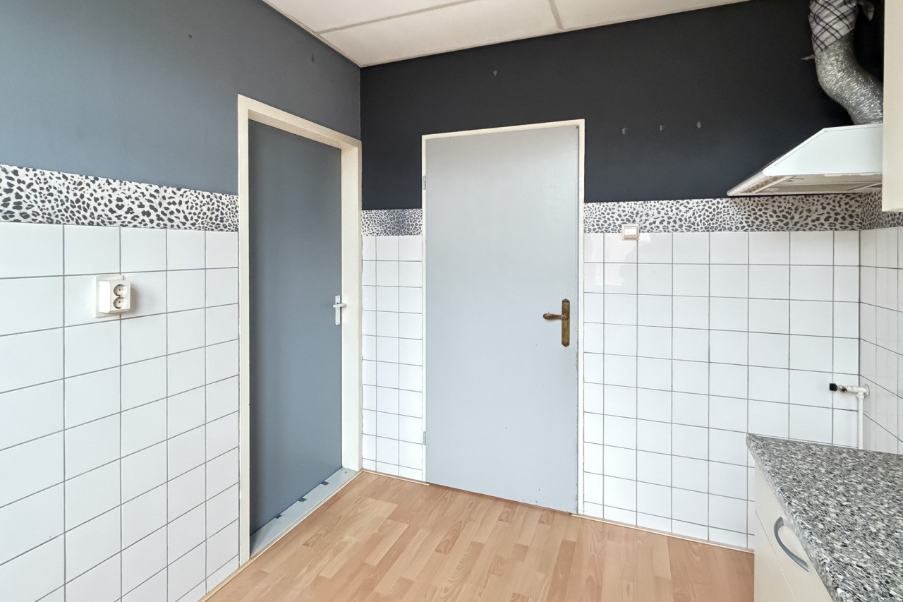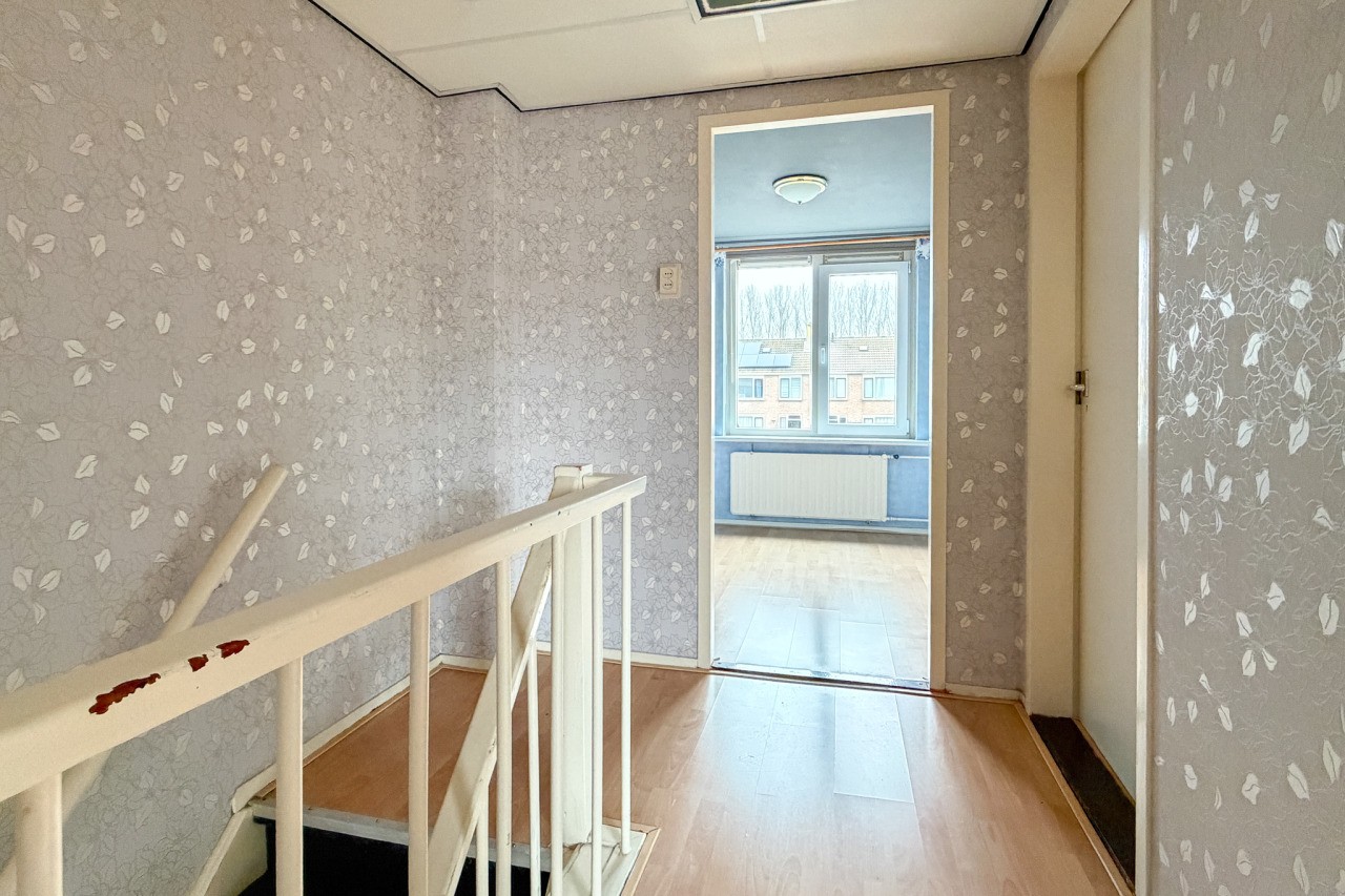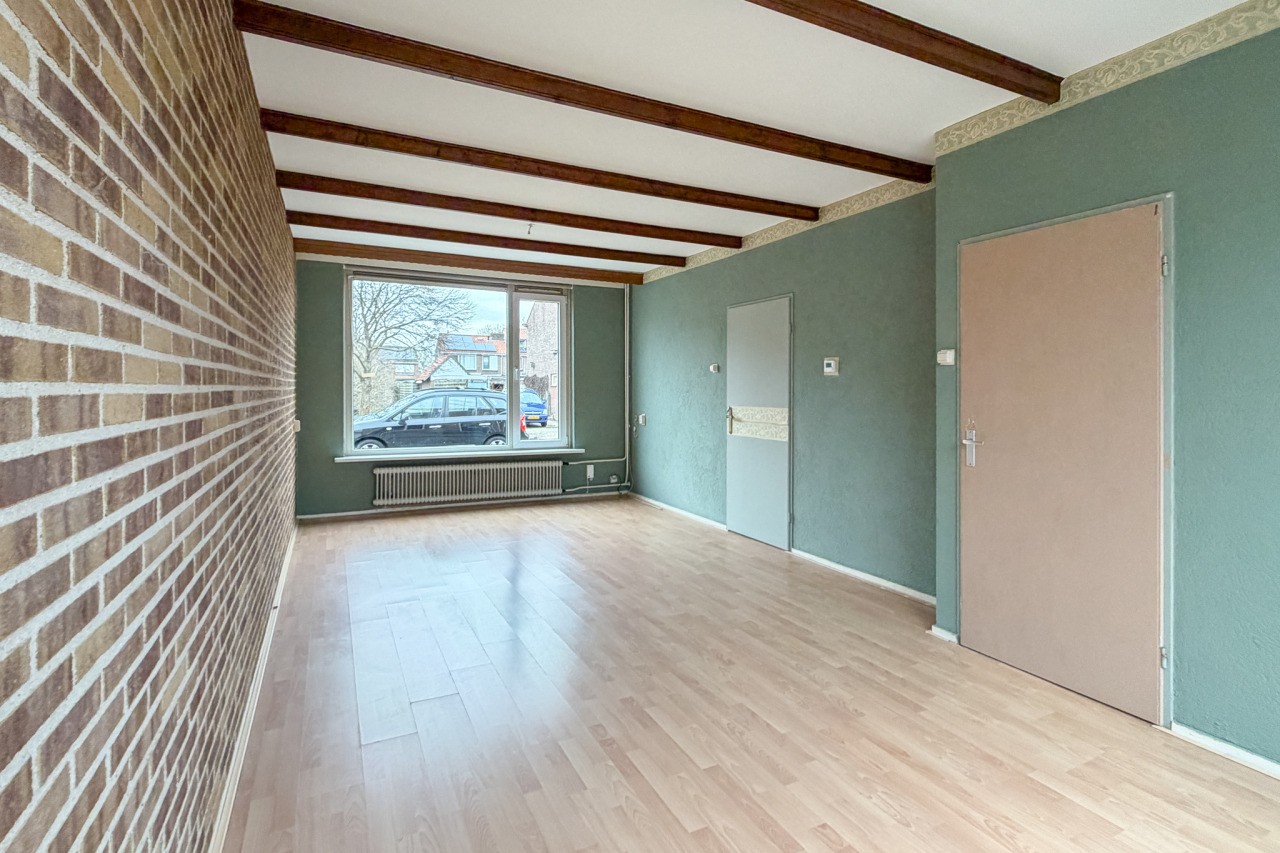 Je komt binnen in de hal met meterkast, trapopgang, trapkast en een toilet. De woonkamer is een echte doorzonwoonkamer: lekker licht, met een prettige indeling. De keuken is gesloten en voorzien van een eenvoudig keukenblok (zonder apparatuur).