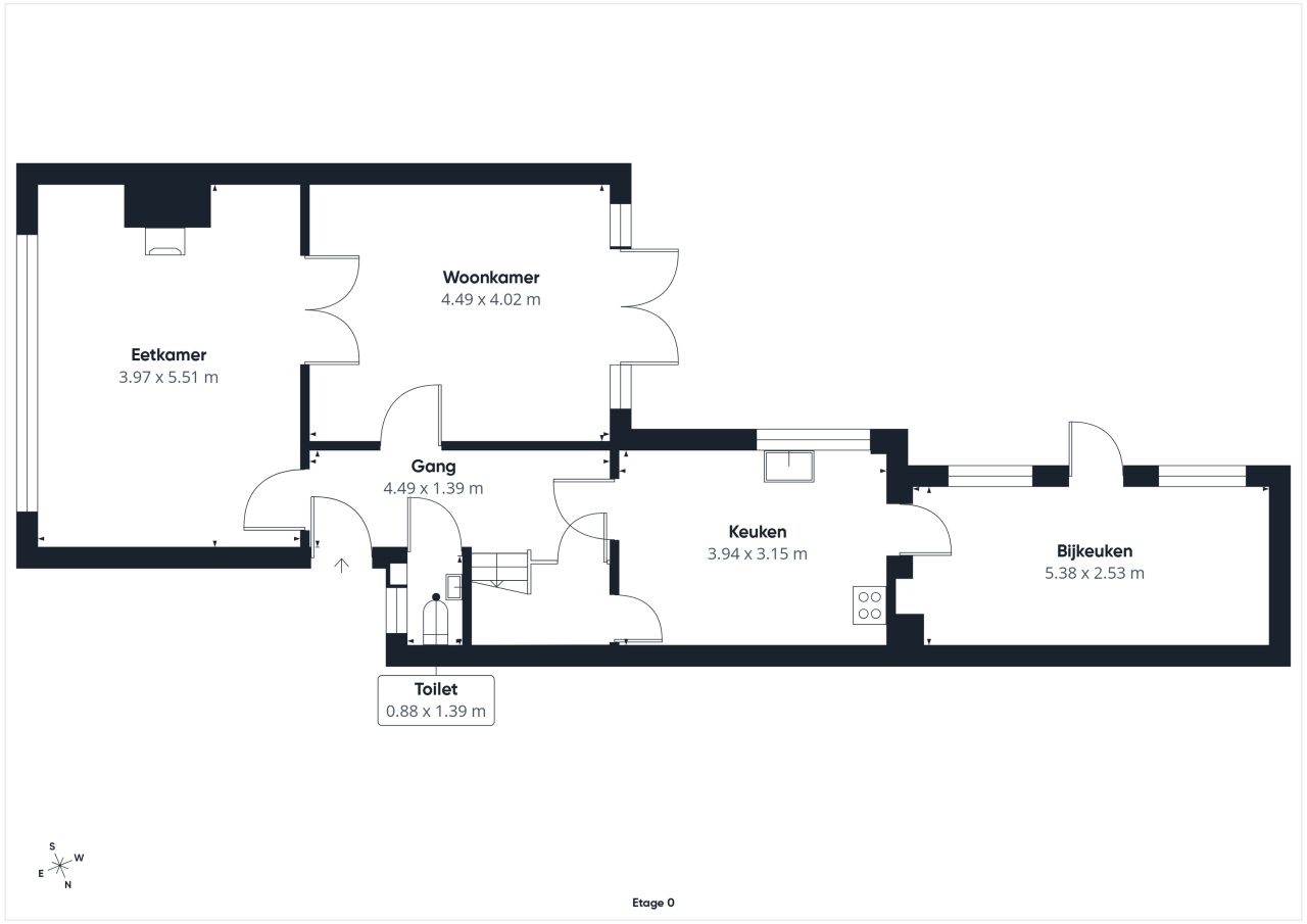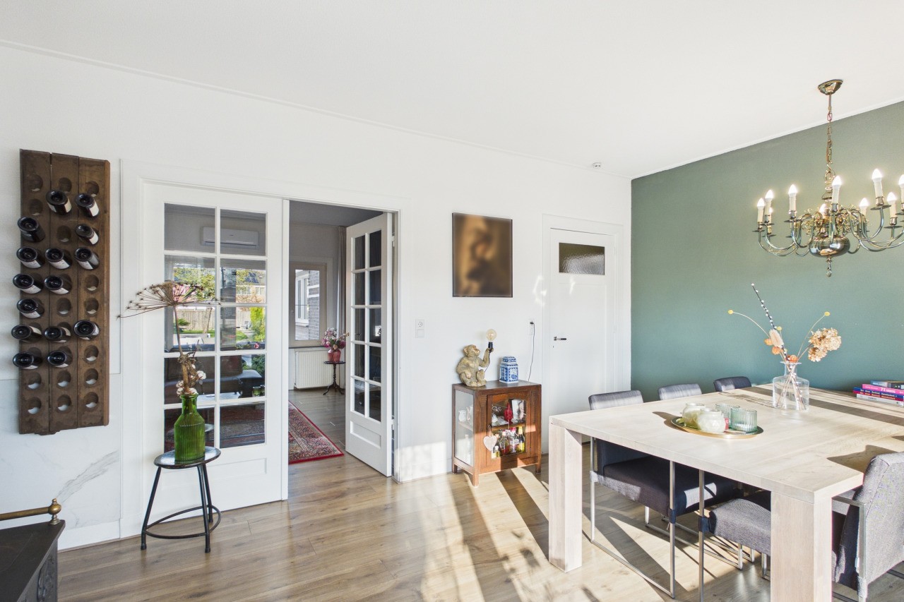 Wanneer je de woning binnenkomt, kom je in de hal die toegang biedt tot de eetkamer aan de voorzijde, de woonkamer aan de achterzijde, de keuken, het toilet met fonteintje, de trapopgang en de meterkast. De eetkamer ligt aan de voorzijde en biedt dankzij de karaktervolle kachel en de ensuite deuren een prettige sfeer en een mooie verbinding met de woonkamer. De woonkamer bevindt zich aan de achterzijde van de woning en kijkt uit op de tuin, met openslaande tuindeuren en een airconditioner voor extra comfort. De keuken is ruim en voorzien van een vrijstaand gasfornuis, inbouwapparatuur en een natuurstenen werkblad. Vanuit de keuken heb je toegang tot de kelder loop je door naar de bijkeuken, met extra opbergruimte, de cv-opstelling en witgoedaansluitingen, en directe toegang tot de tuin.